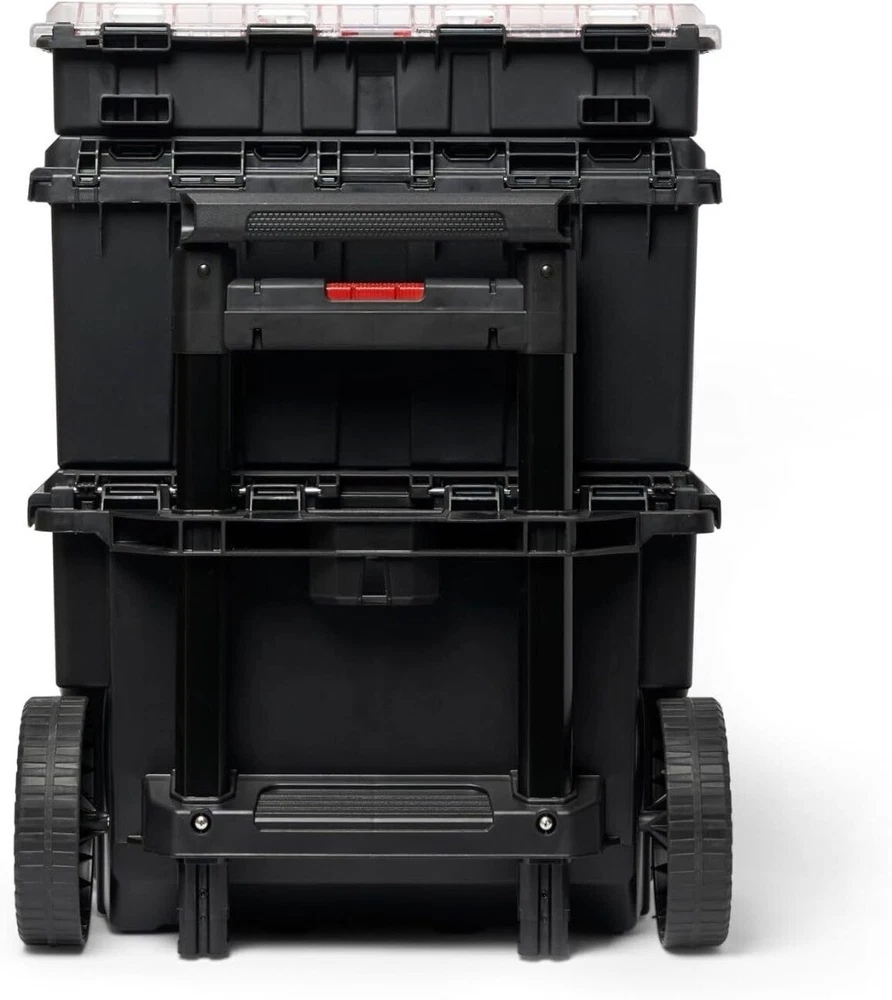Package: 1X Keter Stack-n-Roll Modular Tools Organizer for Garage Storage and DIY, 3 Piece Resin Rolling Tool Box System for Small Parts Description: Durable and Lightweight construction makes this modular tool storage system perfect for home use The system is an interlocking, customizable, mobile workshop that includes a cart, toolbox and organizer Snaps close wit audible latches that confirm your contents are secure Metal telescopic handle with 7” durable wheels and side grips for maximum mobility to your next project or jobsite Features a transparent polycarbonate lid on the small parts organizer