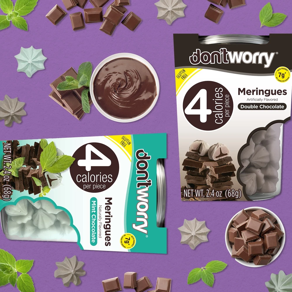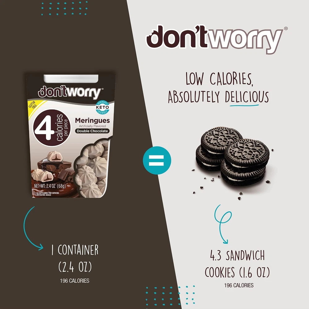 Made to delight you Our light meringue cookies have been carefully crafted for your absolute enjoyment! Whether for a quick break at home, work, or studying; to enjoy with a good friend or loved ; entertaining guests; or just some quality me-time snuggled up on the bed or couch—our products are intended to make life sweeter (but not too sweet!) 😁 Our deeper purpose and mission Truth be told, since conception, Don'tWorry has aimed to help tackle of the world´s biggest public challenges—alarming rates of obesity and diabetes. So we set out to do the impossible: Create delightful snacks that also happen to be good for you and your weight and fitness goals. But frankly, we want you to love our products simply for the great taste and quality!🍦 Founded in 2009 by a small, entrepreneurial team with a BIG dream, we started making our delightful meringues by hand in a neighbor's tiny kitchen. In the years since we are certain your taste buds and waistline will agree we have perfected recipes that will surprisingly amaze and delight you!🌟Product Description KETO-FRIENDLY SNACKING: Enjoy the meringue cookies, made with miraculously only 4 calories. Gluten-free, low-fat, and low sugar cookies are enhanced with natural sugar alternatives for guilt-free indulgence in every bite! GUILT-FREE INDULGENCE: Our chocolate cookies with no refined sugar or trans fat. Delicious and healthy, they’re perfect as low-sugar desserts & treats. Enjoy guilt-free snacking with cookies! PROMOTE A HEALTHY LIFE: Our purpose is to help tackle the global challenge of alarming rates of weight-related issues. That's why we set out to achieve this by creating low sugar snacks that support your fitness goals. GLUTEN FREE: We cracked the code after 600+ formulations, we perfected the balance of indulgence with minimal calories and guilt. Since 2009, we've crafted keto friendly snacks with passion and love. Try them and let us know if you agree! FLAVORS VARIETY: Our weight loss snacks comes in a variety of delicious flavors from Cookies & Cream, Double Chocolate, Strawberry, Vanilla, Hazelnut, Mint, to more. If you're looking for something different, try our delicious Quinoa Bites!
