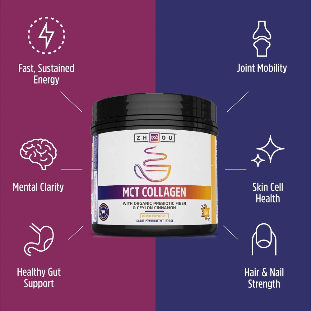 Sometimes those Monday morning vibes follow you around regardless of what day It is, so we created the perfect blend of MCT and collagen to help you shake that feeling. There are four different types of MCTs: C6, C8, C10, and C12. C8 is the good stuff, and we've got lots of it. Plus, we've packed our powder with type 1 and type 3 collagen to get you those vital proteins for hair, skin and nails bone and joint health. Mct collagen is immediate and robust source of energy and proteins, perfect for kickstarting your day No matter how you like to play Product Details Brand Zhou Nutrition Manufacturer Zhou Nutrition Product Type Collagen Nutritional Supplements Mpn 1890190 Supersonic Energy Source: MCTs can be absorbed quickly and digested rapidly, leaving you with a burst of clean and immediate energy to your body and mind, giving you a full-body jumpstart Beauty Protein Powerhouse: Collagen is a super protein that helps support your hair, skin, nails, bones, and joints. Our pure, sustainably sourced, hormone-free collagen hydrolysate can help to replenish lost collagen and support cell turnover Brain Boosting Blend: Your brain requires a constant stream of energy and proteins. Because MCTs are equipped with blood-boosting powers and collagen is a protein powerhouse, your brain is furnished with the energy it needs to be functioning at its finest Hearty Gut Health Hero: Our formula is designed to have a potent form of antifungal MCTs, meaning it can help get rid of the bad bacteria in your gut. And with the Ceylon Cinnamon that we added to the mix, you get a bonus antioxidant boost What Sets Us Apart? At Zhou, we use only the highest-quality ingredients in a facility following GMP (good manufacturing practices). Plus, we test everything at our lab in Utah, so you can be confident that you're fueling your body with the very best