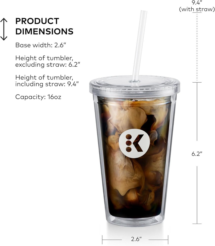 Keurig Iced Tumbler, 16oz Capacity 16oz, Transparent Product Details Brand: Keurig Color: Transparent Special Feature: Insulated Style: Modern Recommended Uses For Product: Home Occasion: everyday Included Components: Cup, reusable straw, cap Specific Uses For Product: Cold Drinks Shape: Round Pattern: Solid Product Care Instructions: Dishwasher Safe Age Range (Description): Adult Material Feature: Insulated Reusability: Reusable Unit Count: 1.0 Count Product Dimensions: 2.7"W x 6.2"H Material Type Free: Solid Materials Free Number of Items: 1 Package Type: standard packaging Finish Type: Glossy Manufacturer: Keurig Size: 16oz Item Weight: 8.1 ounces Item model number: 5000374474 MaterialCapacity: Plastic16 Fluid Ounces 16-oz capacity Double-walled, BPA-free plastic construction Top-rack dishwasher safe Fits under all Keurig brewers Dimensions: Height (excluding straw): 6.2” Height (with straw included): 9.4” Base Width: 2.6” Enjoy a delicious and refreshing drink anytime, anywhere with the Keurig® Iced Beverage Cup. It is ideal for making cold coffee and tea with your Keurig® brewer. Just fill this specially designed tumbler with ice, brew your favorite K-Cup® pod on the 6oz or 8oz size and enjoy! The double-walled, BPA-free tumbler keeps your beverage cool down to the last thirst-quenching sip. It comes with a reusable straw, and can hold up to 16oz, making it suitable for a range of different beverages. The cup and straw are top-rack dishwasher safe for easy cleaning after use.