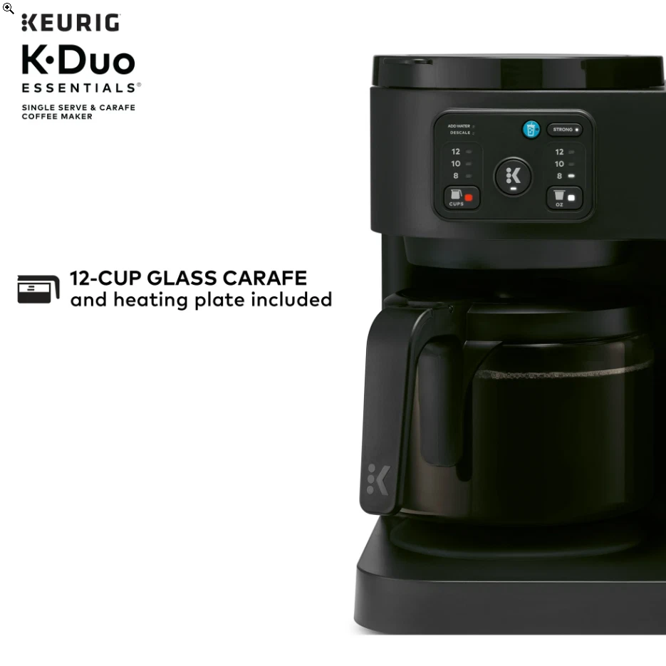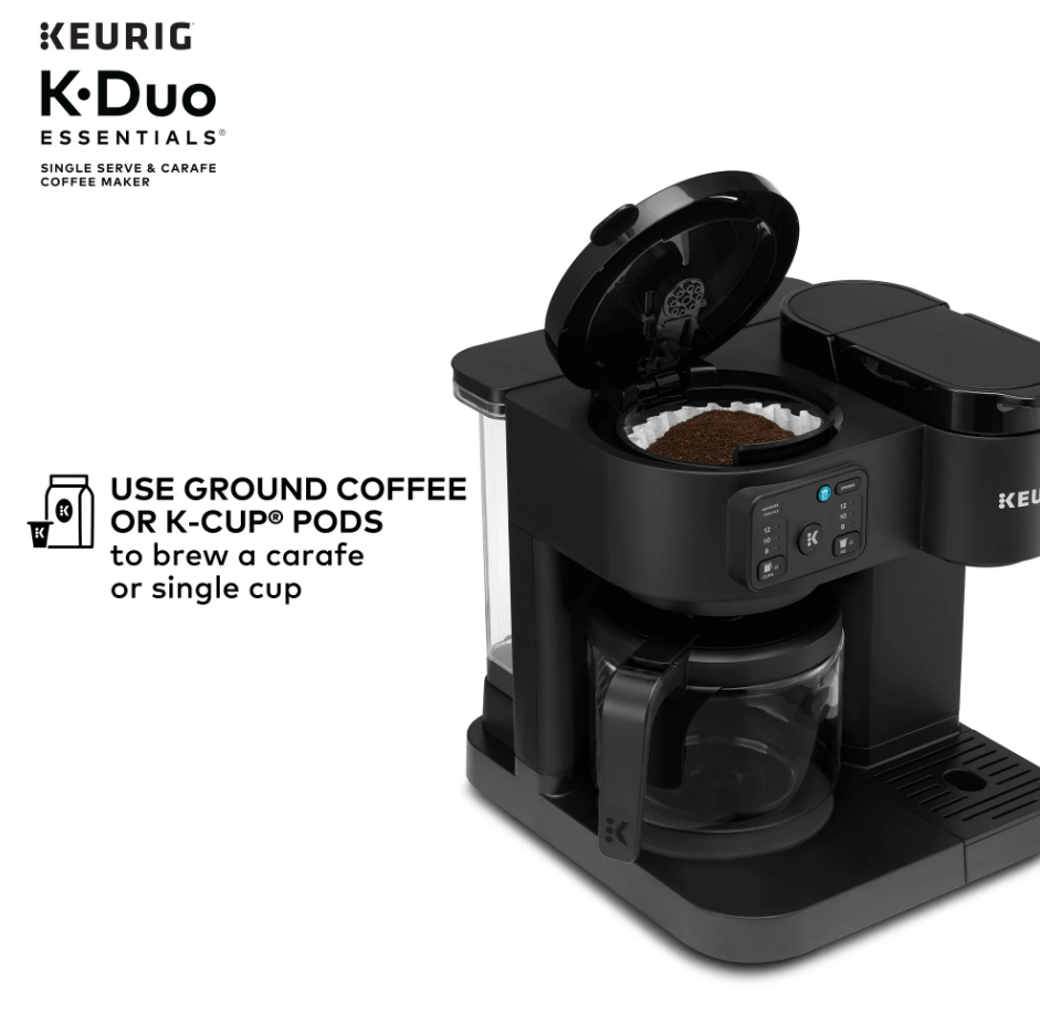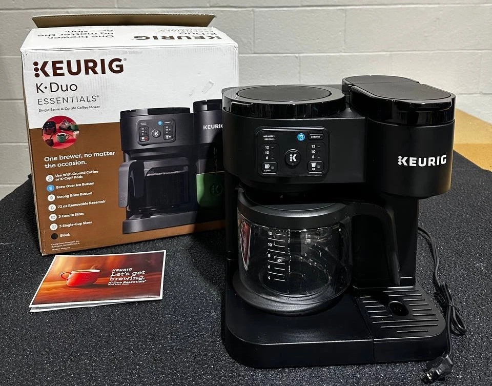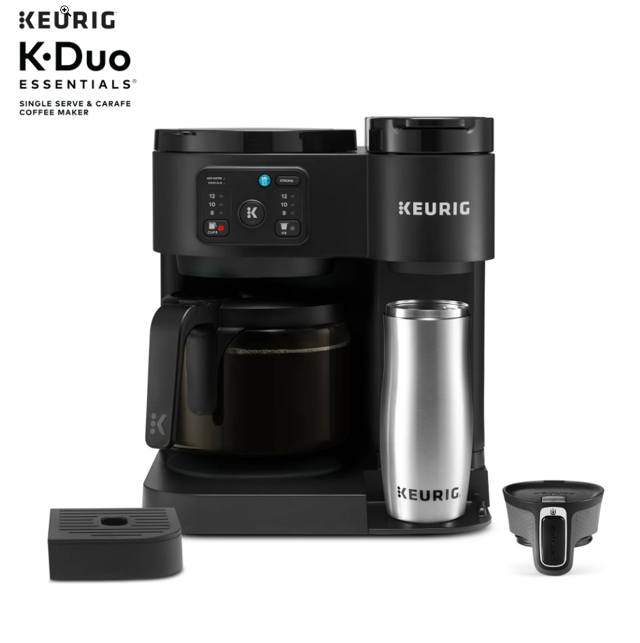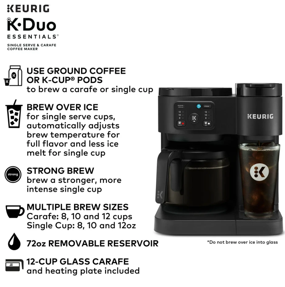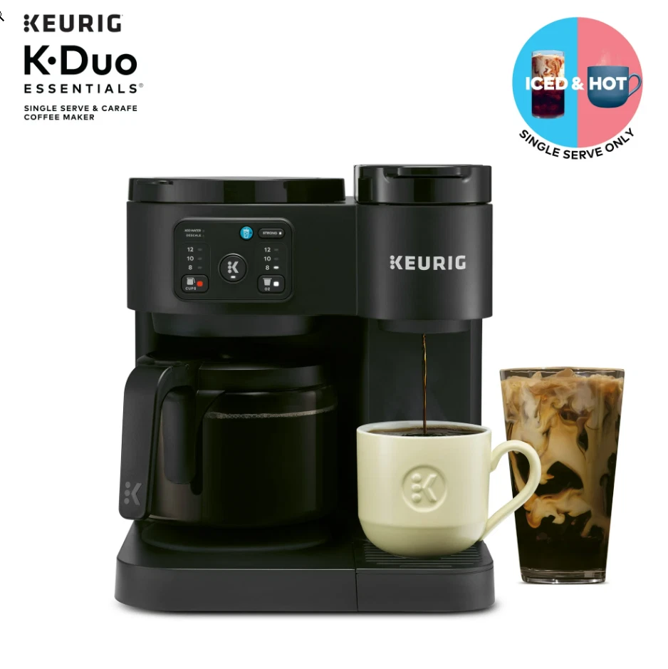 Keurig K-Duo Essentials Hot & Iced Single-Serve + Carafe Coffee Maker – Black The Keurig K-Duo Essentials is the perfect all-in-one coffee solution for any home. Brew a single cup with your favorite K-Cup pod or make a full 12-cup carafe for family and guests — all with one compact machine. This model also features Hot & Iced brewing , letting you enjoy both hot coffee and refreshing iced drinks with ease. Key Features ✔ 2-in-1 Coffee Maker (Single-Serve + Carafe) Brew a single cup using any K-Cup pod Brew a full 12-cup carafe using ground coffee Perfect for both individual use and families ✔ Hot & Iced Brewing Brew hot coffee Brew over ice without watering down the flavor ✔ Large 72 oz Shared Water Reservoir One reservoir for both single-serve and carafe Fewer refills, more convenience ✔ Three Brew Sizes Single-serve: 8 oz, 10 oz, 12 oz Carafe: multiple brew amounts ✔ Programmable Carafe Auto-Brew Set it the night before Coffee ready exactly when you need it ✔ Pause & Pour Temporarily pause mid-brew Pour a cup before the cycle finishes ✔ Strong Brew Compatibility Works with all standard Keurig K-Cup pods Works with ground coffee for carafe brewing Specifications Model: Keurig K-Duo Essentials Color: Black Functions: Single-serve, carafe, hot & iced Carafe Size: 12 cups (glass carafe) Water Reservoir: 72 oz Pod Type: K-Cup pods (single-serve) Dimensions: Countertop-friendly compact footprint Power: 120V standard plug What’s Included Keurig K-Duo Essentials Coffee Maker 12-cup glass carafe Removable water reservoir Drip tray