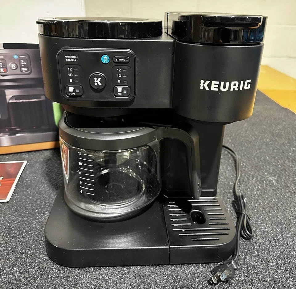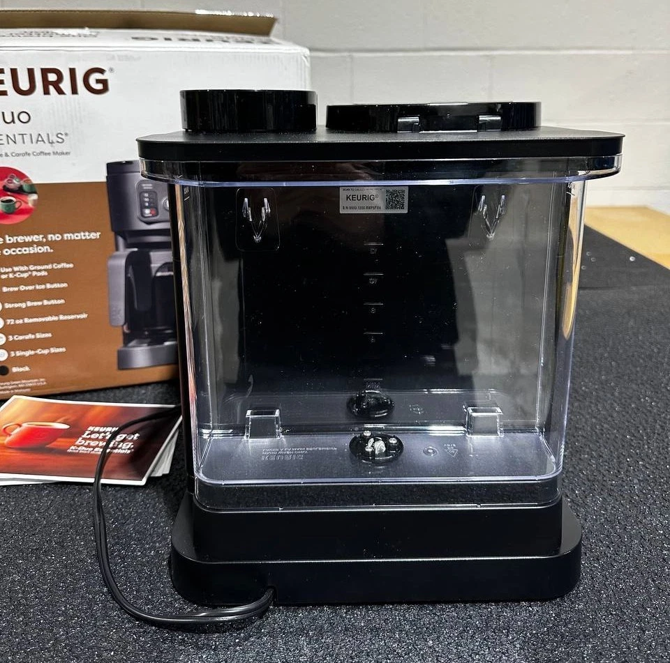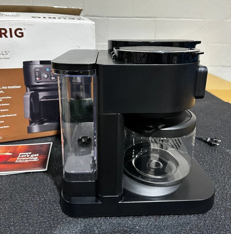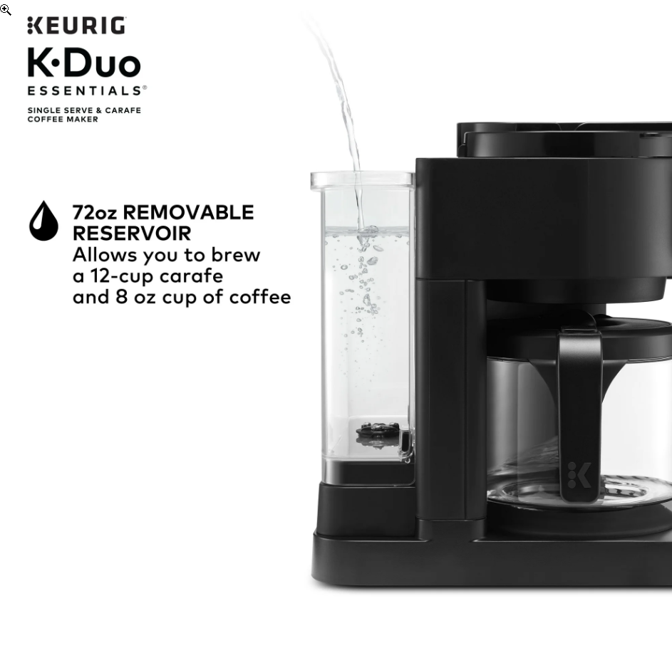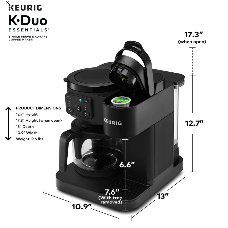 Keurig K-Duo Essentials Hot & Iced Single-Serve + Carafe Coffee Maker – Black The Keurig K-Duo Essentials is the perfect all-in-one coffee solution for any home. Brew a single cup with your favorite K-Cup pod or make a full 12-cup carafe for family and guests — all with one compact machine. This model also features Hot & Iced brewing , letting you enjoy both hot coffee and refreshing iced drinks with ease. Key Features ✔ 2-in-1 Coffee Maker (Single-Serve + Carafe) Brew a single cup using any K-Cup pod Brew a full 12-cup carafe using ground coffee Perfect for both individual use and families ✔ Hot & Iced Brewing Brew hot coffee Brew over ice without watering down the flavor ✔ Large 72 oz Shared Water Reservoir One reservoir for both single-serve and carafe Fewer refills, more convenience ✔ Three Brew Sizes Single-serve: 8 oz, 10 oz, 12 oz Carafe: multiple brew amounts ✔ Programmable Carafe Auto-Brew Set it the night before Coffee ready exactly when you need it ✔ Pause & Pour Temporarily pause mid-brew Pour a cup before the cycle finishes ✔ Strong Brew Compatibility Works with all standard Keurig K-Cup pods Works with ground coffee for carafe brewing Specifications Model: Keurig K-Duo Essentials Color: Black Functions: Single-serve, carafe, hot & iced Carafe Size: 12 cups (glass carafe) Water Reservoir: 72 oz Pod Type: K-Cup pods (single-serve) Dimensions: Countertop-friendly compact footprint Power: 120V standard plug What’s Included Keurig K-Duo Essentials Coffee Maker 12-cup glass carafe Removable water reservoir Drip tray