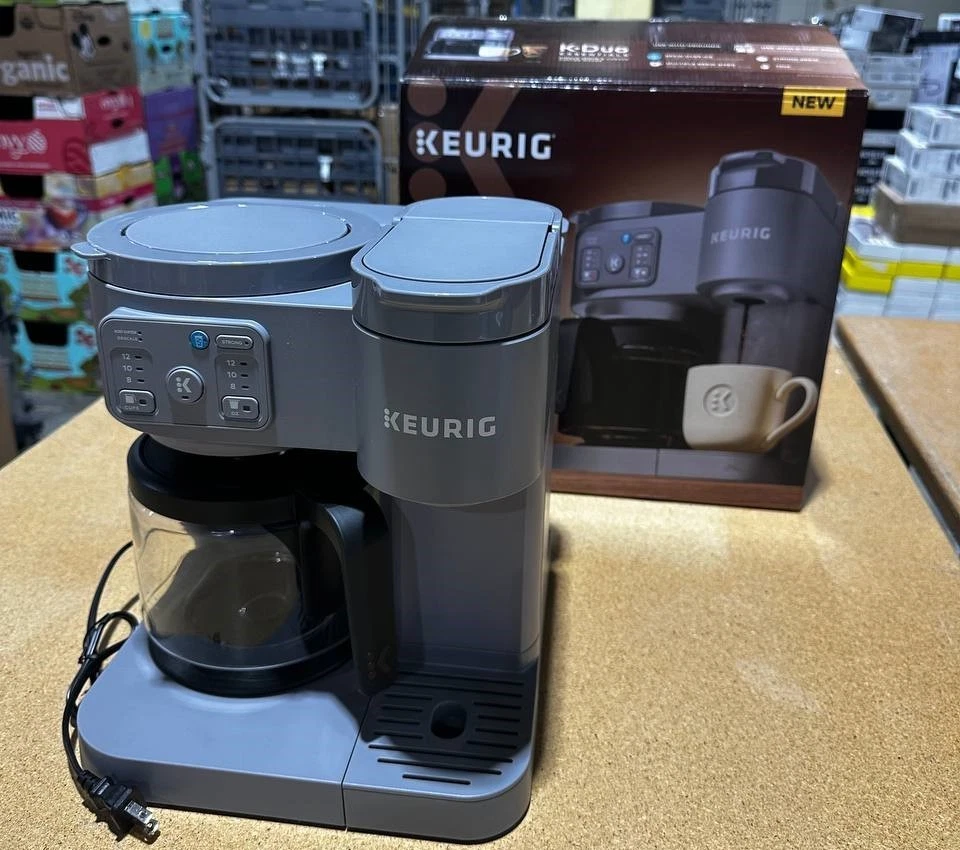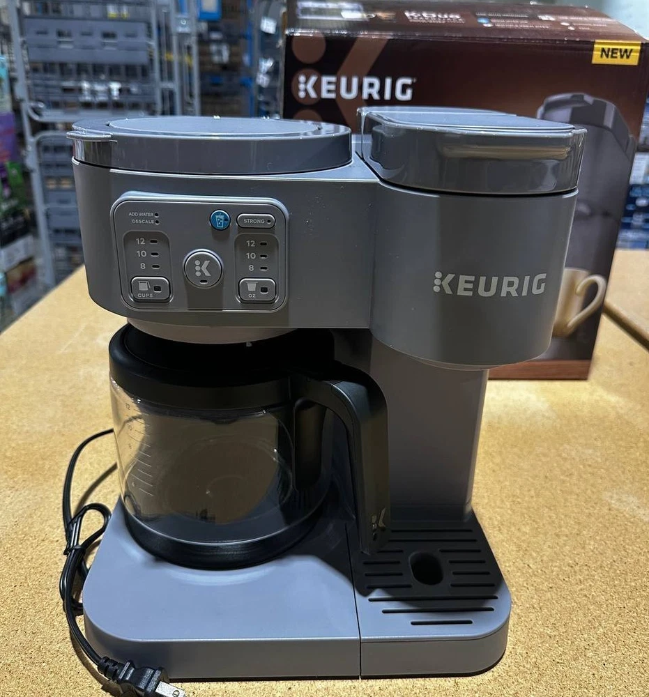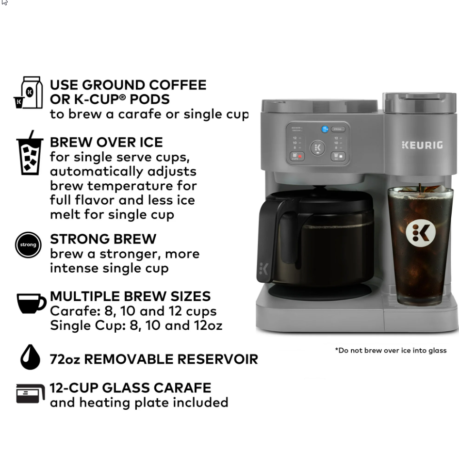 Keurig K-Duo Essentials Hot & Iced Single-Serve + Carafe Coffee Maker – Moonlight Grey The Keurig K-Duo Essentials is the perfect all-in-one coffee solution for any home. Brew a single cup with your favorite K-Cup pod or make a full 12-cup carafe for family and guests — all with one compact machine. This model also features Hot & Iced brewing , letting you enjoy both hot coffee and refreshing iced drinks with ease. Key Features ✔ 2-in-1 Coffee Maker (Single-Serve + Carafe) Brew a single cup using any K-Cup pod Brew a full 12-cup carafe using ground coffee Perfect for both individual use and families ✔ Hot & Iced Brewing Brew hot coffee Brew over ice without watering down the flavor ✔ Large 60 oz Shared Water Reservoir One reservoir for both single-serve and carafe Fewer refills, more convenience ✔ Three Brew Sizes Single-serve: 8 oz, 10 oz, 12 oz Carafe: multiple brew amounts ✔ Programmable Carafe Auto-Brew Set it the night before Coffee ready exactly when you need it ✔ Pause & Pour Temporarily pause mid-brew Pour a cup before the cycle finishes ✔ Strong Brew Compatibility Works with all standard Keurig K-Cup pods Works with ground coffee for carafe brewing Specifications Model: Keurig K-Duo Essentials Color: Moonlight Grey Functions: Single-serve, carafe, hot & iced Carafe Size: 12 cups (glass carafe) Water Reservoir: 60 oz Pod Type: K-Cup pods (single-serve) Dimensions: Countertop-friendly compact footprint Power: 120V standard plug What’s Included Keurig K-Duo Essentials Coffee Maker 12-cup glass carafe Removable water reservoir Drip tray