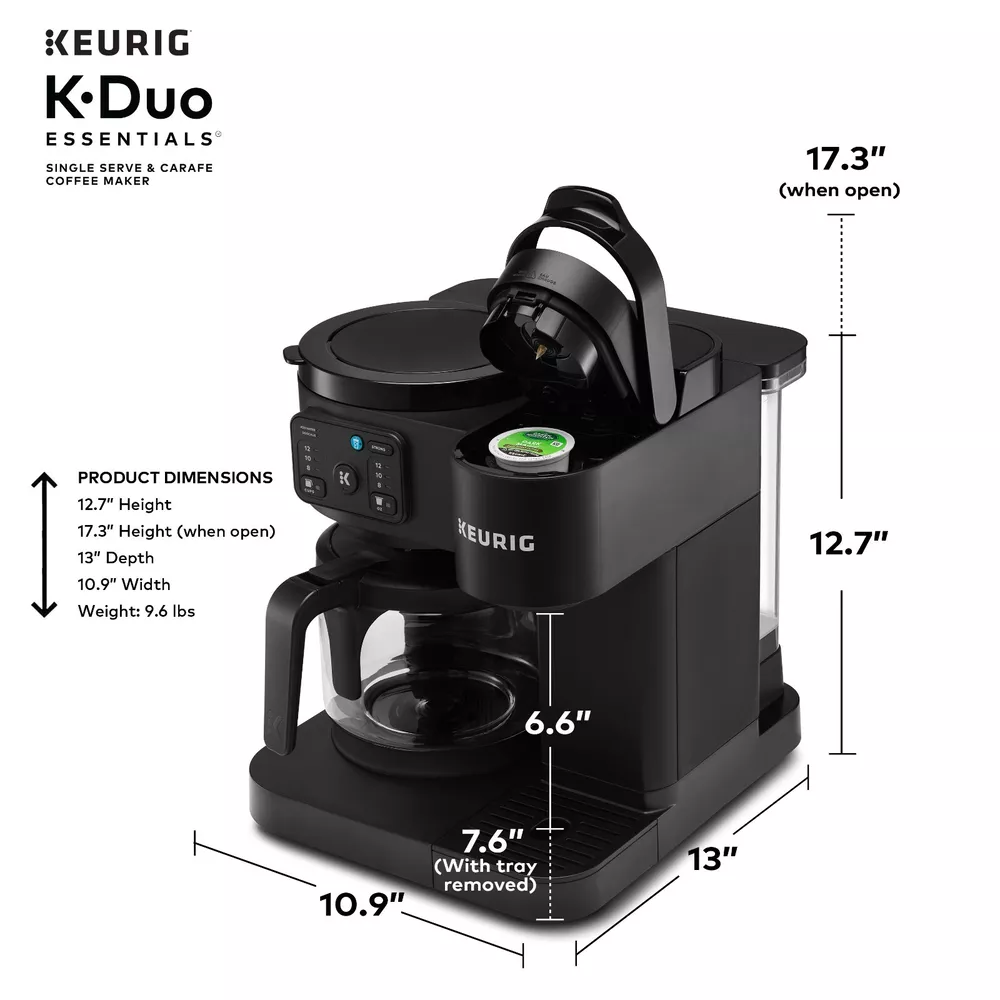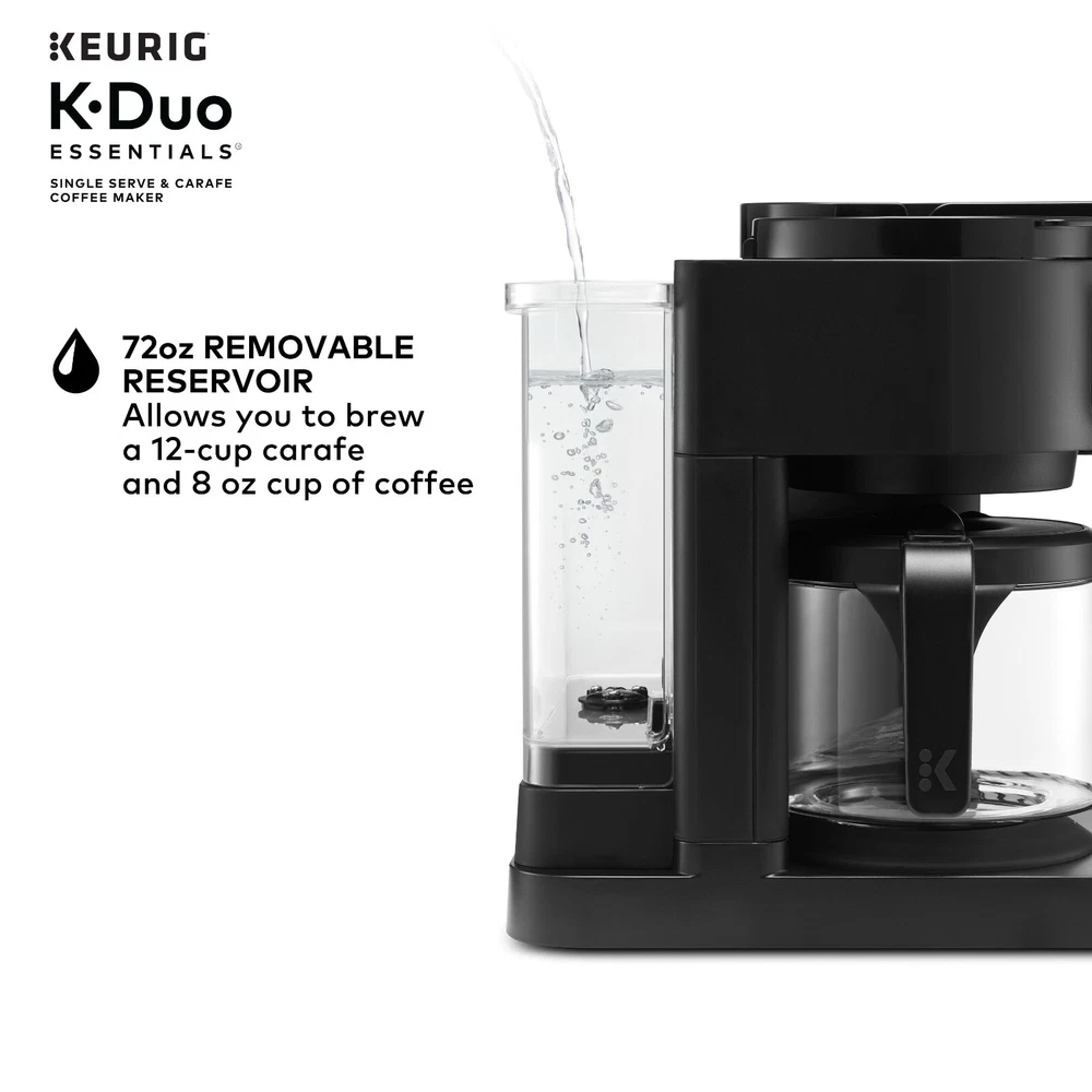 Product details The Keurig K-Duo Essentials Coffee Maker is the ideal brewer for any coffee occasion. It brews single cups using K-Cup pods AND full carafes of your favorite coffee grounds – all in one compact unit. It features a large 72 oz. removable water reservoir that feeds both sides of the brewer, which means faster, easier brewing with fewer refills. The single-cup side brews all your favorite K-Cup pod flavors in your choice of 8, 10, or 12-oz sizes. It offers the Brew Over Ice option for making refreshing iced coffees or teas, as well as the Strong Brew option, which makes a bolder, more intense flavor for your cup. On the carafe side, you can drip-brew full pots of your favorite grounds in 8, 10, or 12-cup sizes. It features a glass carafe and heating plate for keeping your coffee hot, as well as the Pause & Pour feature which allows you to pause mid-brew to serve fresh, hot coffee. Whether you’re serving a crowd or serving yourself, whether you need a pot of regular and a cup of decaf…no matter the situation, the K-Duo Essentials is the perfect solution. Available exclusively at Walmart. BREW BY THE CUP OR CARAFE: Brews both K-cup® pods and coffee grounds. ONE 72 OZ RESERVOIR: The extra-large 72 oz removable reservoir is shared by both sides for fast, convenient brewing with fewer refills. MULTIPLE BREW SIZES: Brew 8, 10, or 12-oz single cups or 8, 10, or 12-cup carafes. BREW OVER ICE: Adjusts temperature for maximum flavor and less ice melt for iced coffees and teas. STRONG BREW: Brews a stronger, more intense flavored cup. 12-CUP GLASS CARAFE: Included with brewer, along with heating plate to keep fresh coffee hot. PAUSE & POUR: Automatically pause carafe brewing mid-brew so you can serve fresh hot coffee, then return the carafe and continue the brew. COMPACT DESIGN: The versatility of two kinds of brewers in one space-saving unit.