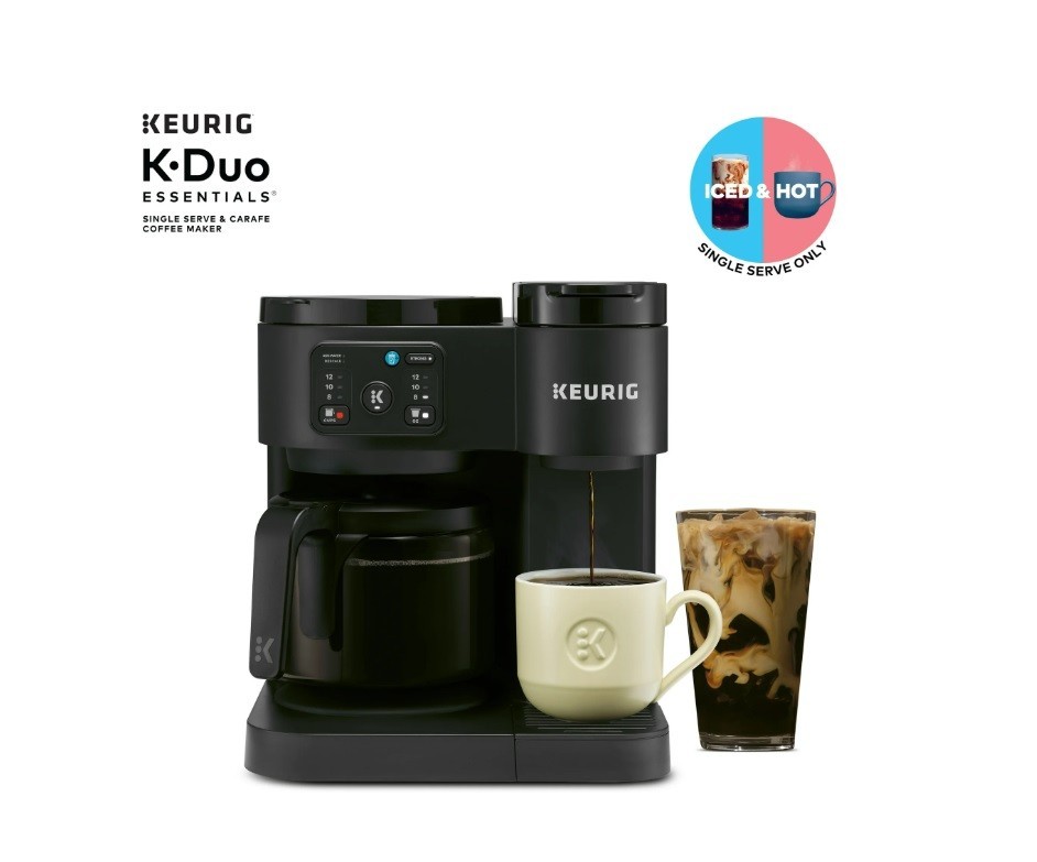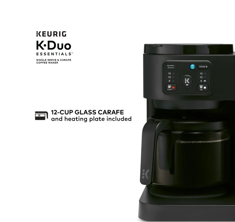 Product details The Keurig K-Duo Essentials Coffee Maker is the ideal brewer for any coffee occasion. It brews single cups using K-Cup pods AND full carafes of your favorite coffee grounds – all in one compact unit. It features a large 72 oz. removable water reservoir that feeds both sides of the brewer, which means faster, easier brewing with fewer refills. The single-cup side brews all your favorite K-Cup pod flavors in your choice of 8, 10, or 12-oz sizes. It offers the Brew Over Ice option for making refreshing iced coffees or teas, as well as the Strong Brew option, which makes a bolder, more intense flavor for your cup. On the carafe side, you can drip-brew full pots of your favorite grounds in 8, 10, or 12-cup sizes. It features a glass carafe and heating plate for keeping your coffee hot, as well as the Pause & Pour feature which allows you to pause mid-brew to serve fresh, hot coffee. Whether you’re serving a crowd or serving yourself, whether you need a pot of regular and a cup of decaf…no matter the situation, the K-Duo Essentials is the perfect solution. Available exclusively at Walmart. BREW BY THE CUP OR CARAFE: Brews both K-cup® pods and coffee grounds. ONE 72 OZ RESERVOIR: The extra-large 72 oz removable reservoir is shared by both sides for fast, convenient brewing with fewer refills. MULTIPLE BREW SIZES: Brew 8, 10, or 12-oz single cups or 8, 10, or 12-cup carafes. BREW OVER ICE: Adjusts temperature for maximum flavor and less ice melt for iced coffees and teas. STRONG BREW: Brews a stronger, more intense flavored cup. 12-CUP GLASS CARAFE: Included with brewer, along with heating plate to keep fresh coffee hot. PAUSE & POUR: Automatically pause carafe brewing mid-brew so you can serve fresh hot coffee, then return the carafe and continue the brew. COMPACT DESIGN: The versatility of two kinds of brewers in one space-saving unit.