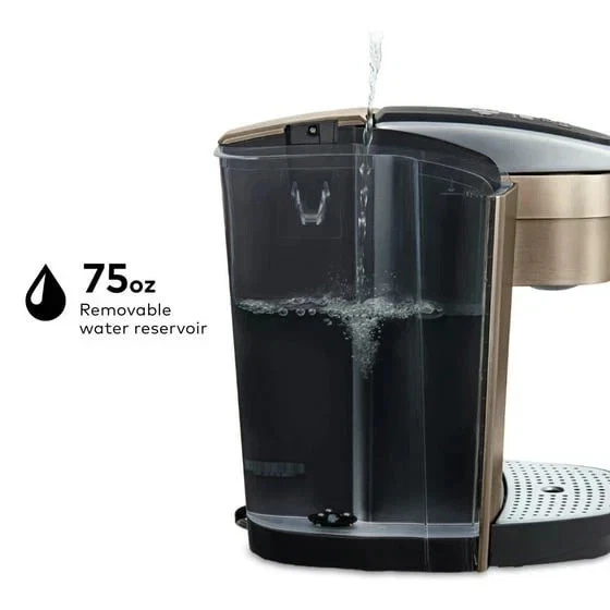 Key Features: BREWS MULTIPLE CUP SIZES: 4, 6, 8, 10, 12oz Enjoy the most popular cup sizes. STRONG BREW: Increases the strength and bold taste of your coffee’s flavor. BREW OVER ICE: Automatically adjusts brew temperature - starting hotter to help extract full flavor, then cooling down for less ice melt COFFEE IN NO TIME: Brews K-Cup® pods in under a minute. LARGE 75oz WATER RESERVOIR: Allows you to brew 8 cups before having to refill, saving you time and simplifying your morning routine. Removable reservoir makes refilling easy. HOT WATER ON DEMAND: Perfect for instant soups or oatmeal. SIMPLE BUTTON CONTROLS: Just insert a pod, select your desired cup size, and brew your perfect cup in under a minute. REMOVABLE DRIP TRAY: Accommodates travel mugs up to 7.2” tall and holds a full accidental brew for easy cleanup. BREWER MAINTENANCE REMINDER: Alerts you when it is time to descale your coffee maker. Descaling is an important process that removes built-up calcium deposits, ensuring the best-tasting brew possible. QUIET BREW TECHNOLOGY™: Minimizes noise when the coffee maker is in use. Brews coffee, tea, hot cocoa, specialty, and iced beverages. Compatible with the My K-Cup® Universal Reusable Coffee Filter, allowing you to brew with your own ground coffee. Programmable Features: Auto On: Set the exact time your coffee maker turns on in the morning. Auto Off: Set the time your coffee maker shuts off after your last brew for energy savings. Temperature: Adjust the brew temperature between 187° and 192°. High Altitude Setting: Ensures your coffee maker works properly at altitudes >5,000 feet. Specs: 13.1” High x 9.9” Wide x 12.7” Deep (16.5” High with bale open). Weighs 8.0 lbs.