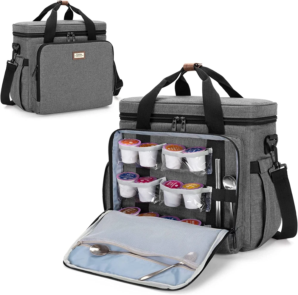 SNUG FIT: Main compartment dimensions 12.6" x 5.3" x 11", compatible with Keurig* K-Mini, K-Mini Plus, Nespresso* Essenza Mini, Pixie, Inissia and Citiz coffee machine. (Bag only, NOT includes coffee machine and accessories.) (*CURMIO carrying case is unrelated to brand referred.) FUNCTIONAL: 2 zipper pockets, 6 transparent pockets and 4 elastic loops for arranging coffee pods, creamers, sugar packets, spoons, stirrers, etc. Side pockets with elastic top for keeping travel mugs or water bottles. Back pocket for other things you need. DECENT DESIGN: Made of heavy duty nylon fabrics with quality aluminum foil lining and foam padding, well insulated and constructed, keeping items from dust, scratches, and bumps. Convenient to wipe down with soapy, damp cloth. 3 CARRYING OPTIONS: Portable top handle and detachable padded shoulder strap make it easy to transport your brewer. Back strap allows you to slide it over the luggage handle and free your hands. FITS FOR: CURMIO coffee maker carrying case would be a great companion to those who travel with coffee brewers. Ideal for camping, conventions, or vacations. Product Description CURMIO Coffee Maker Travel Bag (Bag only, NOT includes coffee machine and accessories.) Main compartment dimensions 12.6" x 5.3" x 11". Compatible with Keurig* K-Mini, K-Mini Plus, Nespresso* Essenza Mini, Pixie, Inissia and Citiz coffee machine. (*CURMIO carrying case is unrelated to brand referred.) Front compartment has 1 zipper pocket, 6 transparent pockets and 4 elastic loops for arranging coffee pods, creamers, sugar packets, spoons, stirrers, etc. Side pockets with elastic top for keeping travel mugs or water bottles. Back pocket with adhesive strap for other things you need. Portable top handle and detachable padded shoulder strap make it easy to transport your brewer. Back strap allows you to slide it over the luggage handle and free your hands.