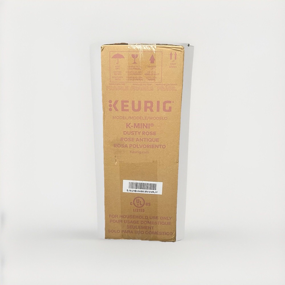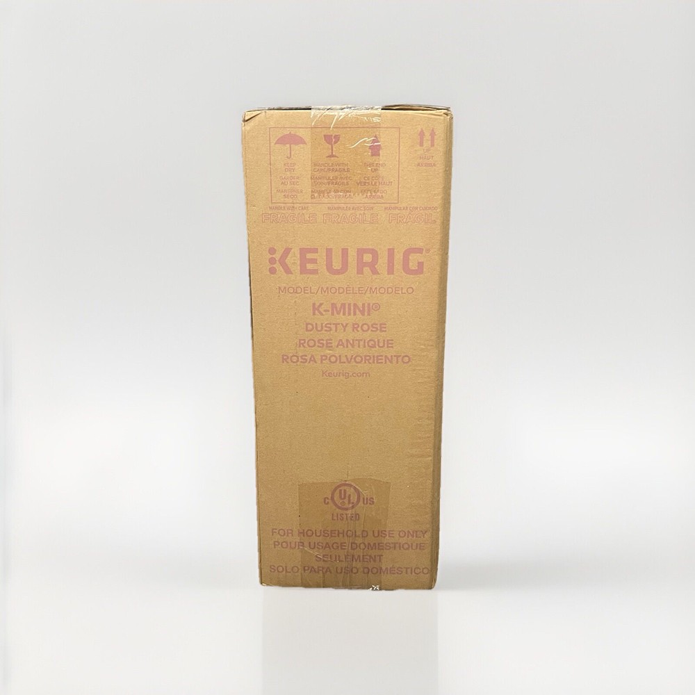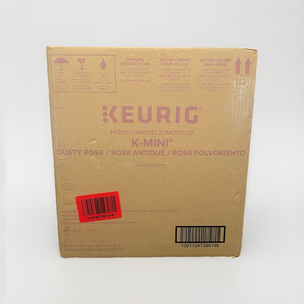 This Keurig K-Mini Single Serve Coffee Maker in Dusty Rose is brand new and ready to use. It features a water tank capacity of 6 fluid ounces and 12 fluid ounces, a power source of wall plug-in, and a coffee type of pod. The machine is compatible with K-Cup capsules and has a capsule/pod capacity of 1. In addition, this pod coffee machine has an auto shut-off feature and a built-in water filter. It also includes a user manual, water tank, and drip tray. The Keurig K-Mini Coffee Maker is made of plastic with a matte finish and weighs 4.6 pounds. It has a voltage of 120 and a power of 1500W. This unit type is a single serve and can make espresso and cappuccino.