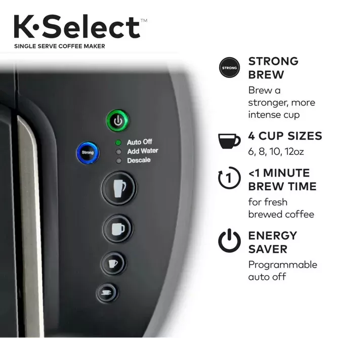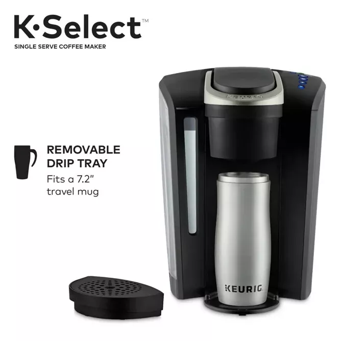 Keurig K-Select Single-Serve K-Cup Pod Coffee Maker - Matte Navy NEW BOX Key Features: • Strong Brew for a stronger, more intense cup • Brews 6, 8, 10, and 12 oz. sizes • 52-ounce removable side water reservoir • Programmable auto off • Removable drip tray accommodates travel mugs • Quiet Brew Technology™ Feature • Made from fingerprint resistant materials • Descale maintenance reminder • High altitude setting • Brews in under a minute • Compatible with the My K-Cup® Universal Reusable Coffee Filter Specs: • 12.5" High x 9.2" Wide x 11.6" Deep (17" high with bale open) • Accommodates travel mugs up to 7.4" tall • 7.4 lbs.