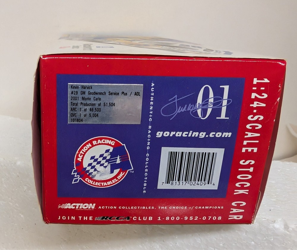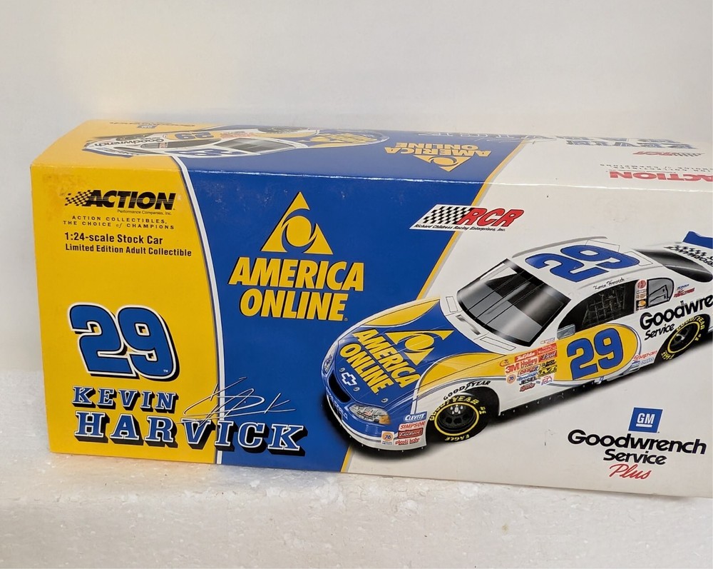 Recommended Age Range: Adult collectible Color: Multi-Color gtin13: 781317024094 Theme: AOL and Goodwrench Brand: Action Age Level: 17 Years & Up MPN: 101804 Material: Diecast Vehicle Make: Chevrolet Modified Item: No Vehicle Year: 2001 Features: Limited Edition, Unopened Box Model: Monte Carlo Driver: Kevin Harvick Country/Region of Manufacture: China Autographed: No UPC: 781317024094 Organization: NASCAR Vehicle Type: NASCAR Racecar Scale: 1:64 Character Family: NASCAR