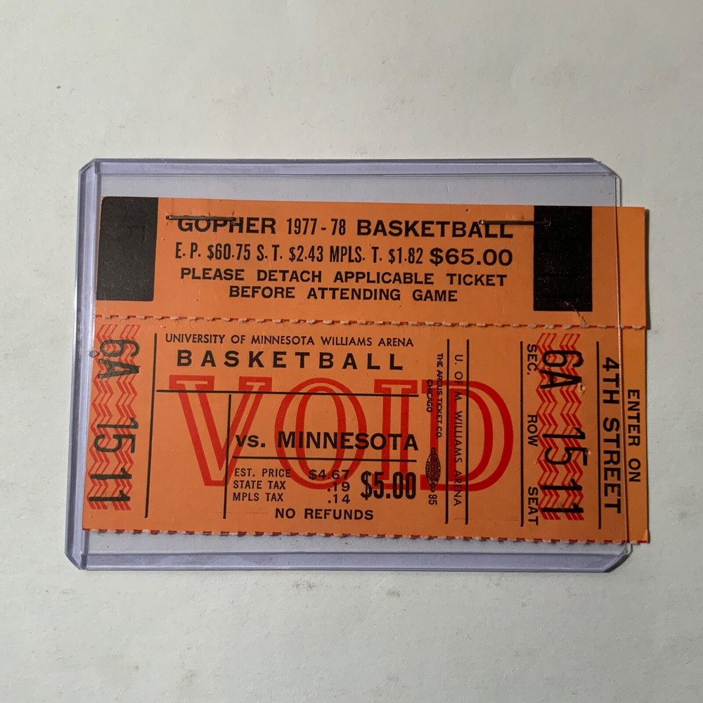 VG - EX. Nine ticket stubs + a season ticket holder booklet from the 1977-78 Minnesota Gophers basketball team that featured sophomore, and future NBA Hall of Famer, Kevin McHale (and Klay Thompson’s dad, Mychal Thompson): 1. 11/28/1977 - vs. Eastern Kentucky 2. 12/06/1977 - vs. #4 ranked Marquette (Butch Lee & Jerome Whitehead) 3. 12/19/1977 - vs. Nebraska 4. 01/14/1978 - vs. Ohio St. (Herb Williams) 5. 01/19/1978 - vs. Illinois (Eddie Johnson) 6. 02/02/1978 - vs. Iowa (Ronnie Lester) 7. 02/04/1978 - vs. Northwestern 8. 02/19/1978 - vs. #9 ranked Louisville (Darrell Griffith) 9. 03/02/1978 - vs. Michigan (Mike McGee) + booklet that once held full season tickets. + 8 X 10 of McHale showing defensive prowess.