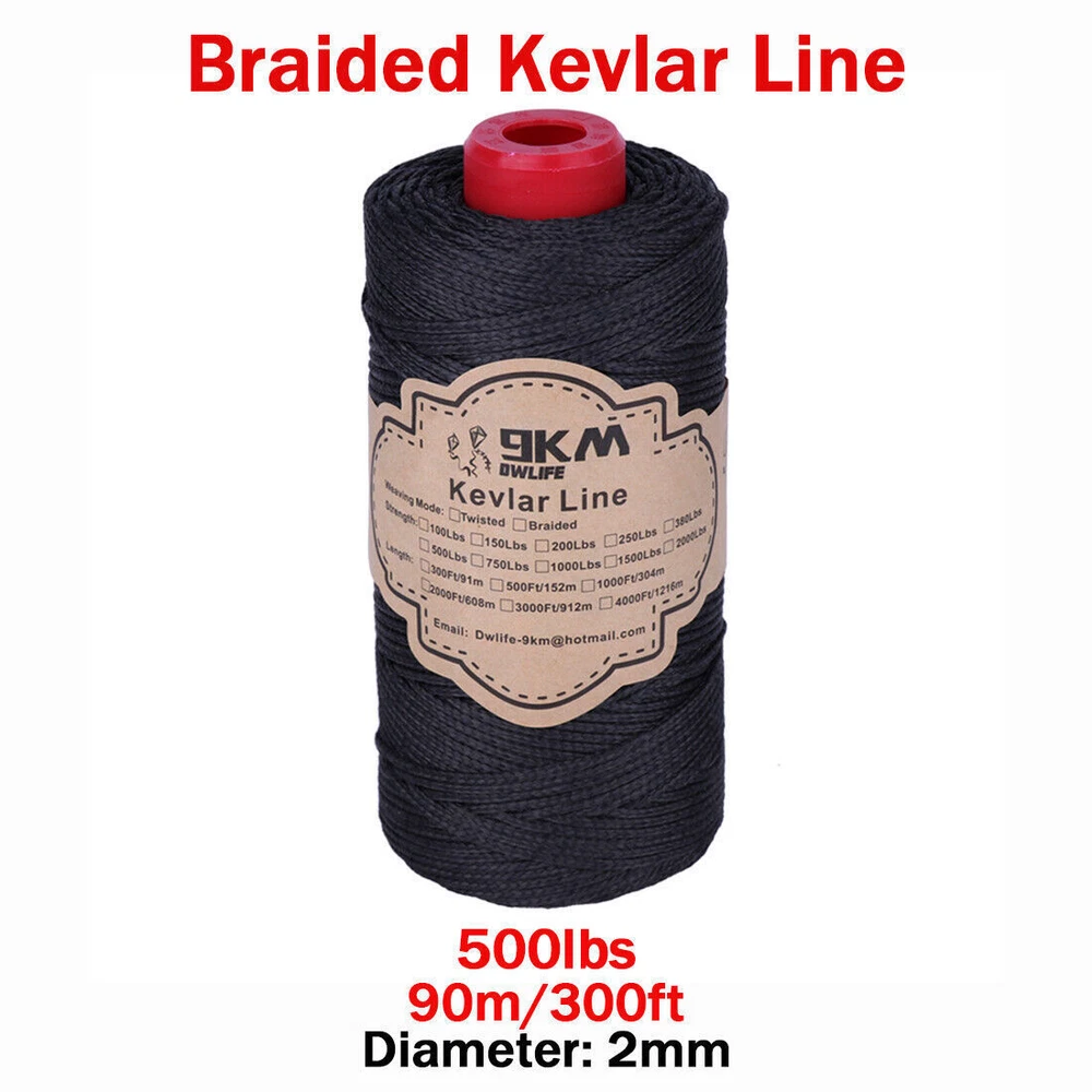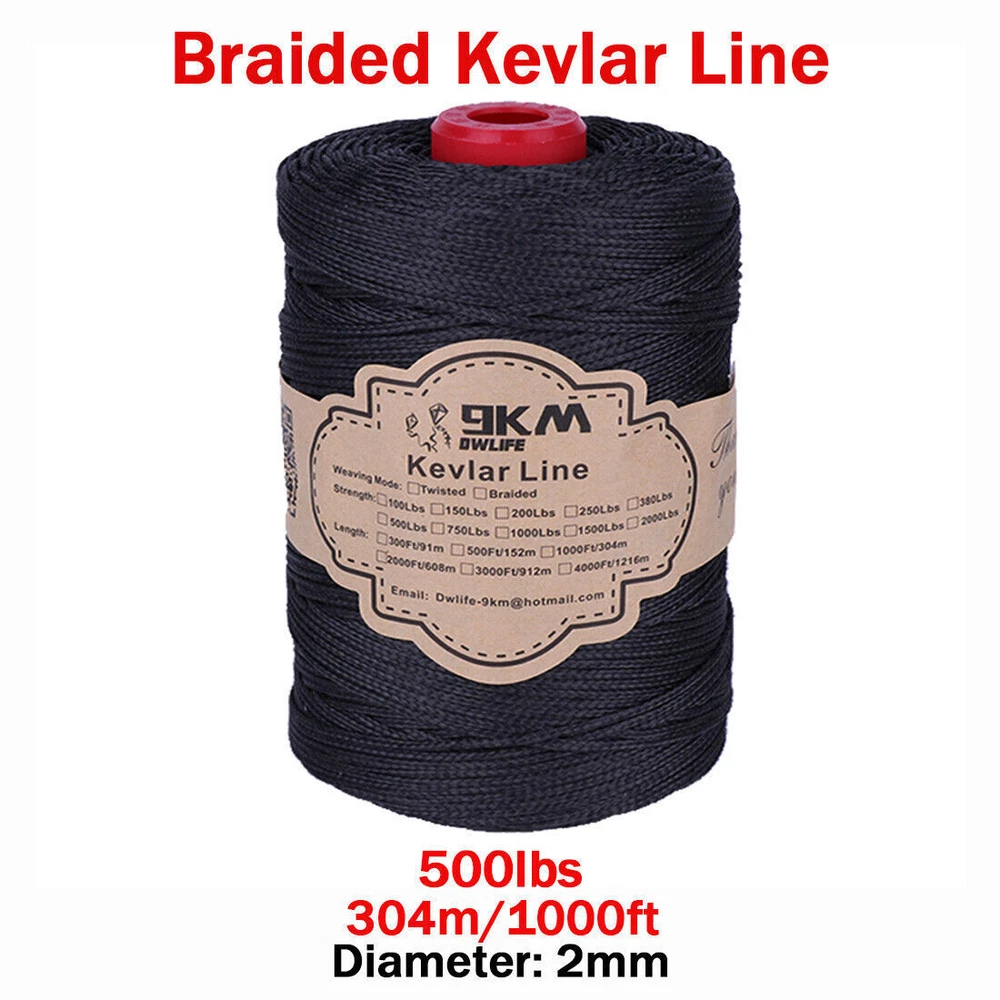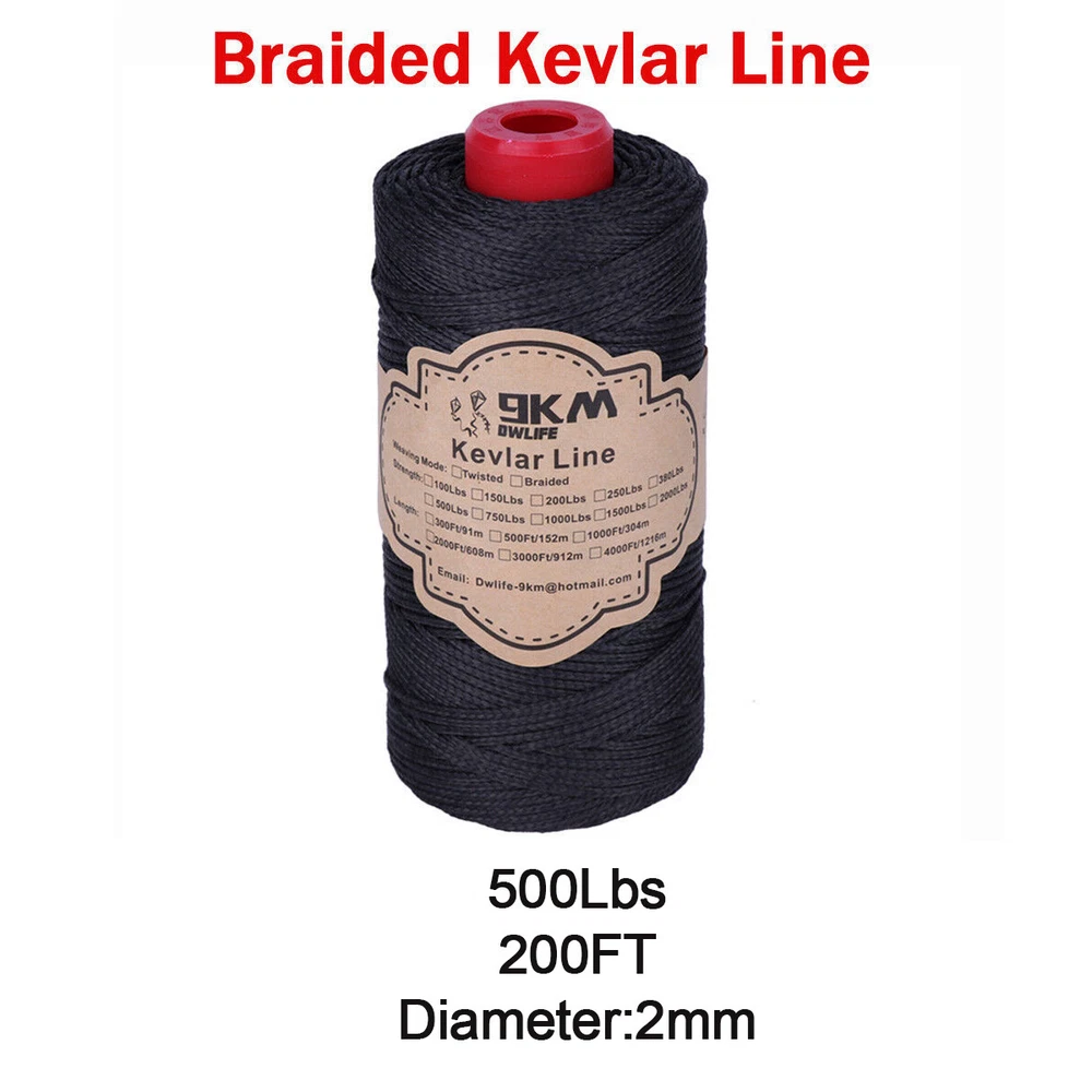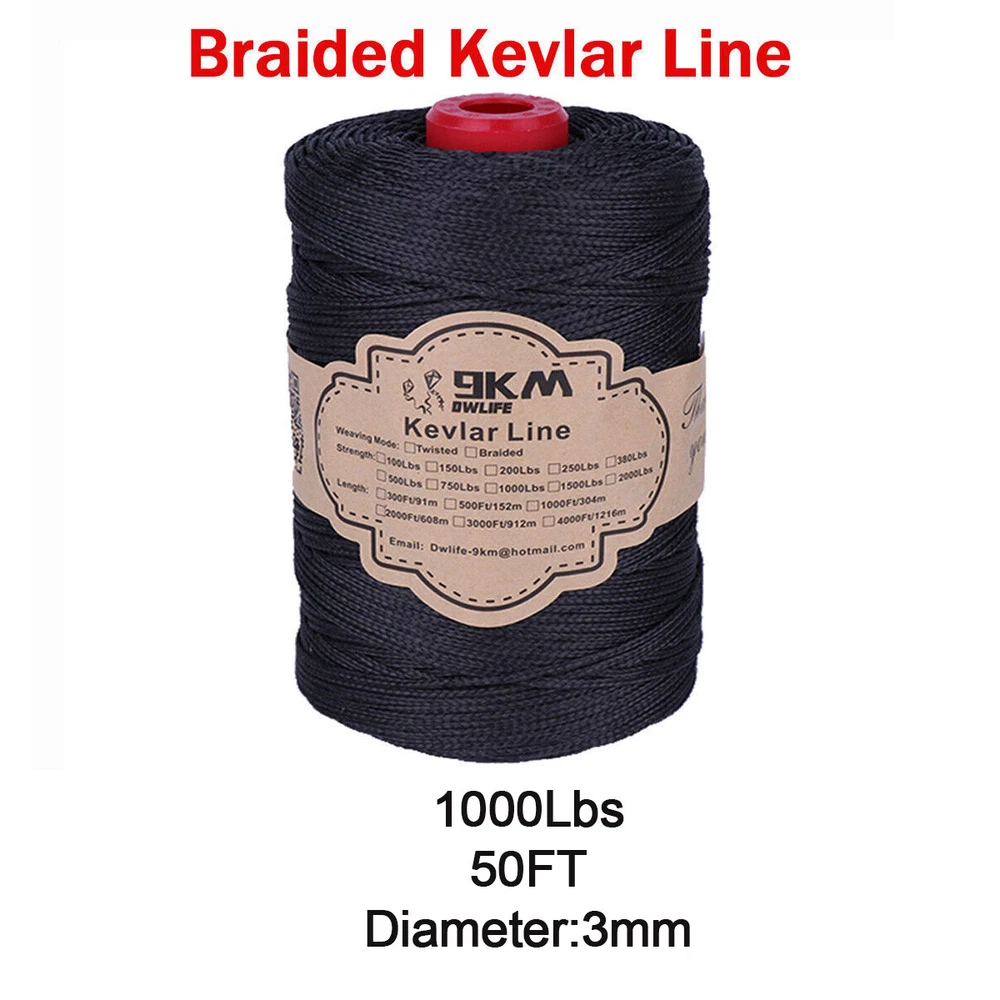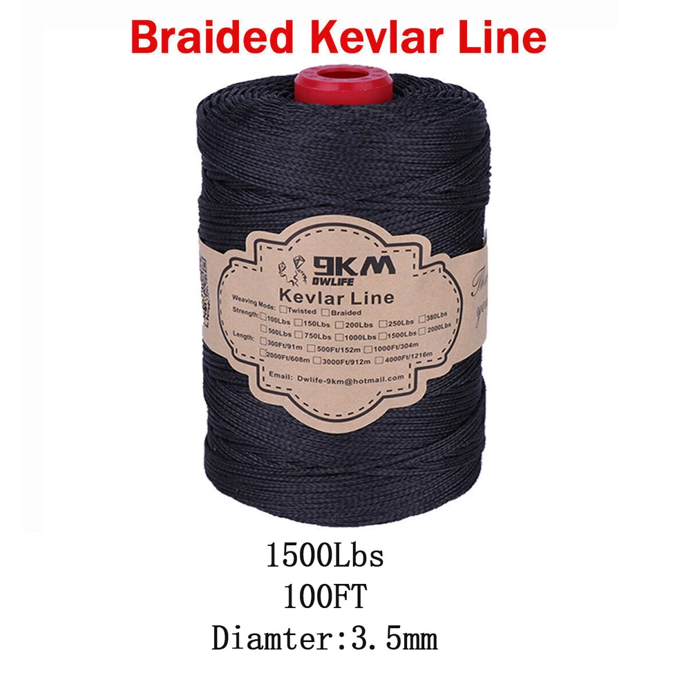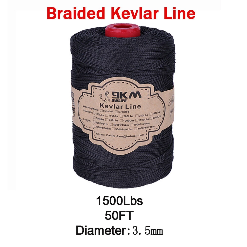 50lb-1500lb BRAIDED KEVLAR LINE Kevlar Fiber: The braided kevlar string is made of 100% kelvar fiber which is of high strength, high harness, high toughness and high abrasion resistance. Construction of Braid: Multi-strands interweaving process makes the string / cord much more durable, and it won't unravel like twisted line. Tough String: Every kevlar fiber is of high tensile strength. It exerts much higher strength in the same diameter. Cut-Resistance: One of the best advantages of Kevlar string. It helps avoid many unexpected string snaps which happen a lot in binding and fastening objects with sharp edges. Application: We provide strings from 100lb to 1500lb to meet different requirements, like, fishing, camping / hiking equipment fastening, usual outdoor line, plant support, gardening work, decoration hanging, creative projects, etc. Strength - Diameter - Weight per Meter: Approximately ±2~3% deviation exists in measurement. AMAZING Black COLOR! Great for outdoors Light weight, high tensile strength and small diameter make Kevlar cordage a great choice for below activities: Kites Flying String / Fishing Assist Line Large Model Rocket Cord / Speargun Shooting Line Camping Tarp Ridge Lines / Ultralight Backpacking Climbing / Rigging Sling / Survival Gear / Emergency Repair Cord Hiking Equipment Fastening / Tent Guy Lines Plant support / Arborist accessories Gardening Work / Decoration Hanging / Mason's line / Creative projects, etc. Notice:Around 90% of original strength is the safety working load. It‘s testing result from line factory.