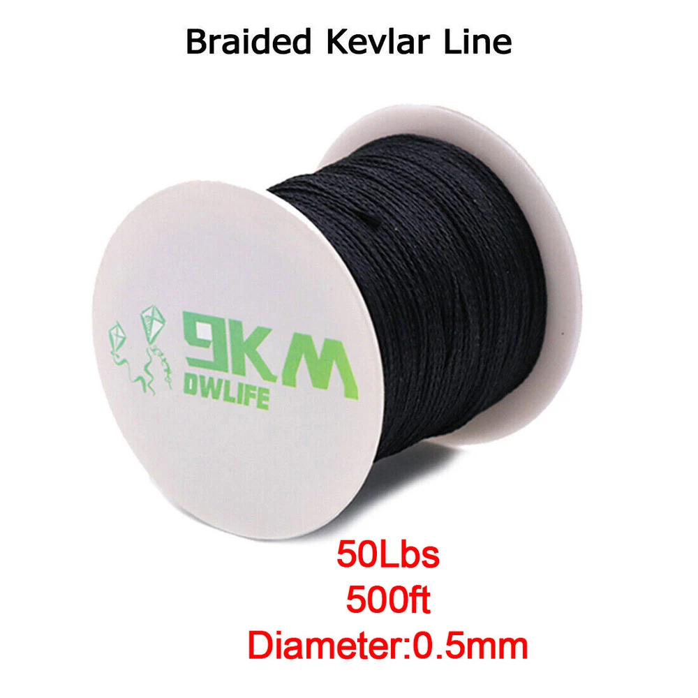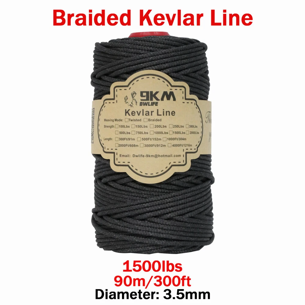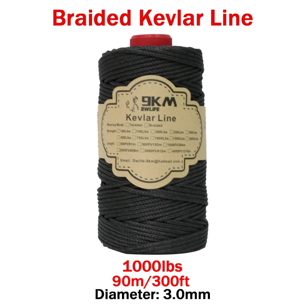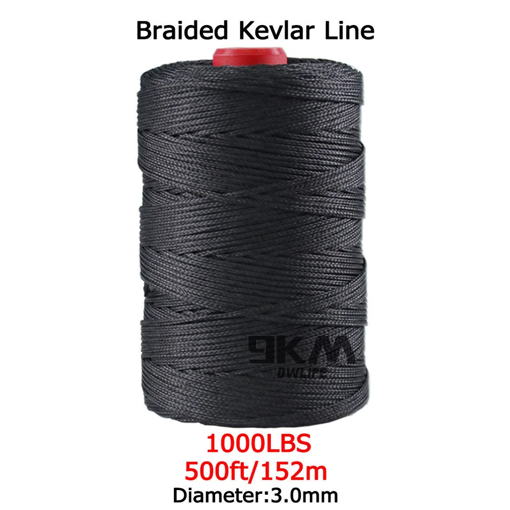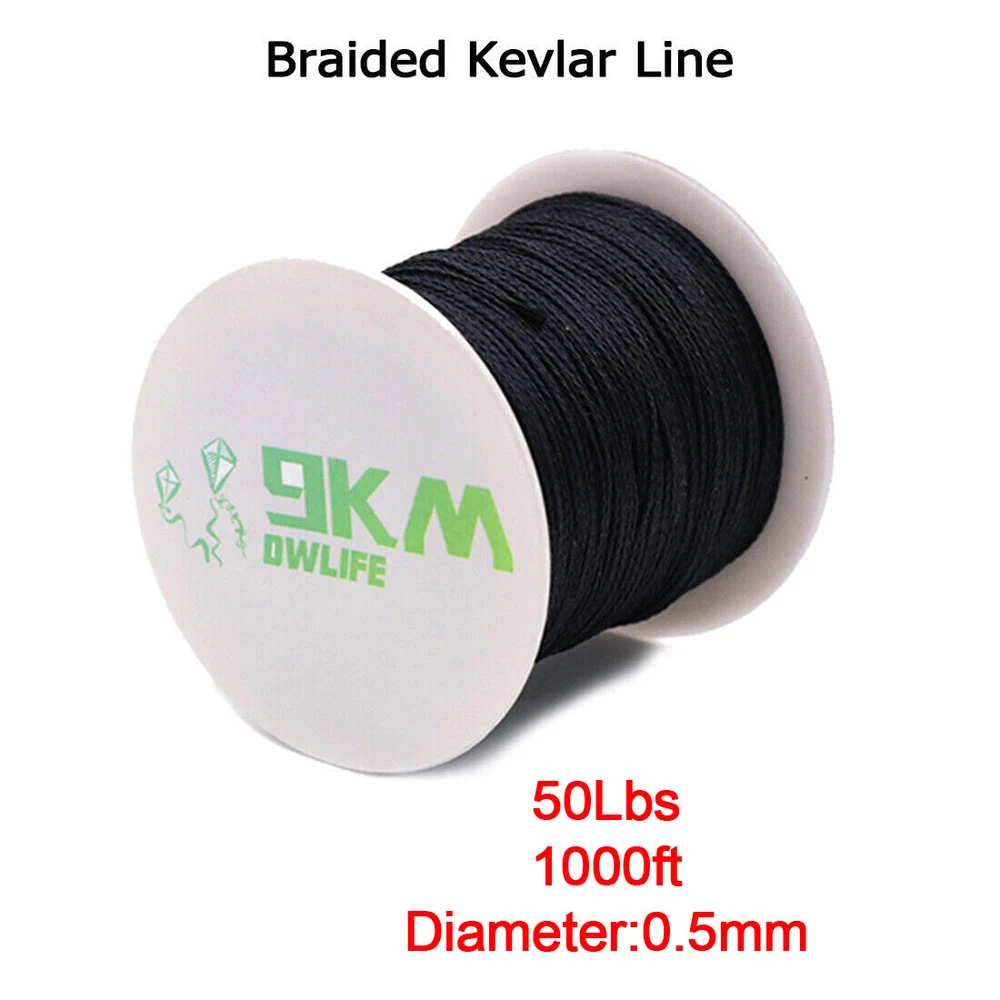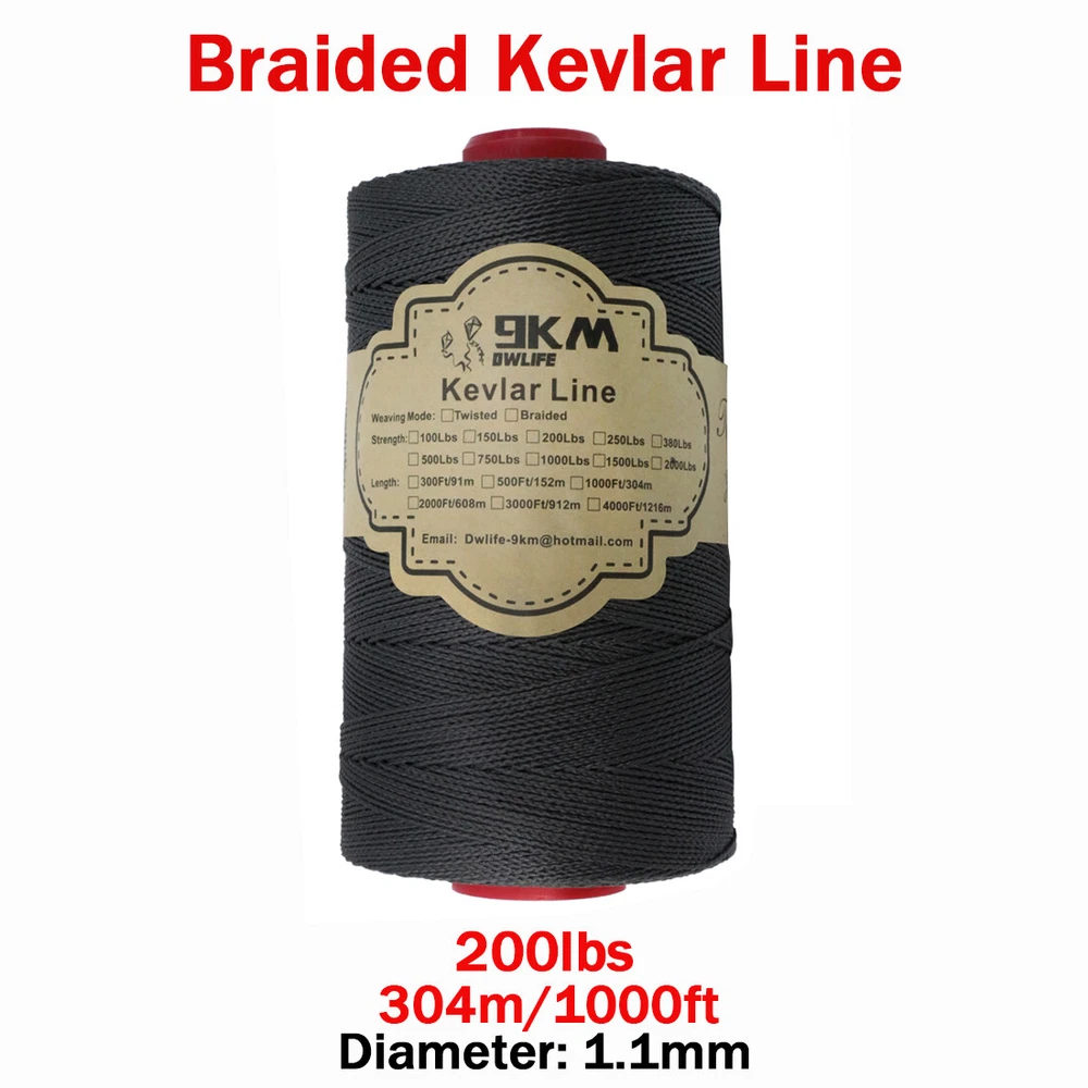 50lb-1500lb BRAIDED KEVLAR LINE Kevlar Fiber: The braided kevlar string is made of 100% kelvar fiber which is of high strength, high harness, high toughness and high abrasion resistance. Construction of Braid: Multi-strands interweaving process makes the string / cord much more durable, and it won't unravel like twisted line. Tough String: Every kevlar fiber is of high tensile strength. It exerts much higher strength in the same diameter. Cut-Resistance: One of the best advantages of Kevlar string. It helps avoid many unexpected string snaps which happen a lot in binding and fastening objects with sharp edges. Application: We provide strings from 100lb to 1500lb to meet different requirements, like, fishing, camping / hiking equipment fastening, usual outdoor line, plant support, gardening work, decoration hanging, creative projects, etc. Strength - Diameter - Weight per Meter: Approximately ±2~3% deviation exists in measurement. AMAZING Black COLOR! Great for outdoors Light weight, high tensile strength and small diameter make Kevlar cordage a great choice for below activities: Kites Flying String / Fishing Assist Line Large Model Rocket Cord / Speargun Shooting Line Camping Tarp Ridge Lines / Ultralight Backpacking Climbing / Rigging Sling / Survival Gear / Emergency Repair Cord Hiking Equipment Fastening / Tent Guy Lines Plant support / Arborist accessories Gardening Work / Decoration Hanging / Mason's line / Creative projects, etc. Notice:Around 90% of original strength is the safety working load. It‘s testing result from line factory.