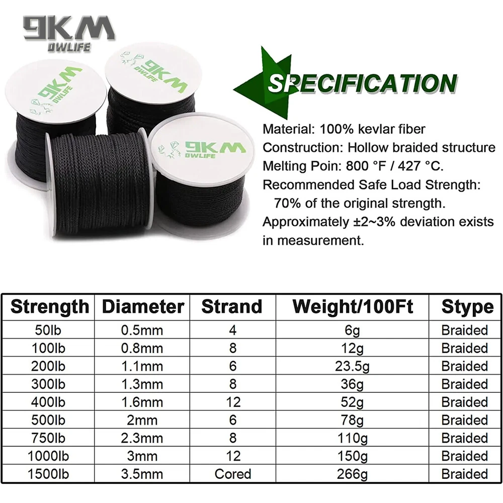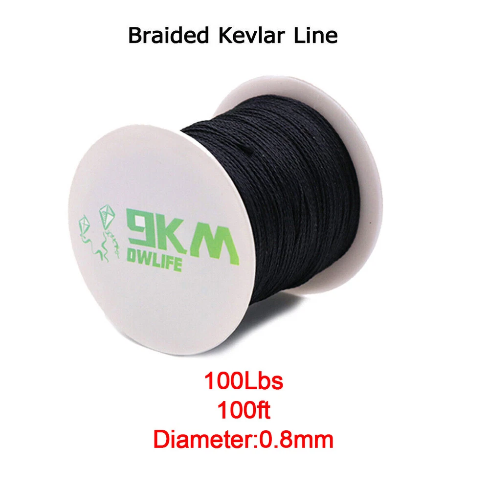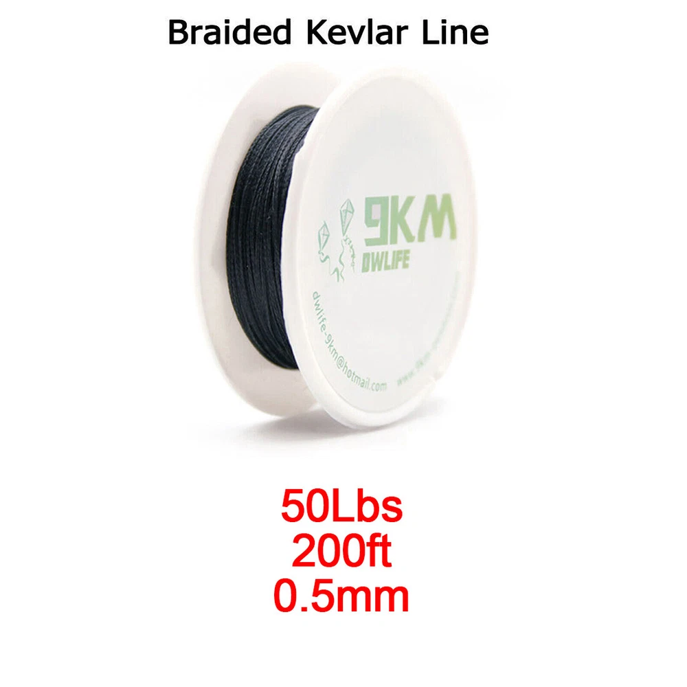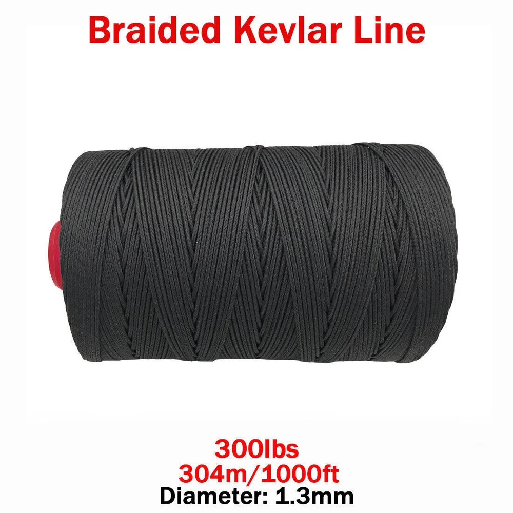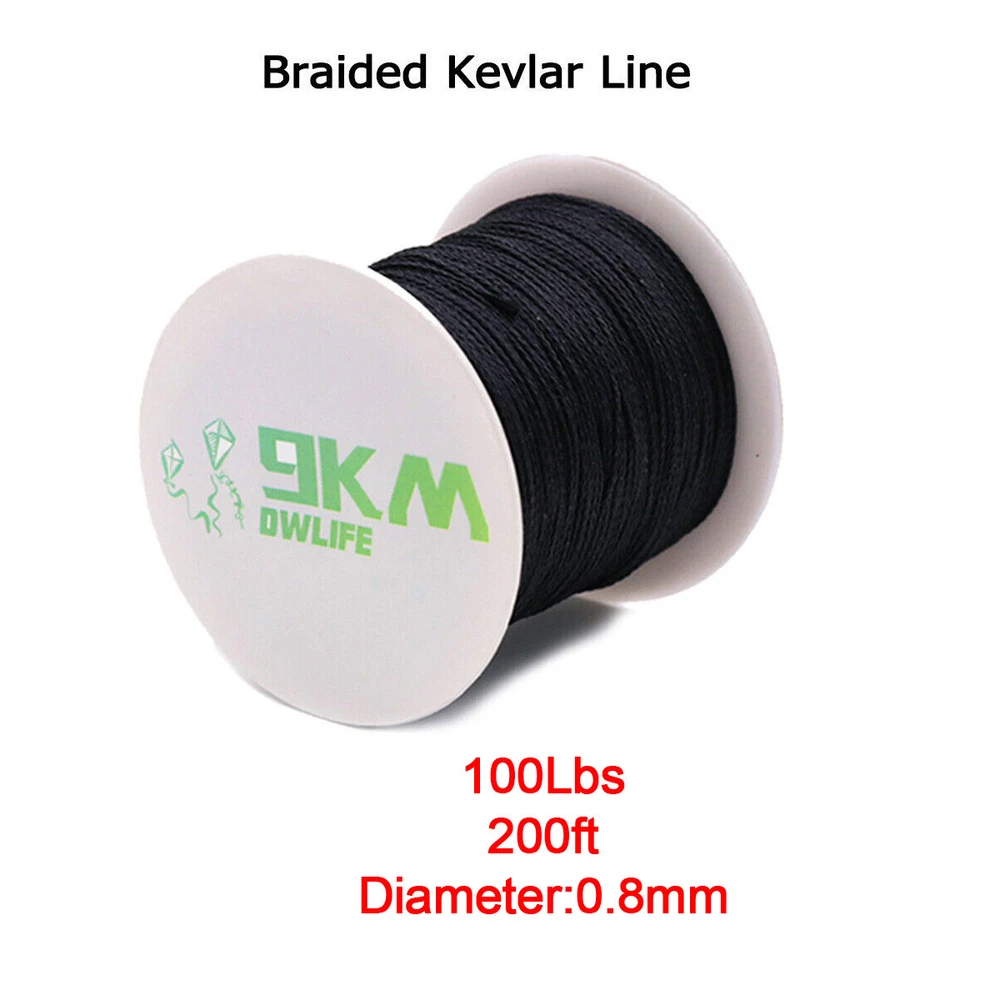 50lb-1500lb BRAIDED KEVLAR LINE Kevlar Fiber: The braided kevlar string is made of 100% kelvar fiber which is of high strength, high harness, high toughness and high abrasion resistance. Construction of Braid: Multi-strands interweaving process makes the string / cord much more durable, and it won't unravel like twisted line. Tough String: Every kevlar fiber is of high tensile strength. It exerts much higher strength in the same diameter. Cut-Resistance: One of the best advantages of Kevlar string. It helps avoid many unexpected string snaps which happen a lot in binding and fastening objects with sharp edges. Application: We provide strings from 100lb to 1500lb to meet different requirements, like, fishing, camping / hiking equipment fastening, usual outdoor line, plant support, gardening work, decoration hanging, creative projects, etc. Strength - Diameter - Weight per Meter: Approximately ±2~3% deviation exists in measurement. AMAZING Black COLOR! Great for outdoors Light weight, high tensile strength and small diameter make Kevlar cordage a great choice for below activities: Kites Flying String / Fishing Assist Line Large Model Rocket Cord / Speargun Shooting Line Camping Tarp Ridge Lines / Ultralight Backpacking Climbing / Rigging Sling / Survival Gear / Emergency Repair Cord Hiking Equipment Fastening / Tent Guy Lines Plant support / Arborist accessories Gardening Work / Decoration Hanging / Mason's line / Creative projects, etc. Notice:Around 90% of original strength is the safety working load. It‘s testing result from line factory.