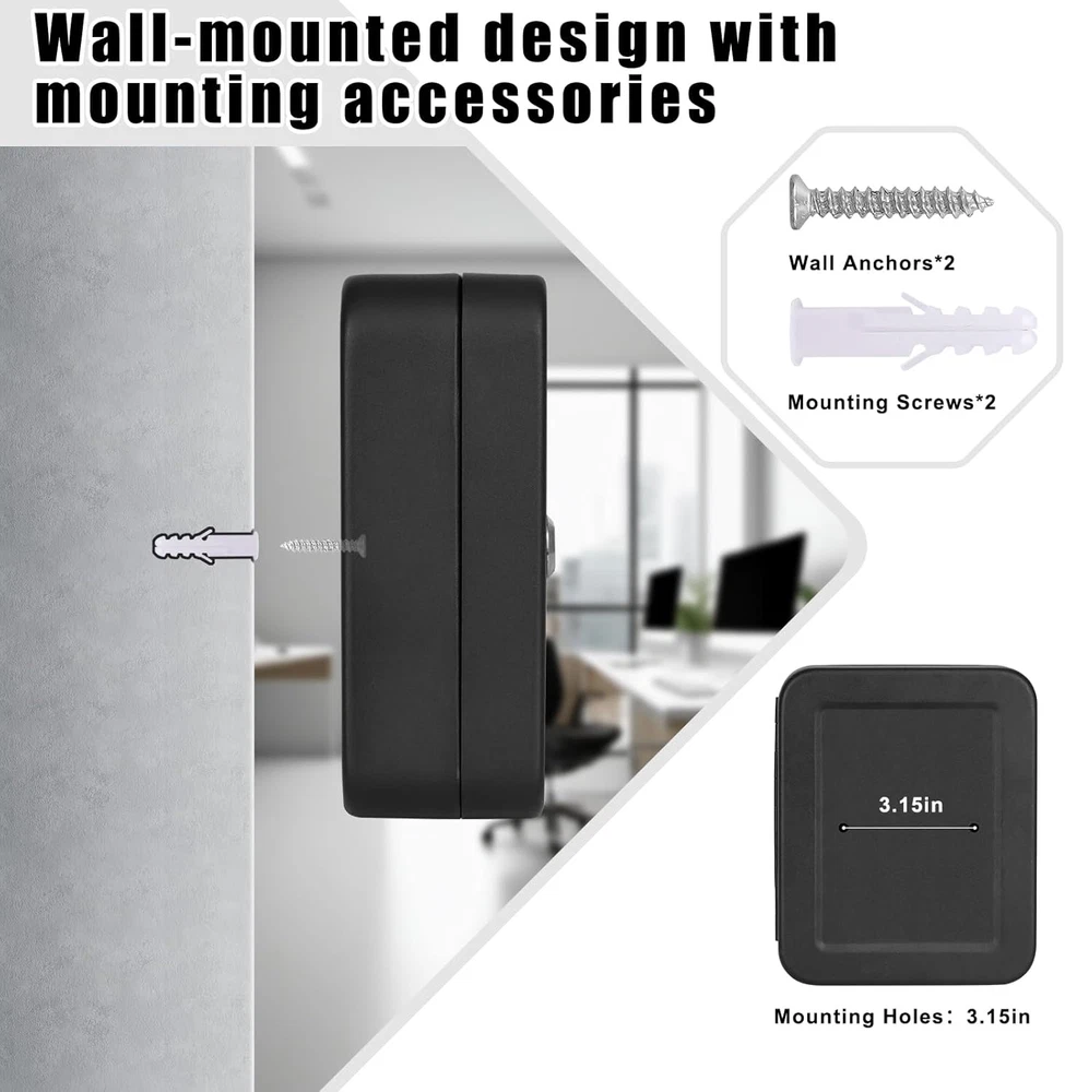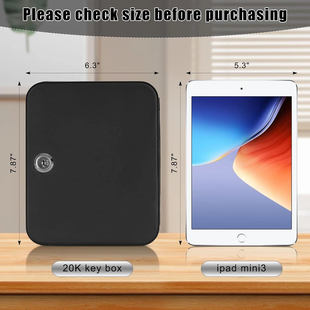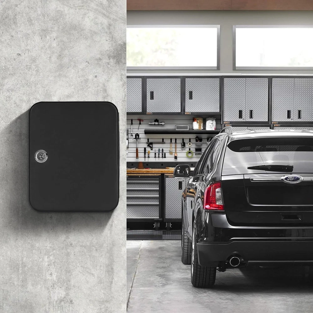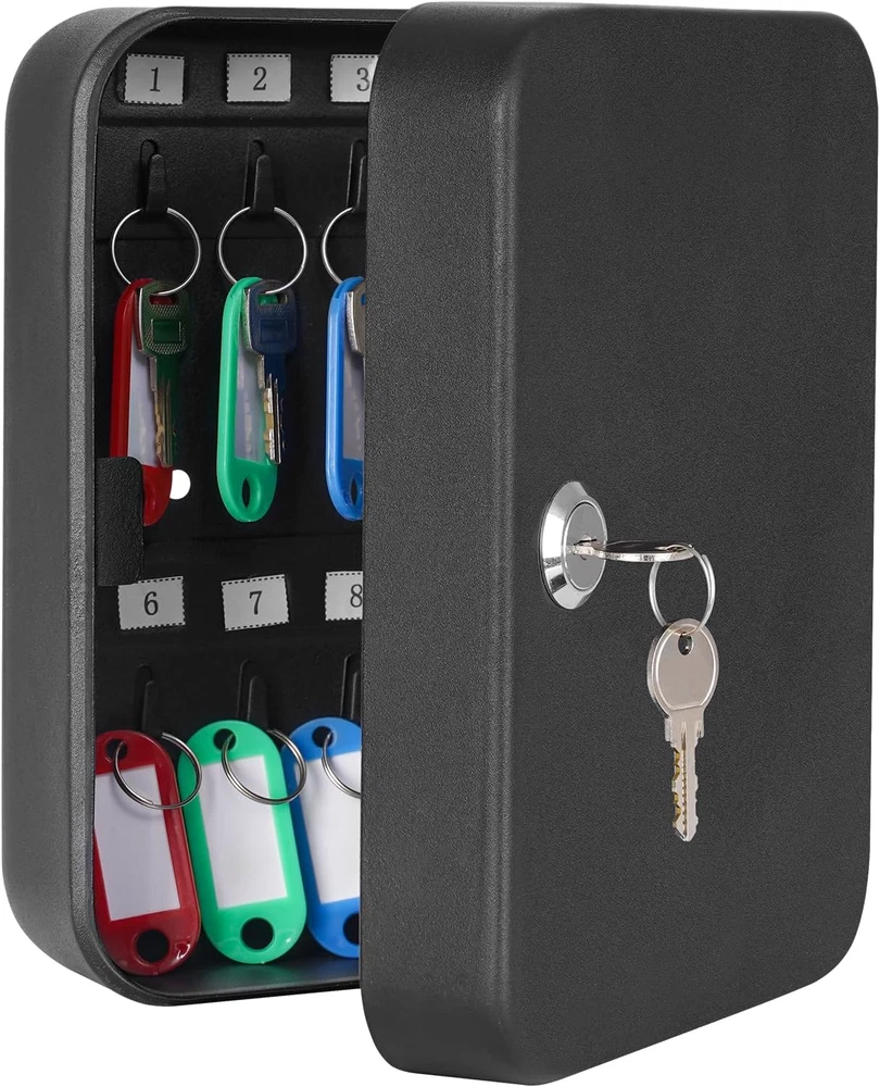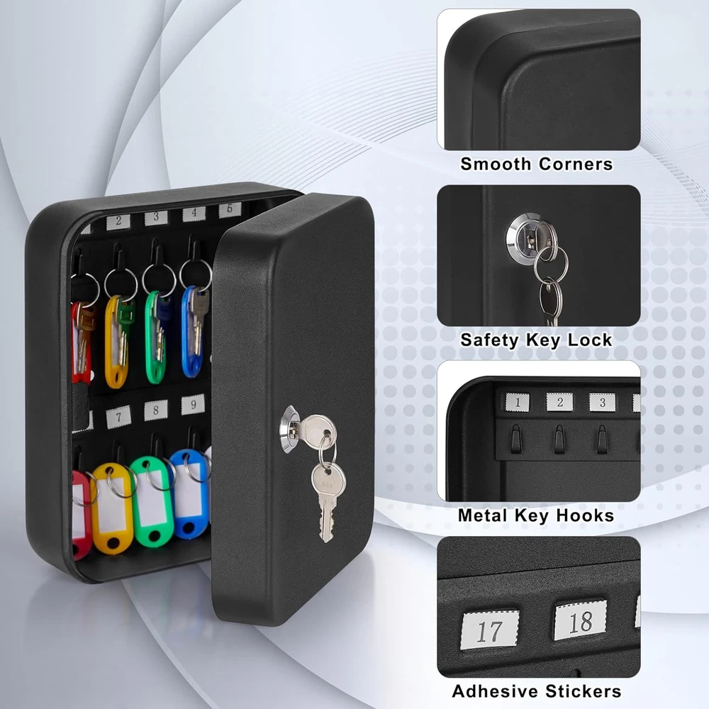 KEY STORAGE BOX: Keep keys security Key lock box includes 20 key rings, identification tags, and key labels SECURE DESIGN WITH KEY LOCK: The lockable wall mount keybox is made of a strong metal with two keys, and it gives faster and more immediate access. WALL MOUNTED DESIGN: Packing included 2 screws and 2 wall anchors for easy and stable installation onto the wall MULTIPURPOSE:Ideal for home, office, apartment complex, boat dealers, rental car agencies, car lots, body shops and more HIGH-QUALITY:Our key box with code is made of heavy-duty steel that provides prime security and long-term durability throughout the years. Easy to mount. Product Description Different Types of Key Cabinet Add to Cart Add to Cart Add to Cart Add to Cart Add to Cart Customer Reviews 4.5 out of 5 stars 2,061 4.5 out of 5 stars 2,061 4.6 out of 5 stars 1,892 4.6 out of 5 stars 1,892 4.6 out of 5 stars 1,892 Price $15.99 $ 15 . 99 $21.99 $ 21 . 99 $29.99 $ 29 . 99 $29.99 $ 29 . 99 $79.99 $ 79 . 99 Lockable ✔ ✔ ✔ ✔ ✔ Size 7.87"x6.3"x3.14" 10"x7"x3" 2.5"D x 8.1"W x 12.1"H 2.5"D x 8.1"W x 12.1"H 3.94"D x 12"W x 14.3"H Color Black Black Black White Black Lock Type Key Lock Combination Lock Key Lock Combination Lock Digital Lock Key Storage 20K 48K 40K 40K 60K