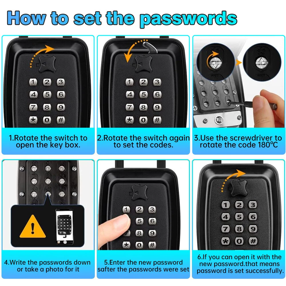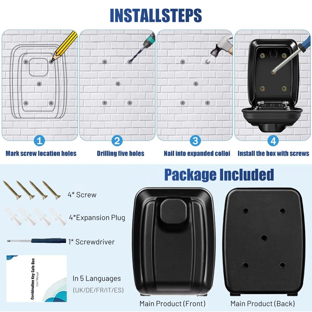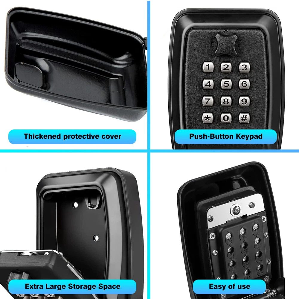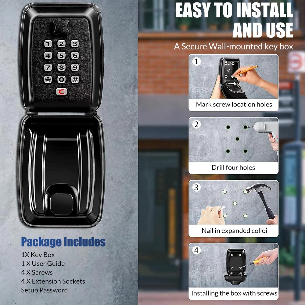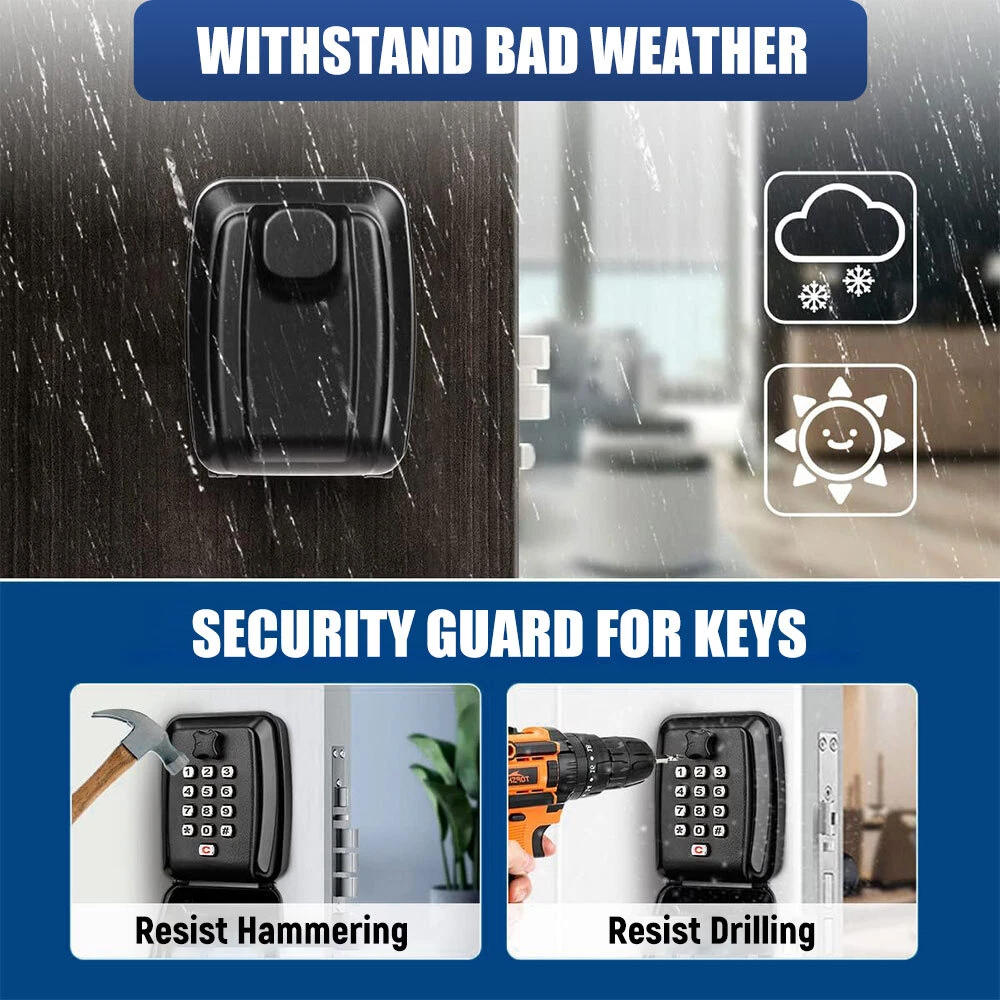 About this item 【HIGH SECURITY】- Key lock box can be set with a code of 1-12 digits at will. Provides more combination possibilities than many general 4-digit passwords on the market, so it’s harder to crack and has higher security. 【STURDY & DURABLE】- The key storage box made of high-strength zinc, aluminum alloy and heavy-duty stainless-steel material, enough to withstand hammered, sawed and pried, has a long service life, keeps your key safer. 【RAINPROOF & DUSTPROOF】- The key hider lock box comes with removable cover shields and a removable hang ring, which can effectively protect from rain, snow and sun. You can securely hang this key lock box on a doorknob, fence and anywhere you want, no need to put the keys under the carpet or flower pot. Key lock box for outside suitable for indoors and outdoors, such as garage doors, wardrobes, offices and schools. 【LARGE CAPACITY】- The security lock box size: 4.76*3.78*2.44 inches, it has ample storage space, a built-in key hook, which can hold multiple keys or other small things like ID cards, access cards, car keys, etc. Perfectly for family members, realtors, current students, office staff, pet sitters. Note: This "C" button means cancel, so you can re-enter the password if you entered it incorrectly. Specification: Material: Aluminum alloy + ABS. Weight: 650g. Color: black. What do you get? 1 x security key box 1 x User manual 1 x Screwdriver 1 x Packing box