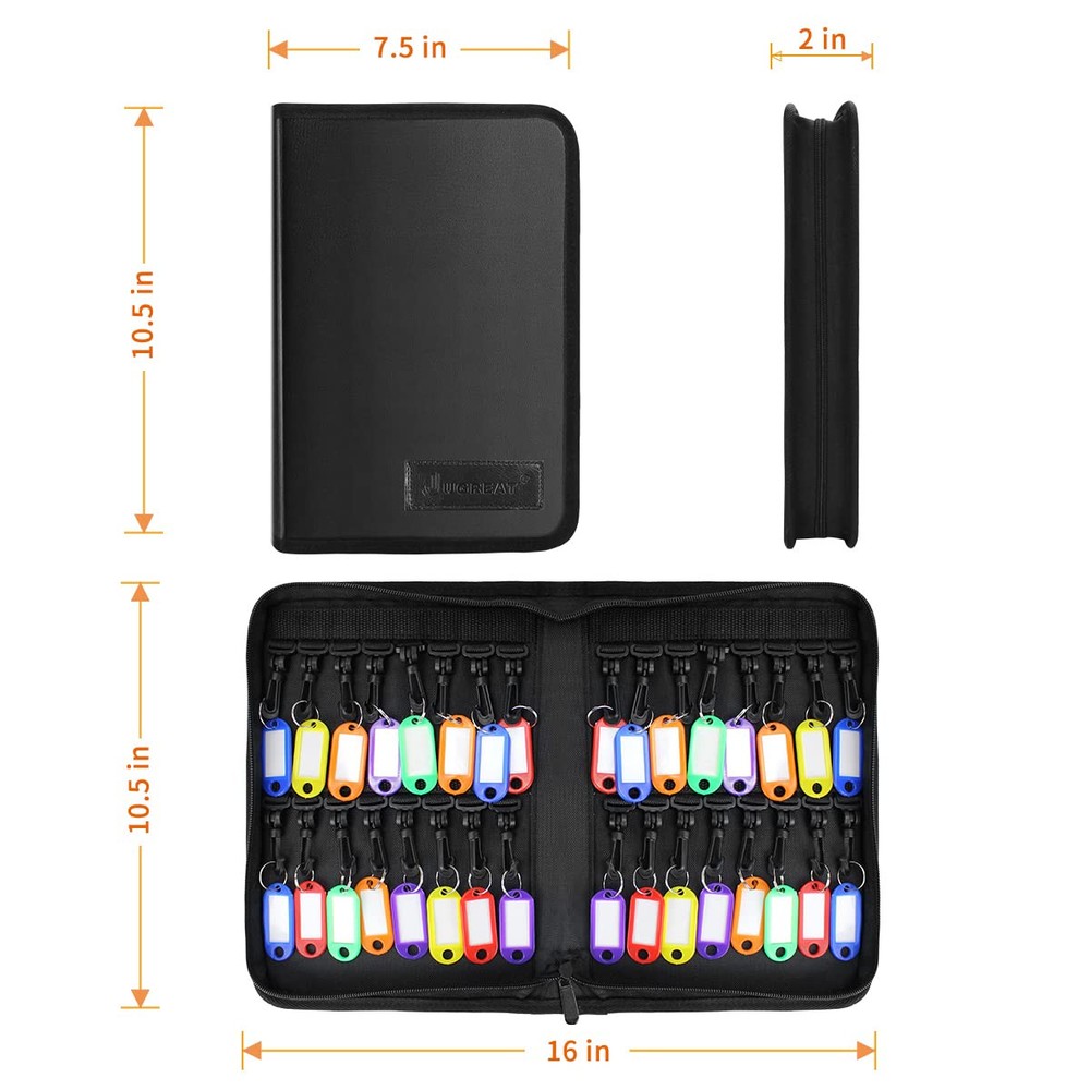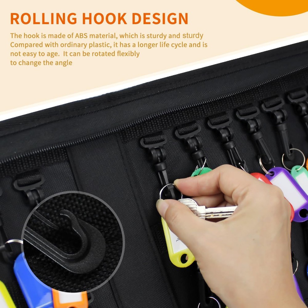 【Portable Key Organizer 】The leather key organizer measures 10.5*7.5*2 inches,large capacity can hold up to 32 keys, the key case is portable and convenient to carry around 【durable & sturdy】the portable key organizer is made of high-microfiber leather which offers extreme durability and comfortable feel,It contains 36 plastic key hooks easy to mark and distinguish keys,the key organizer keychain to Keeps your keys organized so you can find the keys you need right away 【Unique Keychain Design】The hook is made of ABS material, which is sturdy and durable. Compared with ordinary plastic, it has a longer life cycle and is not easy to age. The unique flexible rolling design of our hook is convenient for the key to be crowded due to size or other problems. It can be rotated flexibly to change the angle, and the top adopts advanced Nylon fixed, less damaged than Velcro, buttons, etc. 【Double Protection】Our key organizer case can help you organize your keys, so that you are no longer troubled by too many keys, messy, and indistinguishable. At the same time, we match a fireproof bag, which can be used with a key case to access cards, electronic cards and important contracts, or can be used alone. valuables, cards, watches, diamond rings, etc. 【Home & Business Use】:This key organizer box can be used to home keys and is also perfect for business use such as real estate rental or sales, vehicle rental, hotel, company, office, school, locker key organization