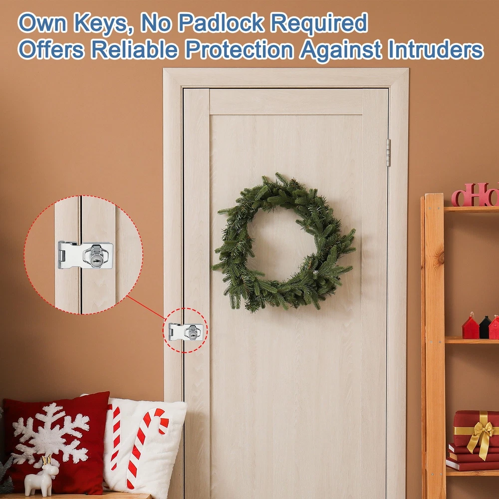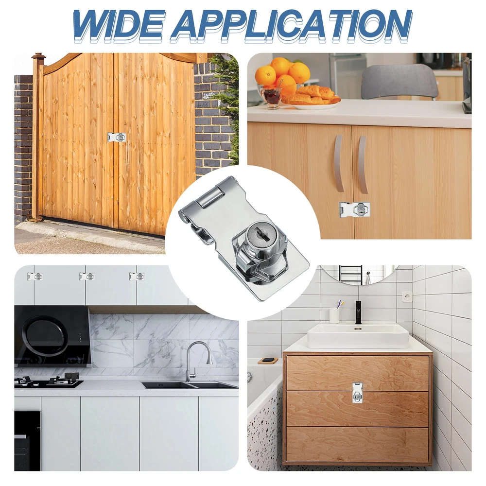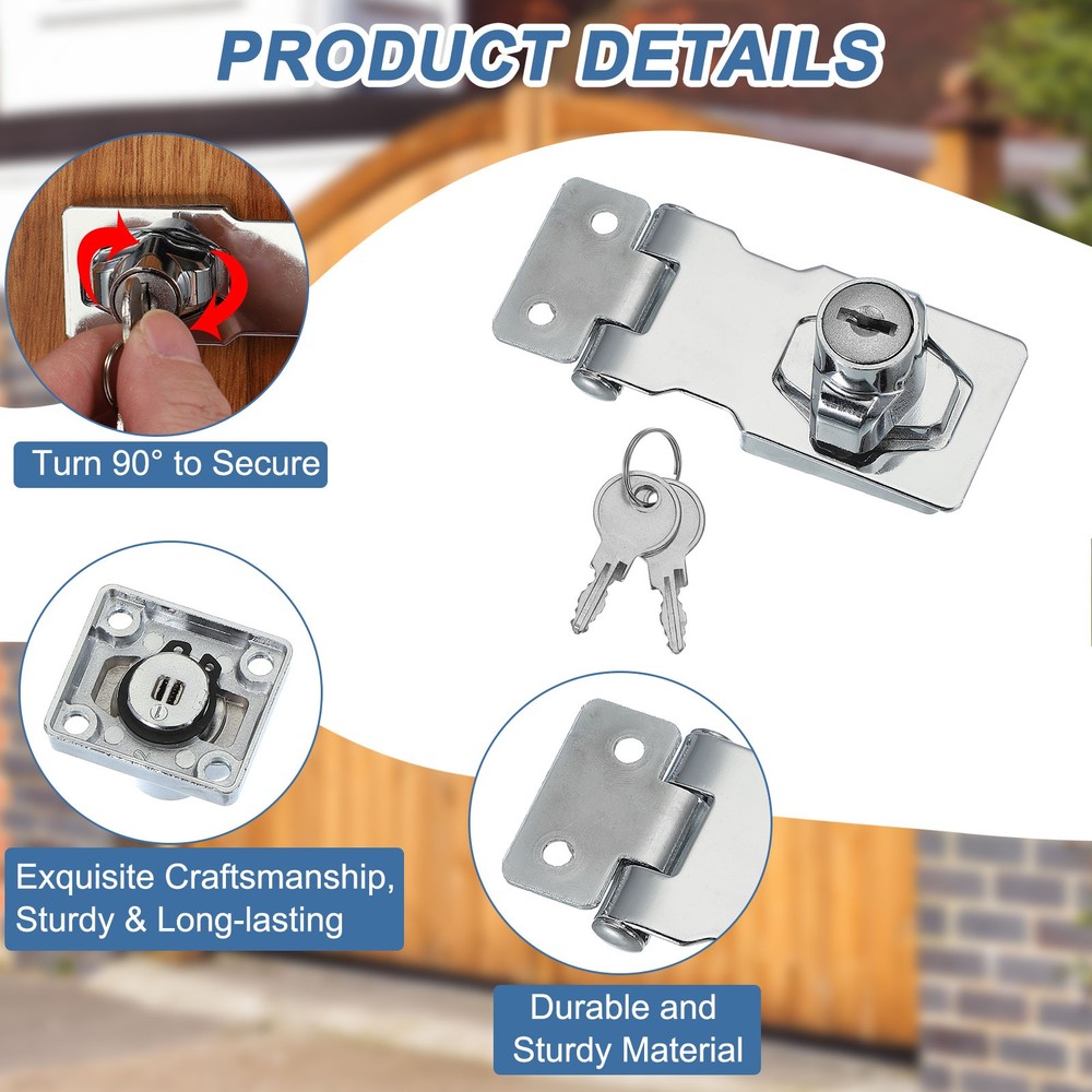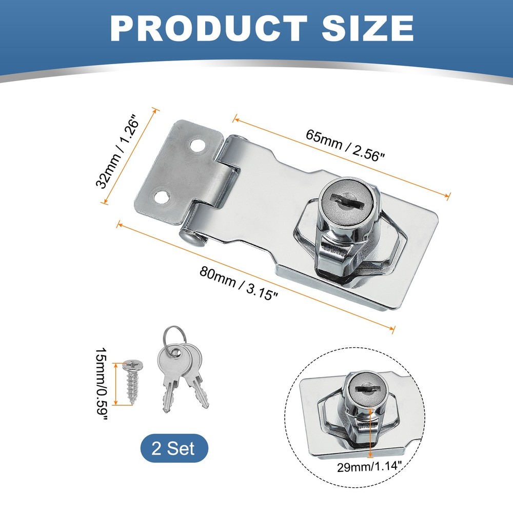 Document What is this?Keyed hasp locks are security devices commonly used to secure doors, cabinets, containers, or other storage units. These locks provide an additional layer of security by preventing unauthorized access to the locked item.What will I get?The Hasp Locks We Provide: Hasp Size(L x W): 65 x 32 mm/2.56 x 1.26 Inch; Open Length of the Hasp: 80 mm/3.15 Inch; Length of the Screws: 15 mm/0.59 Inch; Color: Silver; Material: Zinc Alloy; Pack List: 2 Pcs x Hasp Lock + 12 Pcs x ScrewsIs there any advantages of the product?It is made of zinc alloy, sturdy and durable, thick material, no deformation, no fading never rusty, making it suitable for various outdoor and indoor conditions.How to use it?Steps of installation: 1. Drill holes at the positions you want to install to facilitate screwing; 2. Align the holes on the hasp with the drilled holes; 3. Position the lock housing over the hasp and attach it securely by screws provided.What should I notice?Keep the keys in a safe and easily accessible place or keeping a spare key. Avoid misplacing them to prevent being locked out or any other emergencies. Keyed Hasp Lock with Keys & Screws 2.5 Inch for Small Doors (Pack of 2, Silver) What is this? Keyed hasp locks are security devices commonly used to secure doors, cabinets, containers, or other storage units. These locks provide an additional layer of security by preventing unauthorized access to the locked item. What will I get? The Hasp Locks We Provide: Hasp Size(L x W): 65 x 32 mm/2.56 x 1.26 Inch; Open Length of the Hasp: 80 mm/3.15 Inch; Length of the Screws: 15 mm/0.59 Inch; Color: Silver; Material: Zinc Alloy; Pack List: 2 Pcs x Hasp Lock + 12 Pcs x Screws Is there any advantages of the product? It is made of zinc alloy, sturdy and durable, thick material, no deformation, no fading never rusty, making it suitable for various outdoor and indoor conditions. How to use it? Steps of installation: 1. Drill holes at the positions you want to install to facilitate screwing; 2. Align the holes on the hasp with the drilled holes; 3. Position the lock housing over the hasp and attach it securely by screws provided. What should I notice? Keep the keys in a safe and easily accessible place or keeping a spare key. Avoid misplacing them to prevent being locked out or any other emergencies. Hot Item Payment 1.We accept eBay payment . 2.Payment must be received within 7 business days of auction closing. Shipping 1.We ship to your eBay or Paypal address. Please make sure your eBay and Paypal address is correct before you pay. 2.Items will be shipped within 1-3 business day when we received payment. 3.Delivery time depends on destination and other factors. Description Policy Keyed Hasp Lock with Keys & Screws 2.5 Inch for Small Doors (Pack of 2, Silver) What is this? Keyed hasp locks are security devices commonly used to secure doors, cabinets, containers, or other storage units. These locks provide an additional layer of security by preventing unauthorized access to the locked item. What will I get? The Hasp Locks We Provide: Hasp Size(L x W): 65 x 32 mm/2.56 x 1.26 Inch; Open Length of the Hasp: 80 mm/3.15 Inch; Length of the Screws: 15 mm/0.59 Inch; Color: Silver; Material: Zinc Alloy; Pack List: 2 Pcs x Hasp Lock + 12 Pcs x Screws Is there any advantages of the product? It is made of zinc alloy, sturdy and durable, thick material, no deformation, no fading never rusty, making it suitable for various outdoor and indoor conditions. How to use it? Steps of installation: 1. Drill holes at the positions you want to install to facilitate screwing; 2. Align the holes on the hasp with the drilled holes; 3. Position the lock housing over the hasp and attach it securely by screws provided. What should I notice? Keep the keys in a safe and easily accessible place or keeping a spare key. Avoid misplacing them to prevent being locked out or any other emergencies. Hot Item Payment 1.We accept eBay payment . 2.Payment must be received within 7 business days of auction closing. Shipping 1.We ship to your eBay or Paypal address. Please make sure your eBay and Paypal address is correct before you pay. 2.Items will be shipped within 1-3 business day when we received payment. 3.Delivery time depends on destination and other factors.