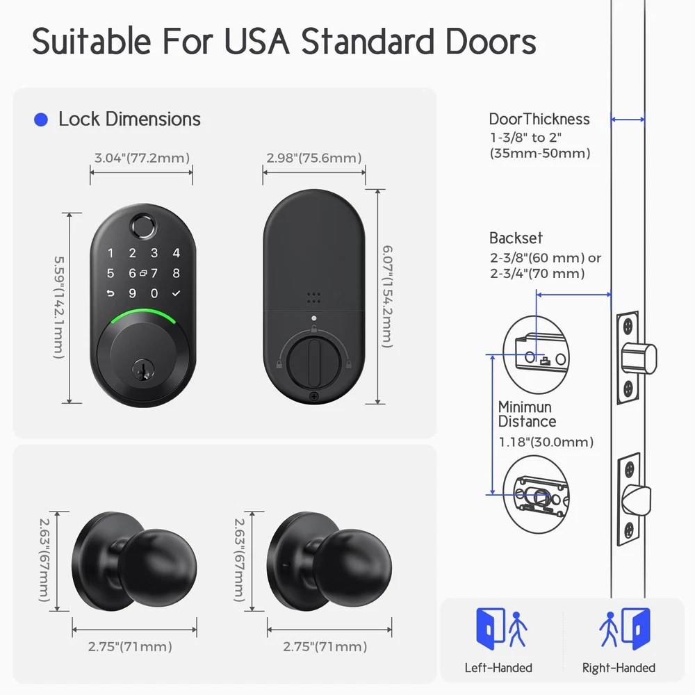 Keypad Smart Lock with Knob set,Keyless Entry Door Lock Deadbolt with Handle,Front Door Lock Set,Fingerprint Door Lock Set. Smarter and More Secure: Take control of your smart door lock with the app/PC, or use fingerprints, keypad, IC card, mechanical key, voice control,The lock is made of aluminum alloy and has been tested many times to ensure its durability and security. Remote Access: You can control and monitor the lock anytime, anywhere by connecting to the gateway (sold separately), peace of mind to you. Versatile Applications: Our products are compatible with most standard US door,it can be adapted to a variety of conditions with an IP66 waterproof rating and a temperature range from -22°F to 185°F. It's perfect for homes, hotels, apartments, offices. Easy to use: Only a screwdriver is needed to install the lock easily, while the lock provides 150 passwords, 200 fingerprints and key fob, easy to manage and use. Exceptional Customer Service: Alongside our high-quality products, we prioritize excellent after-sales service. Enjoy a 30-day money-back guarantee, a 1-year product warranty,and lifetime after-sales support.