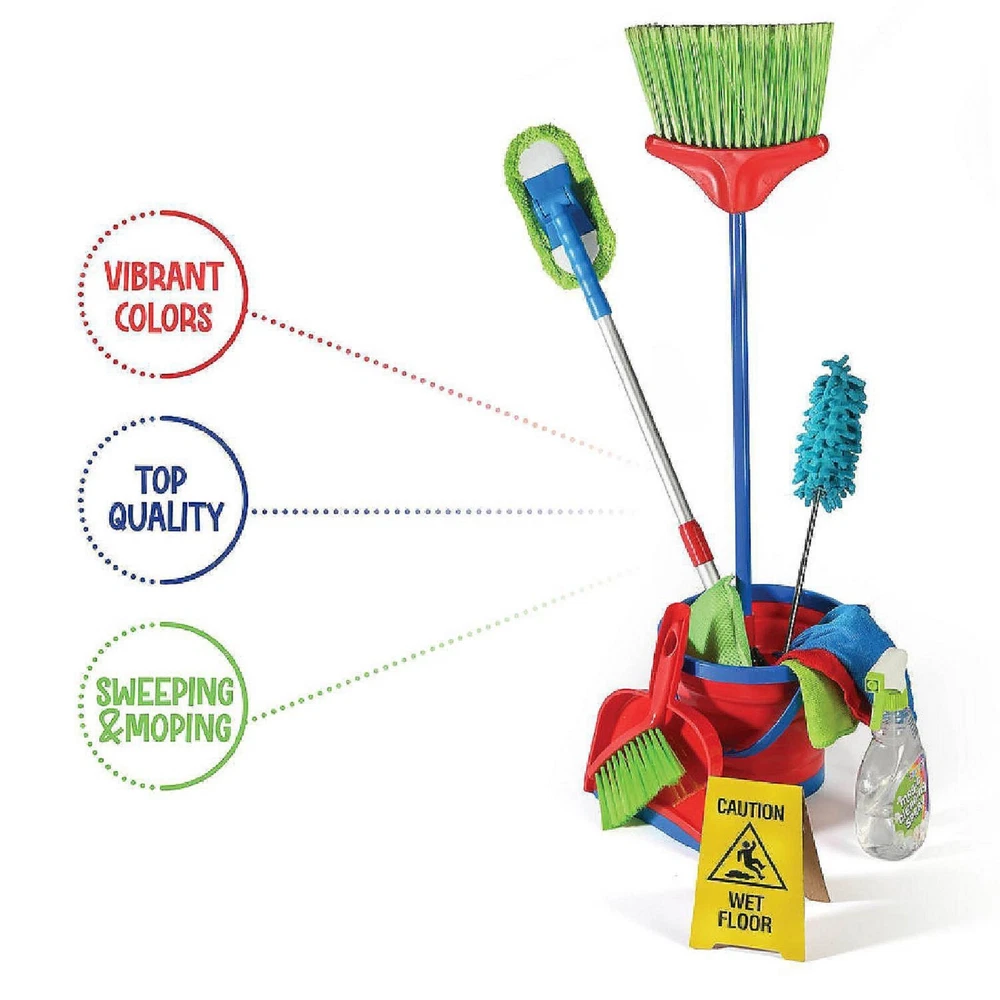 Introducing our Kids Broom and Mop Set , designed to make cleaning fun for little helpers! Featuring durable construction, the set is easy to assemble with a simple twist-and-push mechanism. The broom measures 28.75 inches, and the mop is 26 inches tall, perfectly sized for toddlers. With soft, thick bristles, they can tackle messes like spilled cereal and scattered toys effortlessly. Our set is also easy to clean, allowing you to spend more quality time with your child. Invest in our Kids Broom and Mop Set today to turn cleaning into an enjoyable family activity!