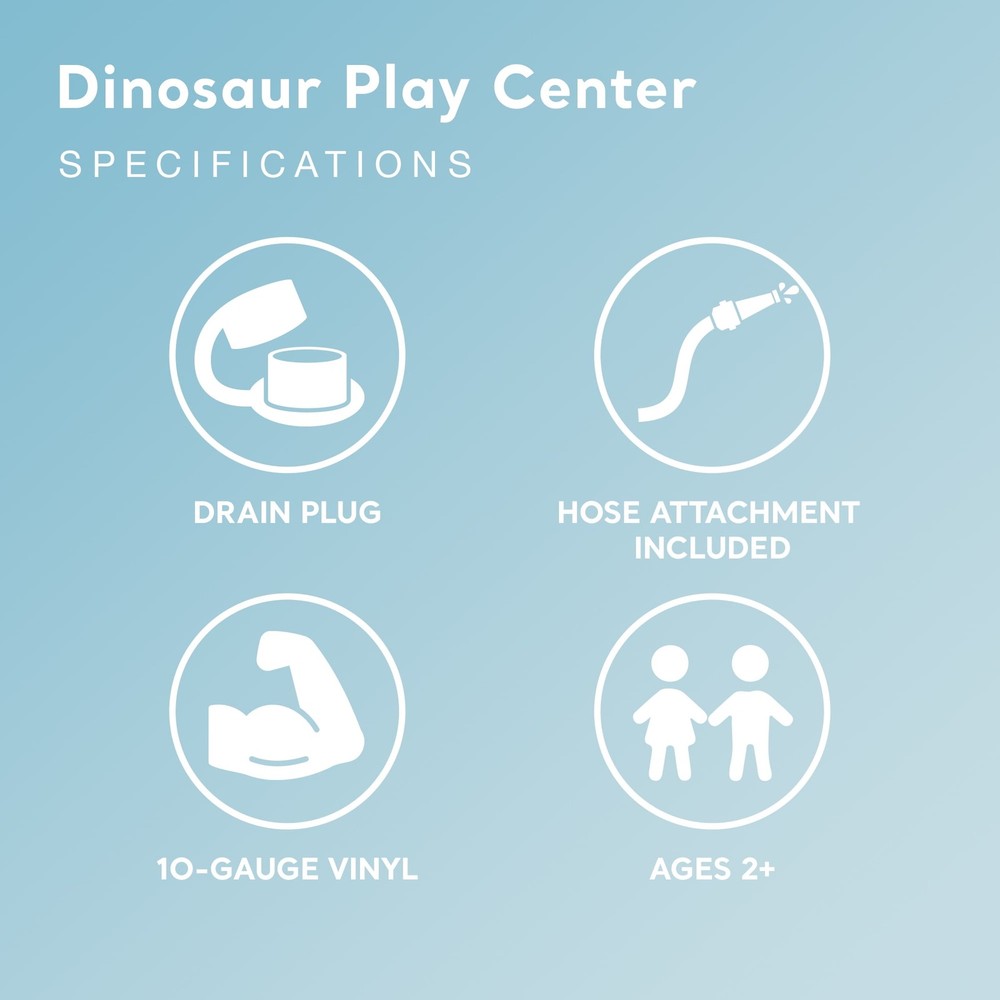 Product details Have the best time playing and splashing with your kids in the Dinosaur Play Center Water Park Pool from Intex. Give your kids a fun experience they will not soon forget and be the talk of the neighborhood with this toddler outdoor water play center. Your kids are sure to keep cool in the wading pool with the built-in palm tree water sprayer and waterfall. Simply attach the play center to a standard garden hose for hours of entertainment and tons of enjoyment. Feed the hungry dinosaur with the 6 included colorful fun balls to keep your kids enertained during a warm Summer day or slide down the volcano water slide onto the soft landing mat for a safe landing and to keep cool. Constructed with durable 10-gauge vinyl materials, this kiddie pool will surely last through all the splashing fun. Quickly inflate the water park, fill it with water, and watch your energy-filled kids use their imaginations and create their own adventures. When finished playing, use the convenient drain plug to empty the pool and easily deflate it for efficient storage. In the event that a tear or puncture occurs, this Summer water play center comes with a heavy-duty repair patch for a quick and easy fix. Transform your backyard into an island adventure! Enjoy your hot summer days with the Intex Dinosaur Play Center Water Park Pool. Dinasour water park will have kids playing and splashing in the pool or sliding down the volcano water slide Built-in palm tree water sprayer and waterfall are sure to keep kids cool on hot summer days Includes 6 multi-color balls that fit into the wall for more playtime fun Constructed of durable 10-gauge vinyl materials that hold tough for summer after summer usage Slide is designed with a soft landing mat for comfort and ultimate safety Conveniently drain plug allows you to quickly empty the pool and easily deflate for efficient storage Quickly inflate the inflatable play center and hit the water (pump is not included) Heavy-duty repair patch is included Recommended for kids ages 2 years and up Maximum weight limit: 178 pounds Water capacity: 72 gallons Material: PVC Color: Multicolor Dimensions (L x W x H): 95 x 75 x 43 inches Weight: 10 pounds Manufacturer warranty: 30-day warranty
