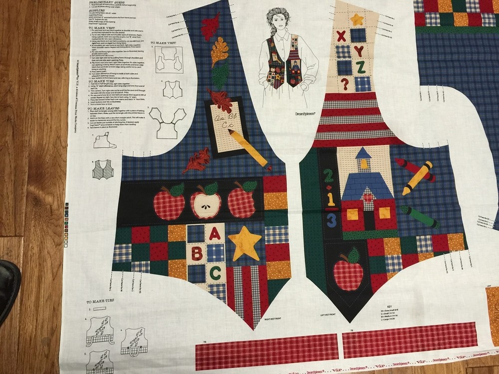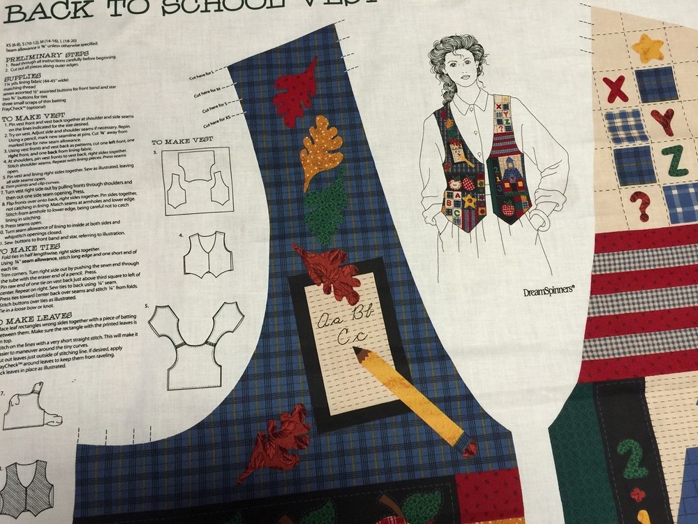 Fun "Back to School Alphabet " Easy to make Vest Fabric Panel Cut to Size XS (6-8), S (10-12), M (14-16) or L (18-20) A Dreamspinners Print fabric made from 100% cotton for V.I.P. Cranston The auction is for 1 fabric panel - ready to sew. fun and easy to make. 100% cotton fabric. A great gift to make in a jiffy I've got lots of fun panels and quilting fabric so be sure to check out my other auctions and I always discount shipping on multiple orders.