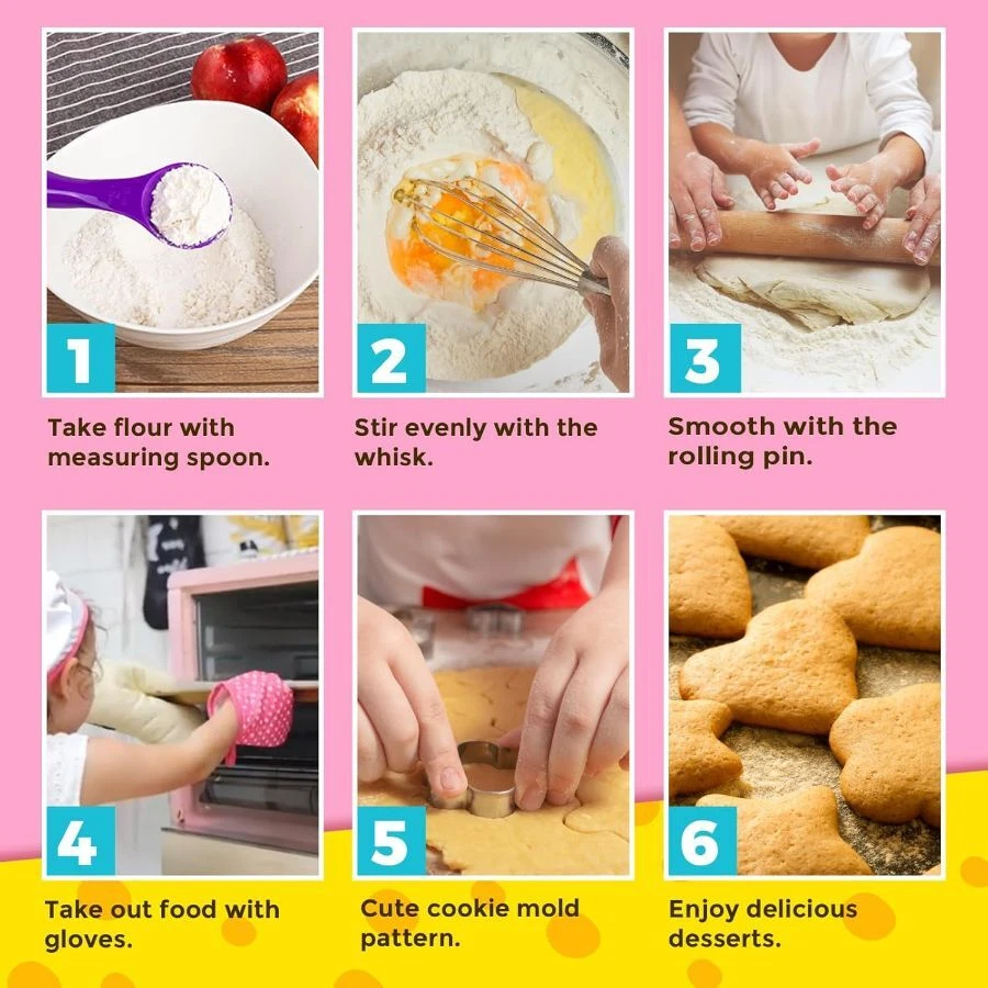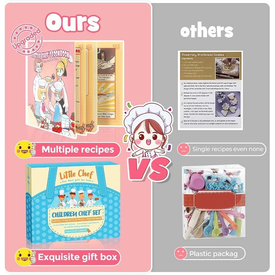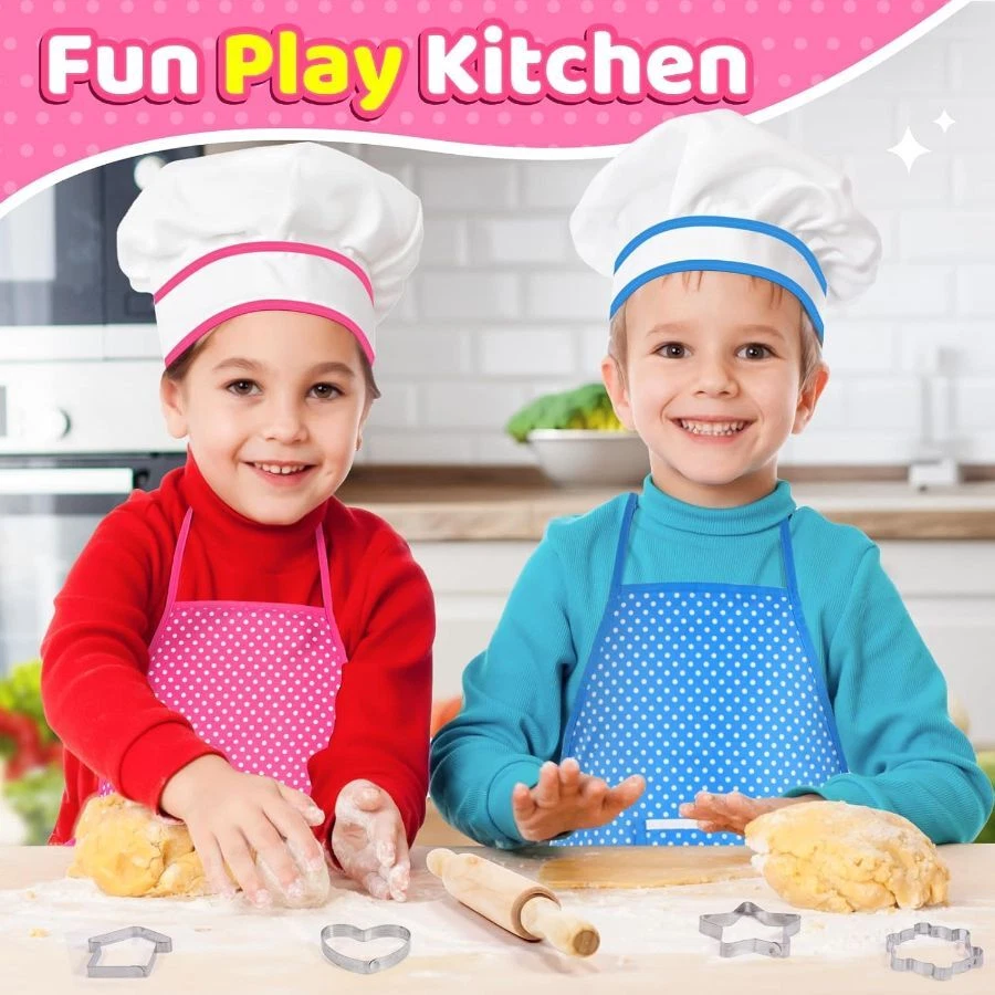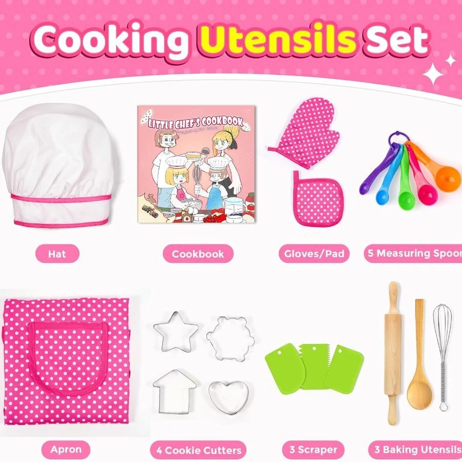 COMPLETE 20PCS/SET: Includes Apron, Chef's hat, Cookbook, Oven glove, Insulation pad, Wooden spoon, Whisk, Rolling pin, 5 measuring spoon, 3 scrapers and 4 cookie cutters. With CPC certificate, passed CPSIA and ASTM standard tests, Completely meet kids' basic cooking and baking game needs COMES WITH COOKBOOK: Kids don’t know how to make food? Do not worry! kids baking set has a well-designed and bound cookbook, which introduces 10 kinds of food preparation methods through the most simple way of easy understanding pictures and texts. Correctly help children get started with cooking PRACTICAL COOKING TOOL: Scrapers smoothen the cream, or carve patterns, or cut dough; Measuring spoons help to add ingredients accurately; Whisks and spoon aimed at food mixing; Metal molds create different cookies; the Apron has front pocket to store small tools, the oven mitt is filled with PP cotton to prevent scalding; Real tools, Real kitchen helper On Dec 15, 2024 at 18:34:19 PST, seller added the following information: