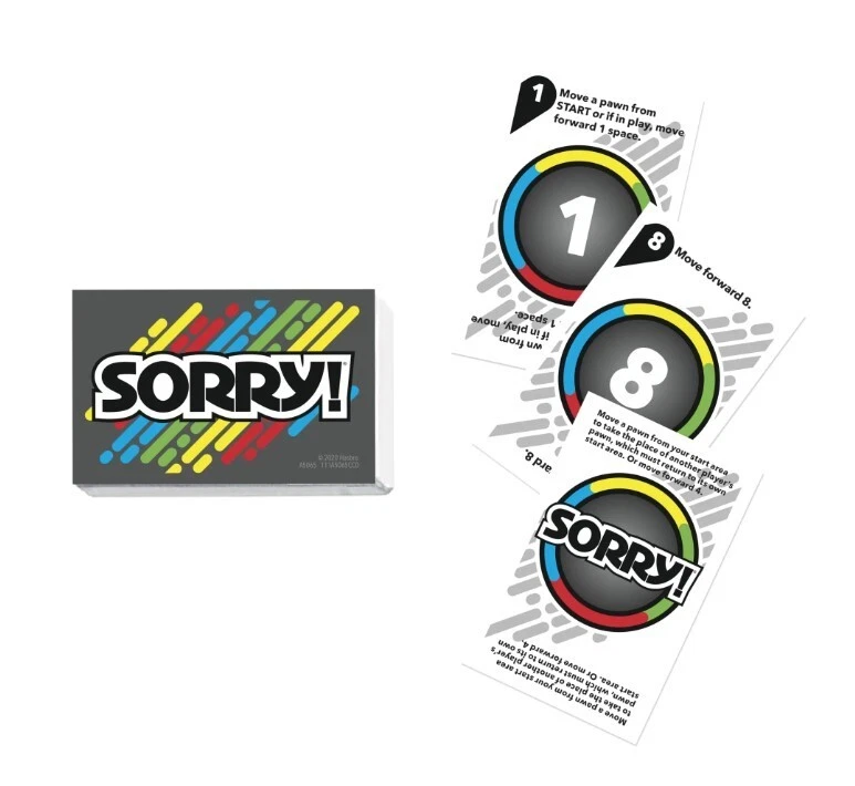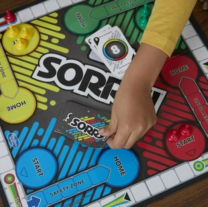 Kids Board Game, Family Board Games for Kids, 2 to 4 Players, Ages 6+, Plastic. Product details Sorry! Kids Board Game, Family Board Games for Kids, 2 to 4 Players, Ages 6+ Slide, collide and score to win the Sorry! game! Who knows what will happen next as players chase their opponents around the board, trying to get their 3 pawns from start to home first? Will a player draw a card that tells them to move ahead 2 spaces or back 6? Will someone land on a slide or will an opponent land on a player's space, sending them back to the start? This iconic children's game is a great choice for game nights and one of the best indoor games for kids. Kids board games like Sorry! make great family gifts for 8 year old boys and girls and up. Add this family board game for kids to your next Family Game Night! Hasbro Gaming and all related terms are trademarks of Hasbro. Includes gameboard, 12 Sorry! pawns, 45 cards, and instructions. Ages 6 and up. For 2 to 4 players. © 2022 Hasbro. All rights reserved. GAME OF SWEET REVENGE: Enjoy classic Sorry! gameplay with this Sorry! board game for kids. It's an edge-of-your-seat race to home, so hurry up and get there first FIRST ONE HOME WINS: Who will be the first player to get all 3 of their pawns to the home space? But watch out! Players can get "sweet revenge" by sending each other's pawns back to the starting point SO MANY POSSIBILITIES: Slide, collide, and score to win the Sorry! game. This family game for kids and adults features so many possibilities depending on the card picked up and strategy chosen CLASSIC SORRY! GAMEPLAY: Remember playing the original Sorry! game as a kid? Bring back memories of playing the Sorry! game with family members and introduce it to a new generation FAMILY GAME NIGHT FAVORITE: A go-to game for family time or anytime indoor fun, the Sorry! game for kids is one of the best family games for game night GREAT GIFTS FOR GIRLS AND BOYS: Classic board games make entertaining family gifts for kids ages 6 and up who love group games CHRISTMAS GIFTS FOR KIDS: This kids board game is a fantastic choice for holiday games and gifts under $10, making it perfect for Secret Santa and White Elephant gift exchanges