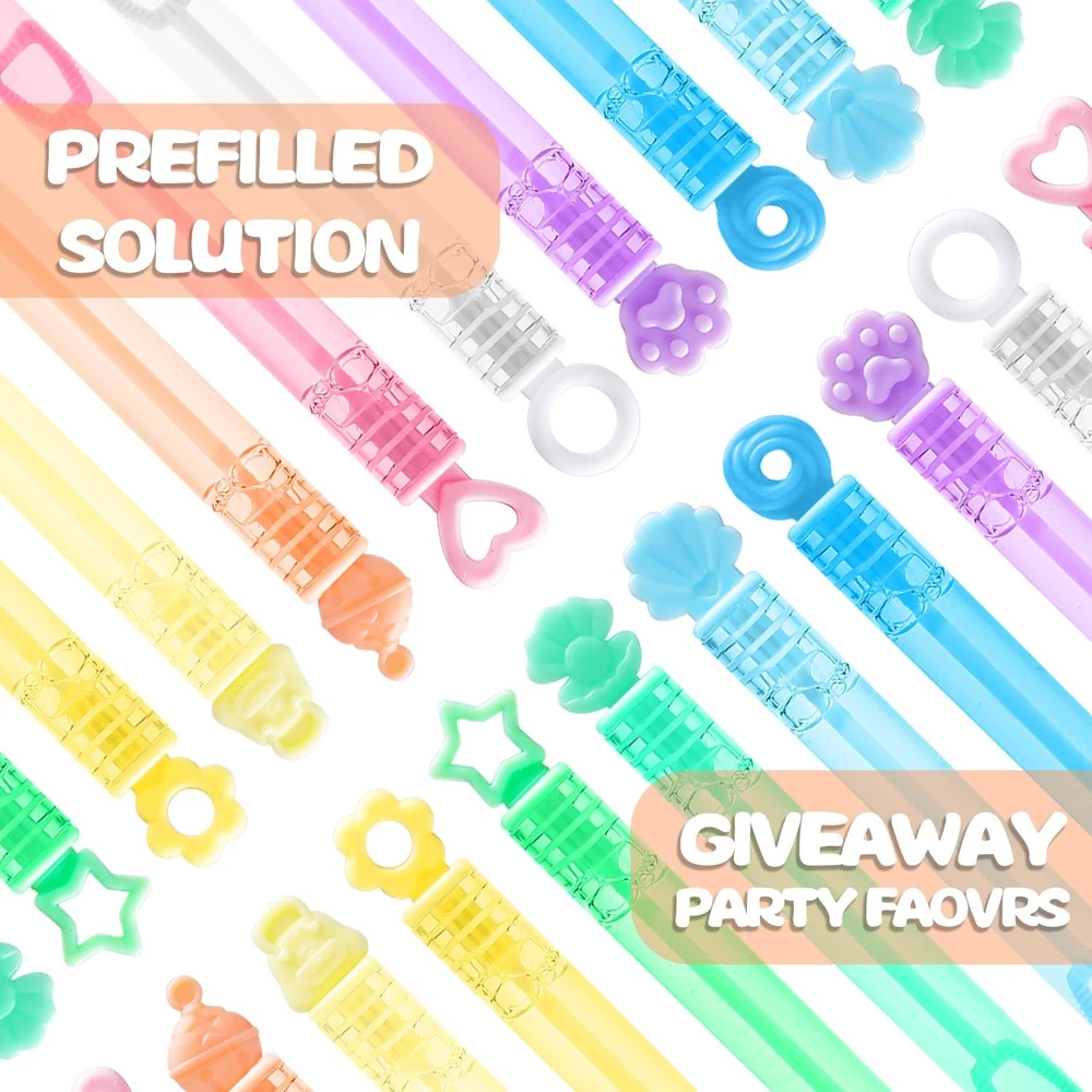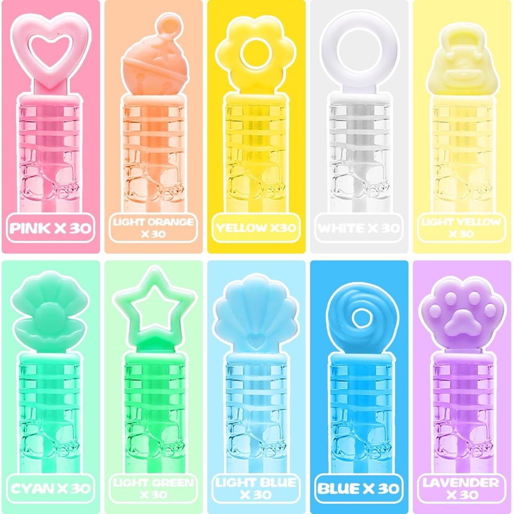 This bubble wand can liven up the atmosphere in many occasions and make your party more fun! Children in the party can simply blow bubbles and experience the colorful world brought by bubbles. Great for mermaid, princess, unicorn, ice cream, pool parties, kids' birthday parties, baby shower, bath time, wedding, pockets, goody bag stuffers, piñata filler, school bags, Easter baskets, Halloween carnival prizes, Thanksgiving, New Year gifts, etc.. Package include: 10 colors and 10 designs mini bubble wands with gift box Measure 4” tall and contains 0.2 oz bubble soap. Stars, shells, circles, hearts, flowers, and cat claws, etc. Corresponding to 10 different colors: cyan, light green, blue, light blue, white, pink, yellow, light yellow, light orange, and lavender Suitable for kid: 3 years old and age up All designs are patented 300 Pack mini bubble bulk with gift box(10 colors and 10 designs), including stars, shells, circles, hearts, flowers, and cat claws, ect. Each measures 4.1 inches (0.16 Fl Oz). Charming theme design perfect for summer events Perfect Packing: Featuring an innovative design, the gift box is fashioned to amaze in any setting. The assorted Pastel small bubble sticks can easily become decorations for theme parties without any additional trouble Bubbles for children: The bubble solution is non-toxic, safe, clean, and odorless. Perfect for boys, girls, and toddlers aged 3 years and up. Parents can feel confident while their children play Party Favors: These bubbles set wonderfully for mermaid, princess, unicorn, ice cream, and pool parties. Great for kids' birthdays, baby showers, bath time, and wedding. The bubble wands boost the festive atmosphere. Ideal Gifts: With a space-saving design that children can easily hold and put anywhere (pockets, goodie bags, pinata stuffing, school bags, Easter baskets, Halloween prizes, Thanksgiving, and New Year presents)