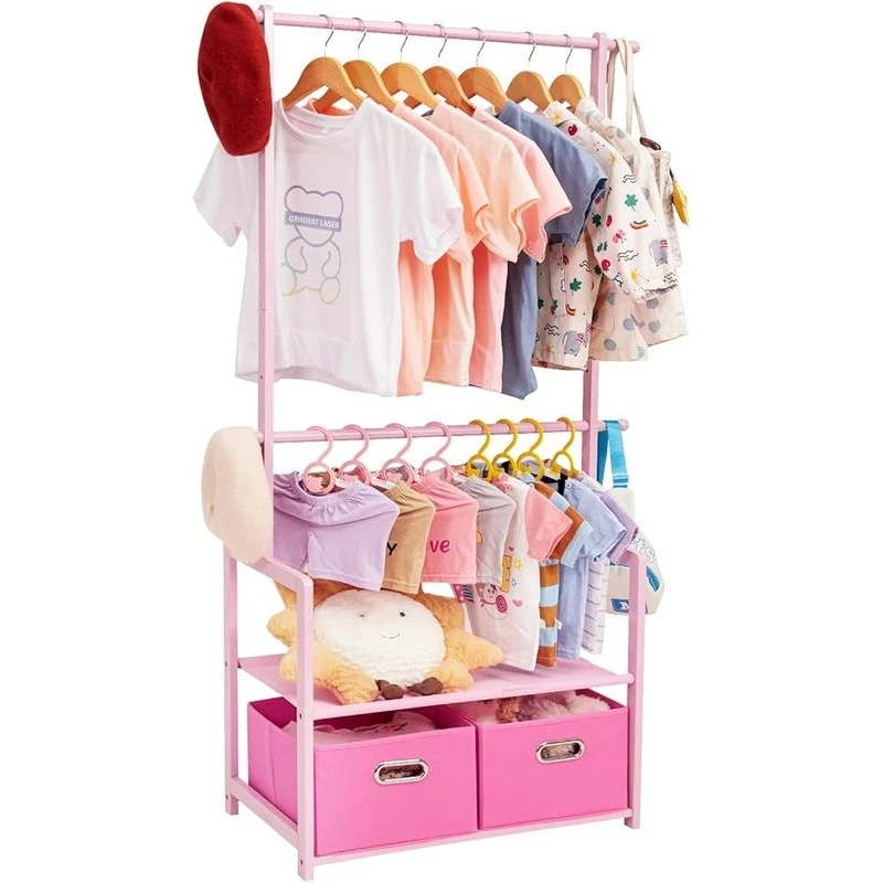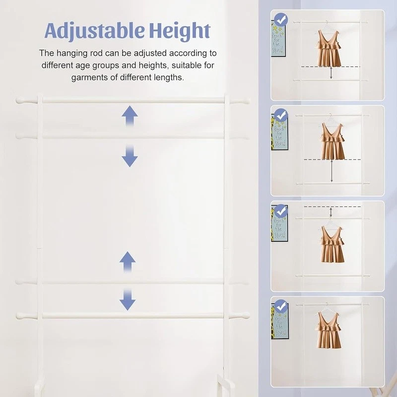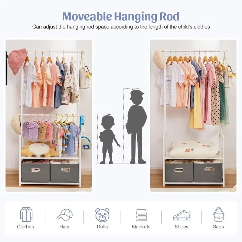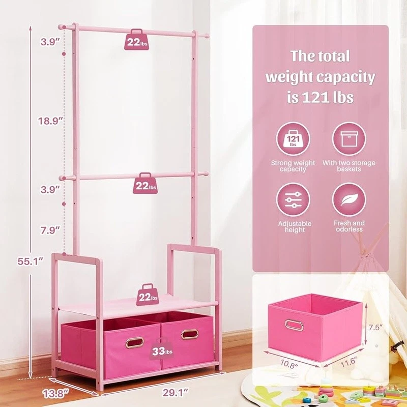 About this item With 2 Storage Baskets: Our kids clothing rack provides more storage space. The 2 storage baskets are convenient to carry and move. You can easily place them on bookshelves, wardrobes, or other storage spaces and adjust their positions as needed. They are suitable for storing your child's small items or toys,suitable for children aged over 8 years old 2 Adjustable Hanging Rods: This allows you to adjust the height of the hanging rods according to your child's height and needs, to accommodate different sizes of clothing and your child's growth. The height adjustment function of the hanging rods on our kids clothing rack is easy to operate and sturdy Partition and Storage: The kids clothing rack allows for partition storage, with 2 hanging rods to store different sizes of clothing, a middle layer for commonly used items, and a bottom shelf for storing children's shoes, books. The 2 storage baskets provide additional storage space. It allows children to better organize and store clothing, shoes, toys, and books Safety Design: Considering the safety of children, our kids clothing rack features a rounded design to avoid sharp edges. The surface of the clothes rack is polished smooth, ensuring safety and preventing hand injuries Bamboo Material: This kids clothing rack is made of natural bamboo, which is tough, stable in structure, and has a good touch. The bamboo material is also treated with PU paint, making it more sturdy and easy to clean. The maximum load of the entire children's clothes rack is up to 121 lbs › Brand: Color: White Material: Bamboo Recommended Uses For Product: Coats, Hats, Shoes, Tie & Belt Product Dimensions: 13.78"D x 23.19"W x 55.12"H