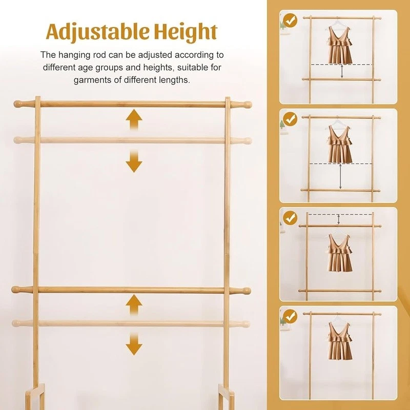 Freestand Clothing Rack Solid Wood Garment Shelf Rust-proof & Adjustable Footbed