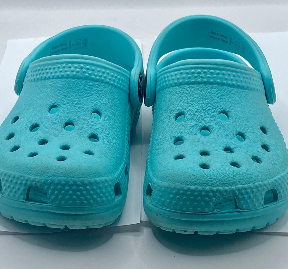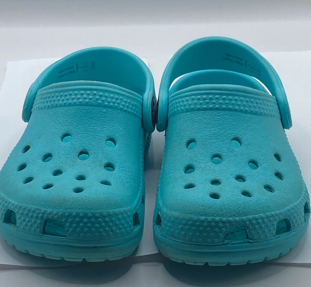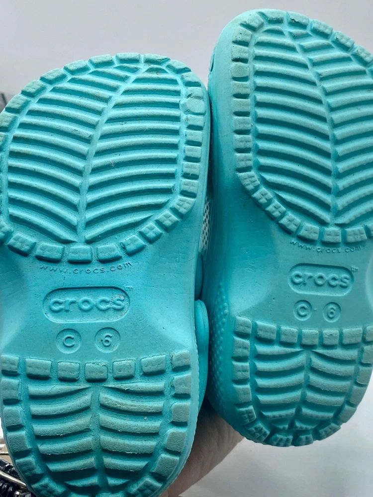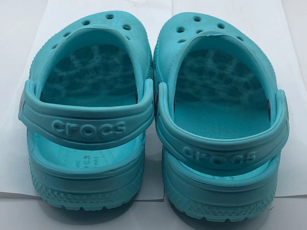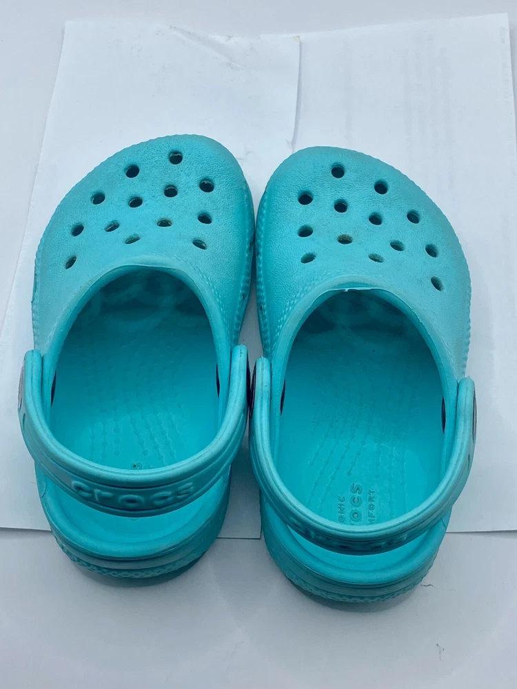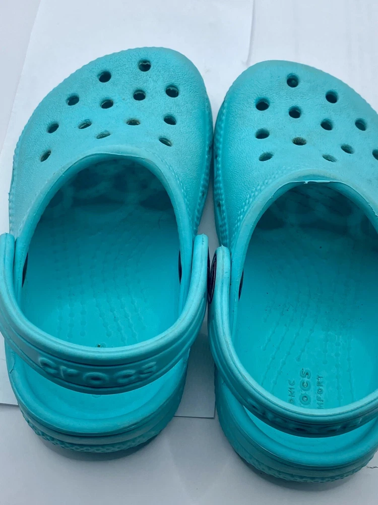 These Kids' Crock Clog are pre owned and well loved. They are a perfect addition to your child's wardrobe. The Teal color is sure to make a statement, and the C6 size ensures a comfortable fit for any unisex kid. The crocs are made with high-quality materials, ensuring durability and longevity. The clogs are part of the Baya Clog product line and are styled with a classic clog design that is both fashionable and functional. The shoes are perfect for any kid, regardless of their individual style. Purchase these pre-owned crocs with confidence, knowing that your child will love them.
