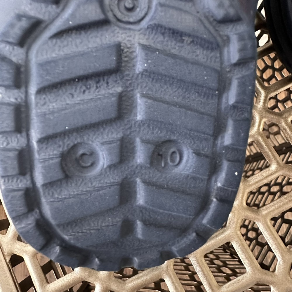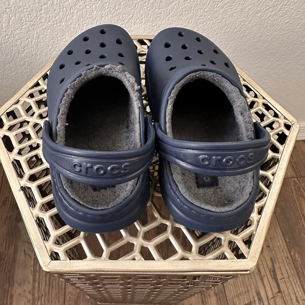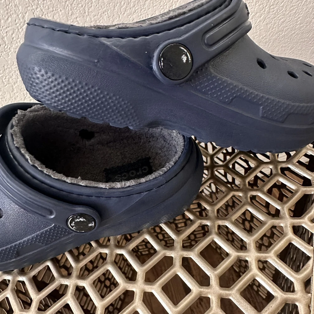The product is a pair of navy Crocs Classic Lined Clogs in size C9 for unisex kids. They feature a fuzzy gray lining, strap accent, and are designed as a clog style sandal. The shoes are part of the Comfort Slide product line and are suitable for US shoe size 10. see pictures. shows as is.