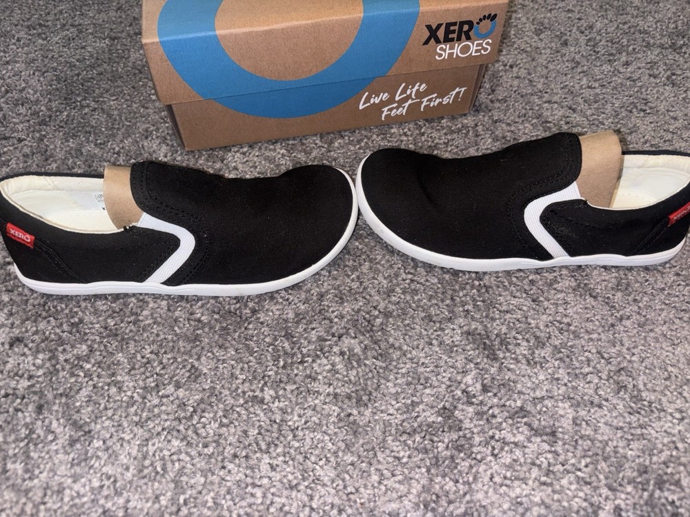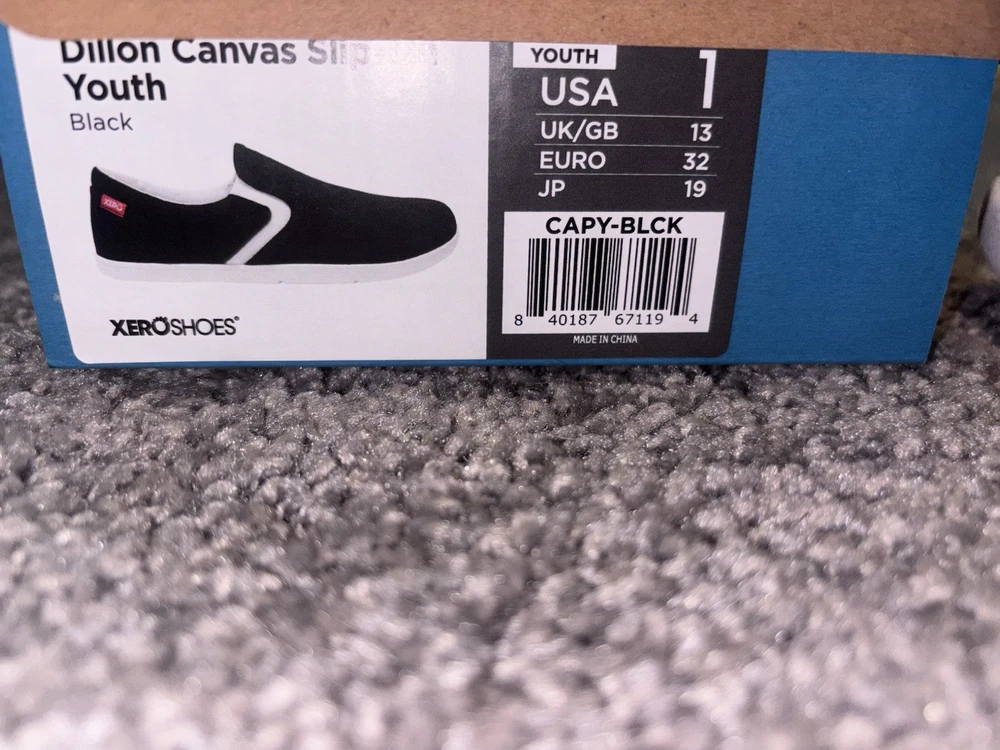 Daughter wore them once, but they were too narrow. The Kids Dillon Xero Shoes in black, size 1 youth, are a stylish and comfortable option for young children. With a round toe shape, pull-on closure, and flat heel style, these sneakers are perfect for casual wear. Made with rubber outsole material, they offer minimal cushioning for added comfort. The black color and unisex design make them versatile for both boys and girls.