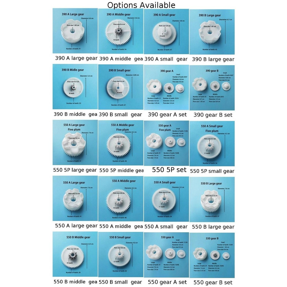 Gear Toy Car Children\'s Electric Car Drives For Gearbox Gear Plastic Acessories DESCRIPTION Product Description: brand new high quality Made of high quality material, Plastic gears for kids electric rc car 550 and 390 gearbox ride toy car Children's electric car large, medium and small gear motorcycle 390/550 motor motor gearbox gear stroller accessories Type: Children's electric car gear Dimensions: as picture shown Model:(optional) 550 5P set 550 5P large gear 550 5P middle gear 550 5P small gear 390 gear A set 390 A large gear 390 A middle gear 390 A small gear 390 gear B set 390 B large gear 390 B middle gear 390 B small gear 550 gear A set 550 A large gear 550 A middle gear 550 A small gear 550 gear B set 550 B large gear, 550 B middle gear 550 B small gear Package includes:(optional) Listing 1: 1* set of gears Listing 2: 1* gear Note: 1.The real color of the item may be slightly different from the pictures shown on website caused by many factors such as brightness of your monitor and light brightness. 2.Please allow slight manual measurement deviation for the data. POLICES Shipping Payment WARRANTY We only ship to confirmed ebay Order addresses. Please comfirm that your Order address is in line with your shipping address. Please kindly note that the c ombined shipping is not provided because the shipping fee is calculated by weight. Also, the each additional item means exactly the the same color and size. It takes about 7 -15 working days to US; about 10-30 working days to other countries. Transit time may be a little delayed because of the bad weather and customs inspection . If you do not receive your item within 30 working days since payment finished, please contact us immediately for further assistance. Payment must be completed within 5 days. If you have any problems about payment, please contact us via ebay message. We strive for 100% customer satisfaction! Positive Feedback is very important to us. If you have any questions, p lease feel free to contact us via "Ask seller a question" . We will reply your email within 24 working hours.