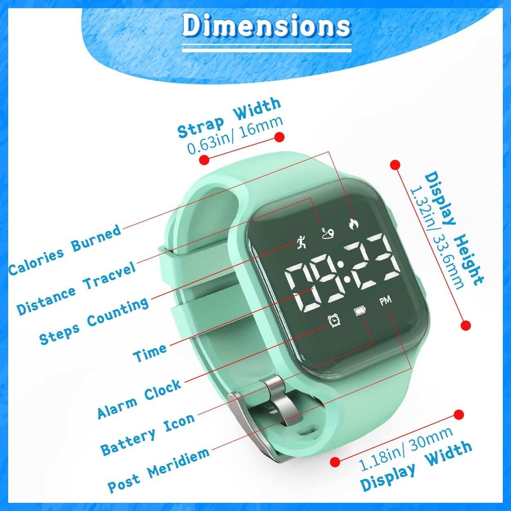 WATCH SIZE: Watch Width: 1.28in (32.5mm) Display height:1.32in (33.6mm) Band Length: 9in (230mm), suit for circumference 5.5-7.36in(133-185mm) wrist girth to wear Band width: 0.63in (16mm ) 【Accurately Tracker Your Steps】: Non-Bluetooth Steps counter, No smartphone or APP connection required; The watch will track kids activity steps and calories burned, it encourage children to exercise actively, and stay healthy and active. 【Comfortable and Skin-friendly Material】: Environmentally Kids-friendly food grade silicone strap, comfortable to wear, soft texture, very suitable for children to wear. 【Alarm Clock Reminder】: Remind children to get up or study. The watch will remind you by vibrating your wrist, will not disturb others, which is very suitable for students. 【Great Gift for Kids Teens】:It is a very functional and stylish watch, perfect for kids and teens. This will be a great Birthday, New year, Christmas gift for boys, girls and teens (Suitable for children and teens aged 6-16 ). 【After Sales Service】: If you have any questions about the product, please feel free to contact us, we will provide 12months warranty service and give you a satisfactory solution.