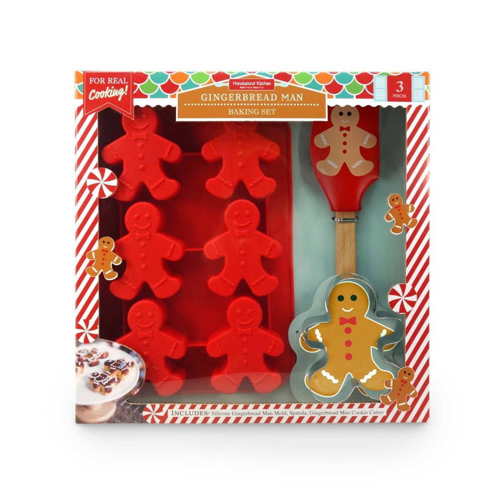 Bake Some Holiday Fun with Gingerbread Man Set Run, run, as fast as you can, to catch this gingerbread man baking set! Make holiday baking a yearly tradition making gingerbread man-shaped treats with this 3-piece baking set for real kitchen use. Featuring a gingerbread man silicone baking mold, cookie cutter and spatula, you'll have everything needed to make gingerbread man cupcakes, muffins, cookies, frozen treats, chocolates, ice cubes, crayons, soaps, and more. A fun activity for the whole family!. Makes a great gift, too. 3-piece set includes: 1 silicone cupcake mold with 6 gingerbread man shapes, 1 silicone spatula, and 1 gingerbread man stainless steel cookie cutter. Features materials that are reusable and made to last Visit Our Store Contact Us Gingerbread Man Baking Set Bake Some Holiday Fun with Gingerbread Man Set Run, run, as fast as you can, to catch this gingerbread man baking set! Make holiday baking a yearly tradition making gingerbread man-shaped treats with this 3-piece baking set for real kitchen use. Featuring a gingerbread man silicone baking mold, cookie cutter and spatula, you'll have everything needed to make gingerbread man cupcakes, muffins, cookies, frozen treats, chocolates, ice cubes, crayons, soaps, and more. A fun activity for the whole family! Makes a great gift, too 3-piece set includes: 1 silicone cupcake mold with 6 gingerbread man shapes, 1 silicone spatula, and 1 gingerbread man stainless steel cookie cutter Features materials that are reusable and made to last Silicone mold is oven, freezer, microwave and top-rack dishwasher safe, and temperature safe from 40 degree F to 428 degree F (-40 degree C to 220 degree C) Spatula and cookie cutter are top-rack dishwasher safe, too Recommended for ages 6 and up Dimensions: Cupcake Mold: 7" x 1.25" x 10.25" Cookie Cutter: 3.62" x 1.12" x 4" Spatula: 11" Box: 11.88" x 1.88" x 11.44" Weight of Set: 0.91 lb More About Handstand Kitchen's Products Feature premium quality bakeware and cooking utensils designed to be safe and comfortable for kids ages 6 and up Durably crafted for real kitchen use Reusable and made to last Made to equip chefs of all ages to make their own (healthier than store bought) sweet treats The bright colorful molds inspire kids and adults to come together baking treats that are easy to make and fun to decorate Get creative using the silicone molds for making chocolates, frozen treats, bath bombs, crayons, DIY crafting projects and more Great for gift-giving - birthdays, holidays or just for fun anytime! More About Handstand Kitchen's Products Feature premium quality bakeware and cooking utensils designed to be safe and comfortable for kids ages 6 and up Durably crafted for real kitchen use Reusable and made to last Made to equip chefs of all ages to make their own (healthier than store bought) sweet treats The bright colorful molds inspire kids and adults to come together baking treats that are easy to make and fun to decorate Get creative using the silicone molds for making chocolates, frozen treats, bath bombs, crayons, DIY crafting projects and more Great for gift-giving - birthdays, holidays or just for fun anytime!