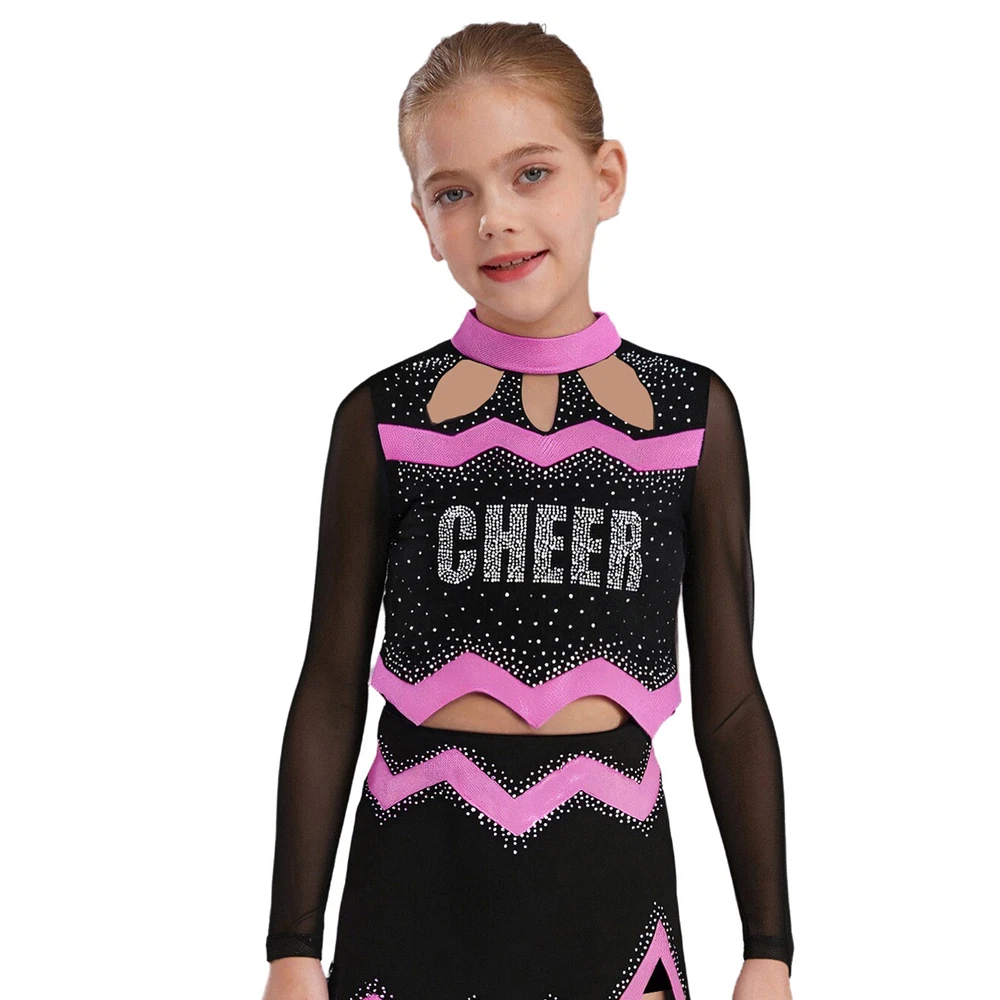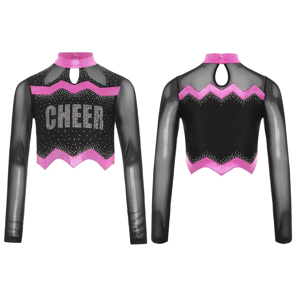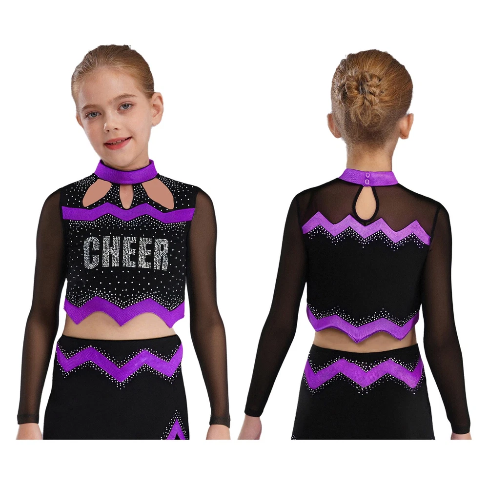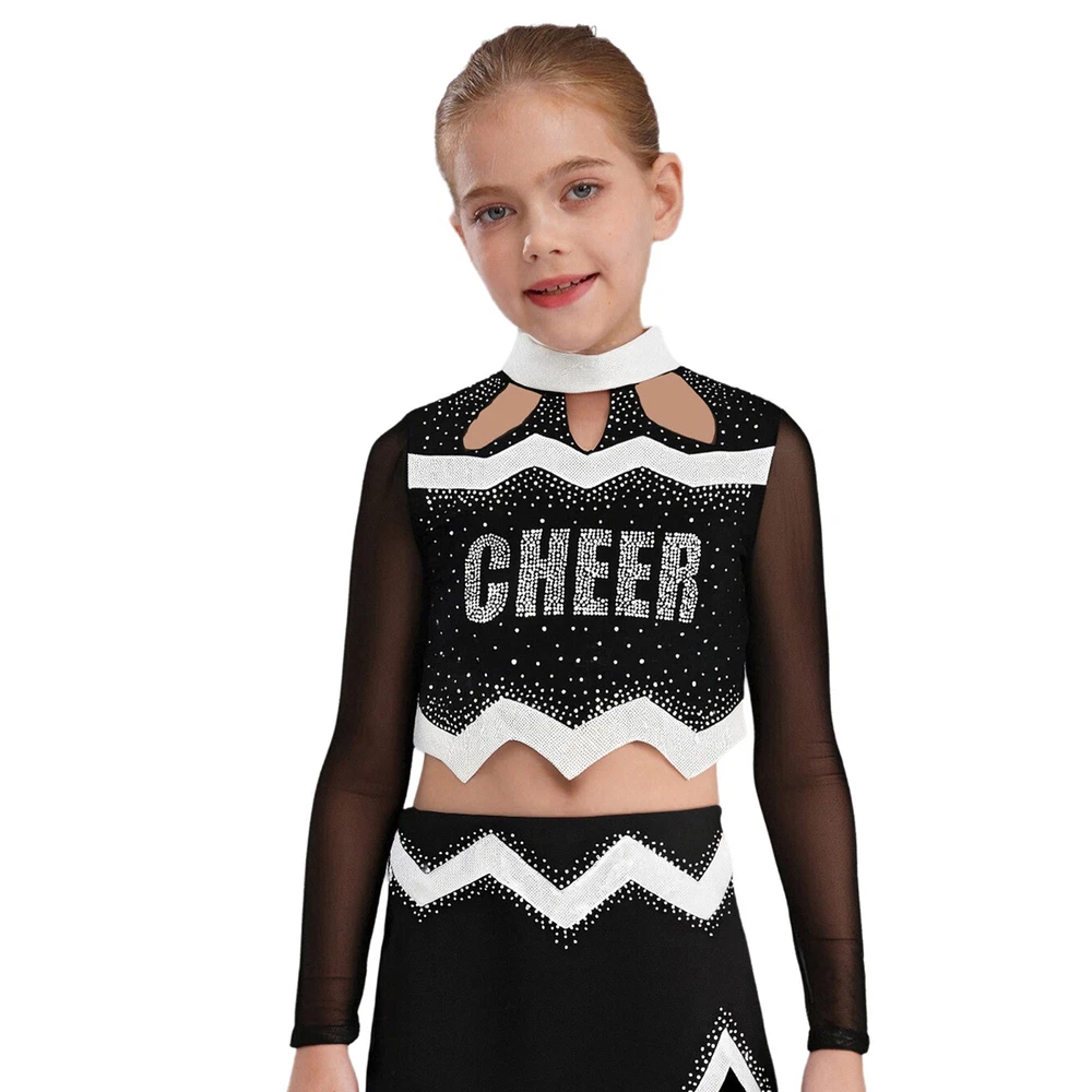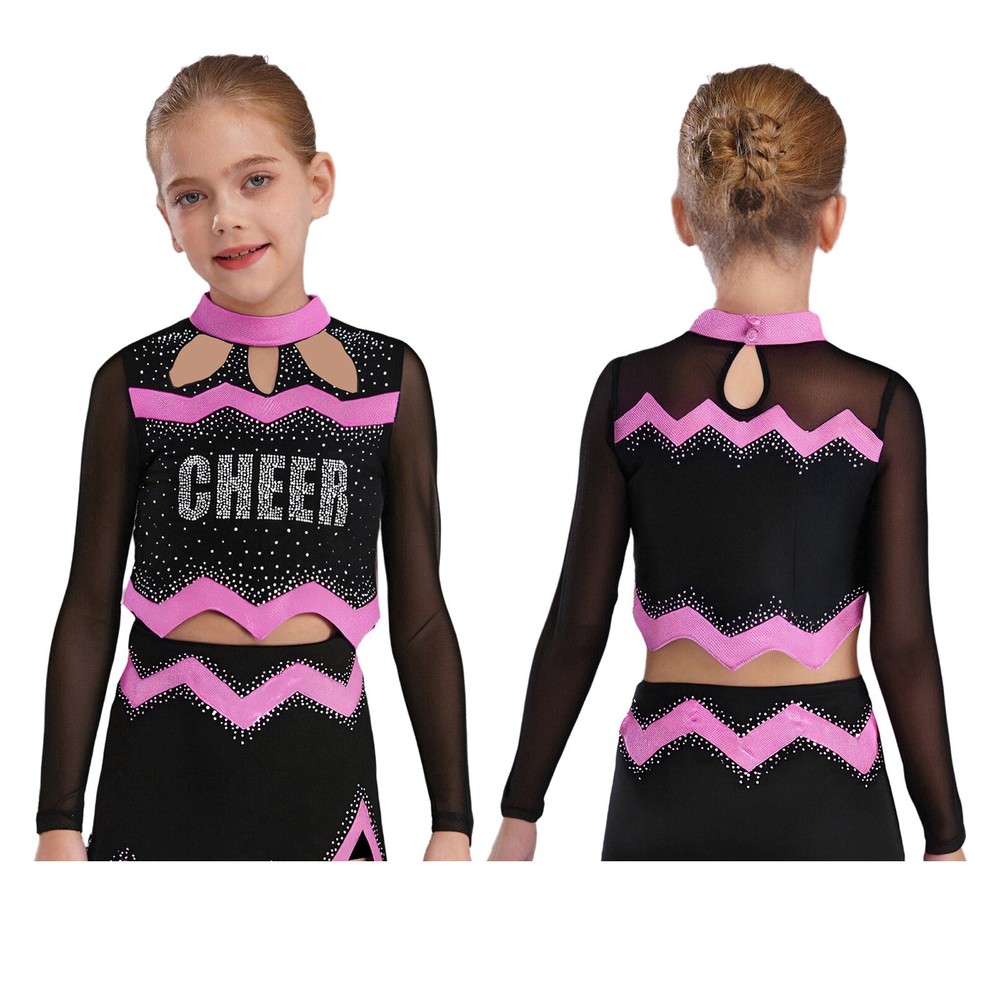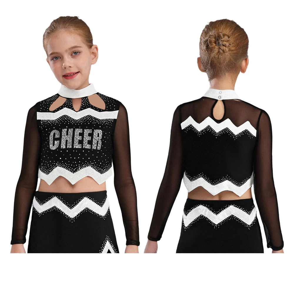 Kids Girls Cheer Leader Dance Shirts Sparkly Rhinestone Long Sleeve Crop Top