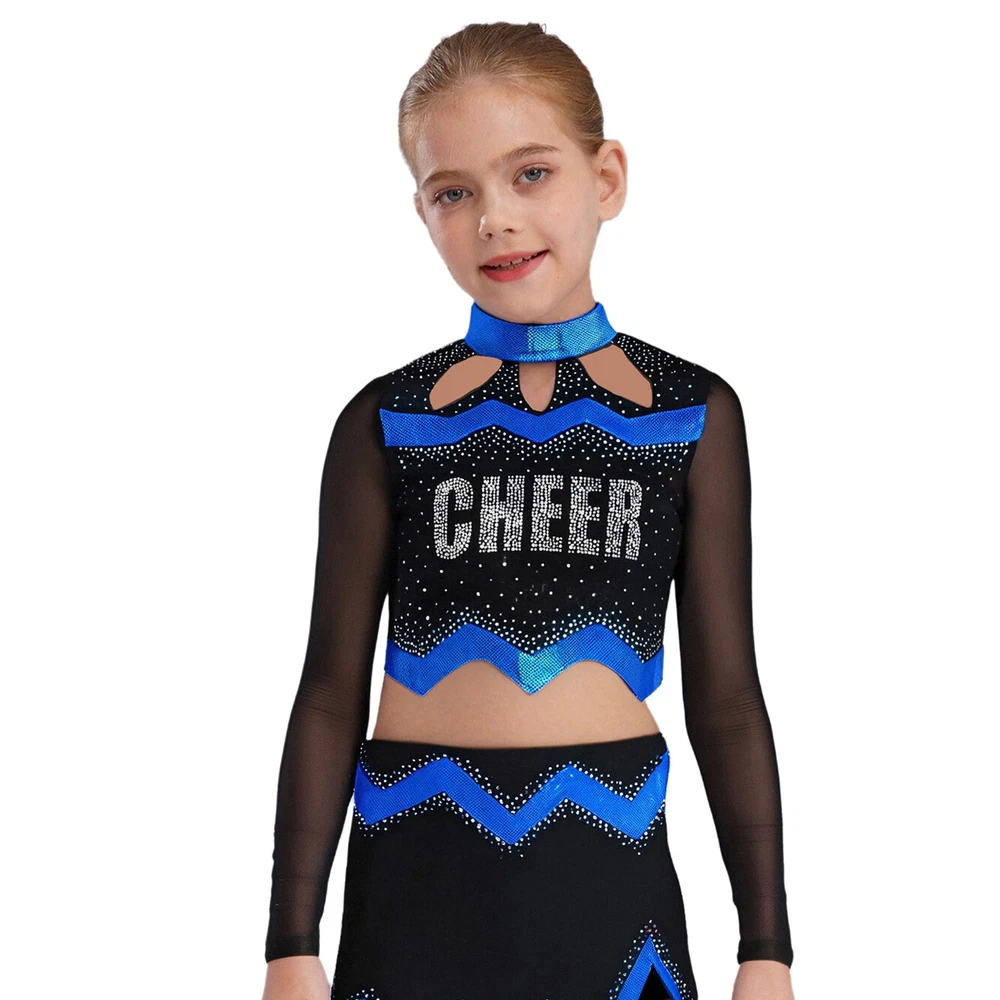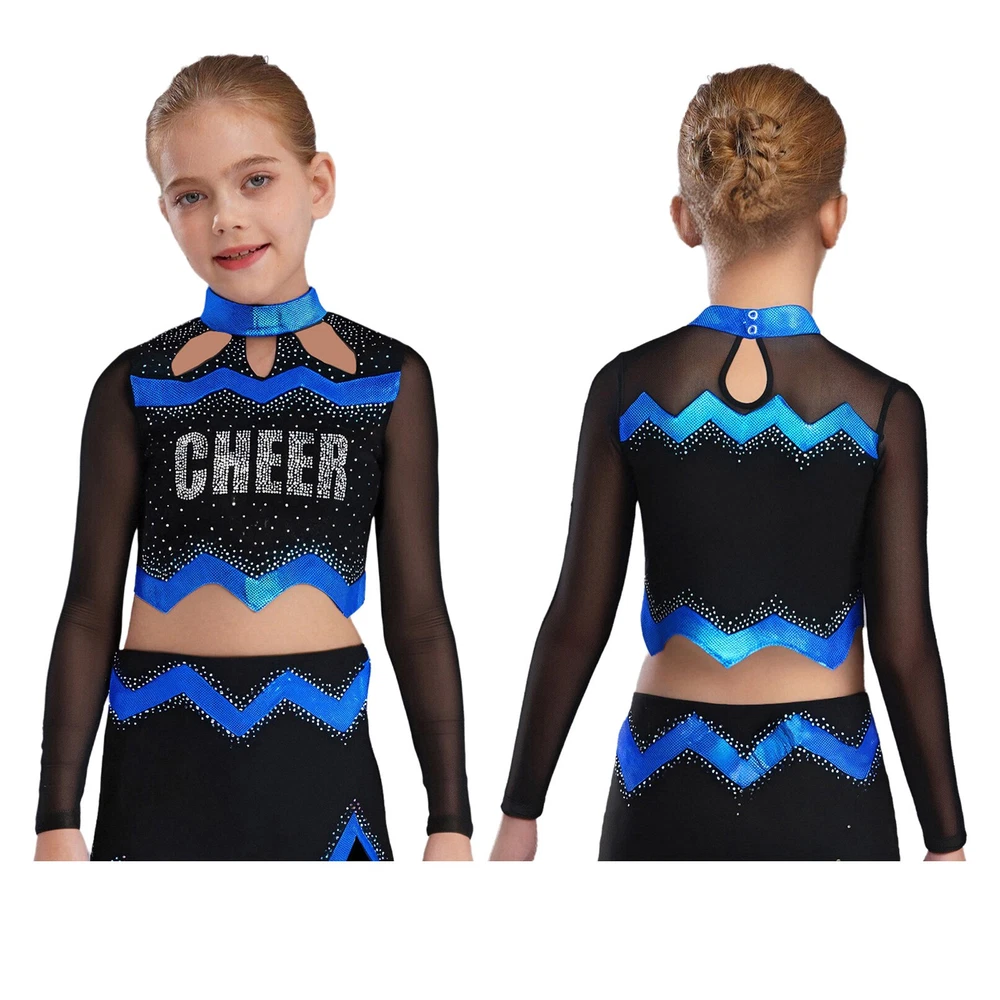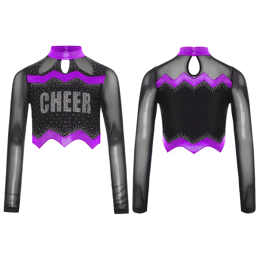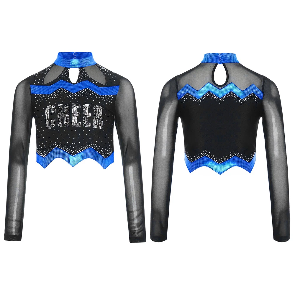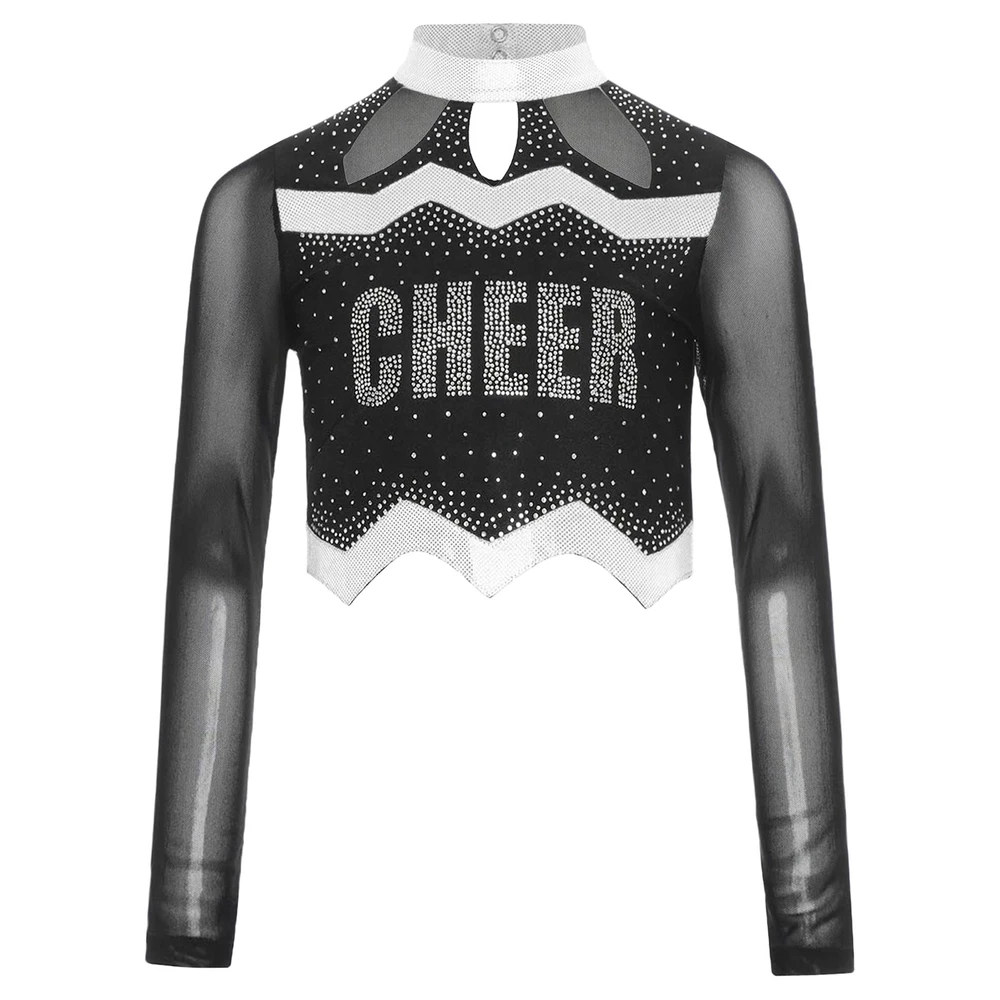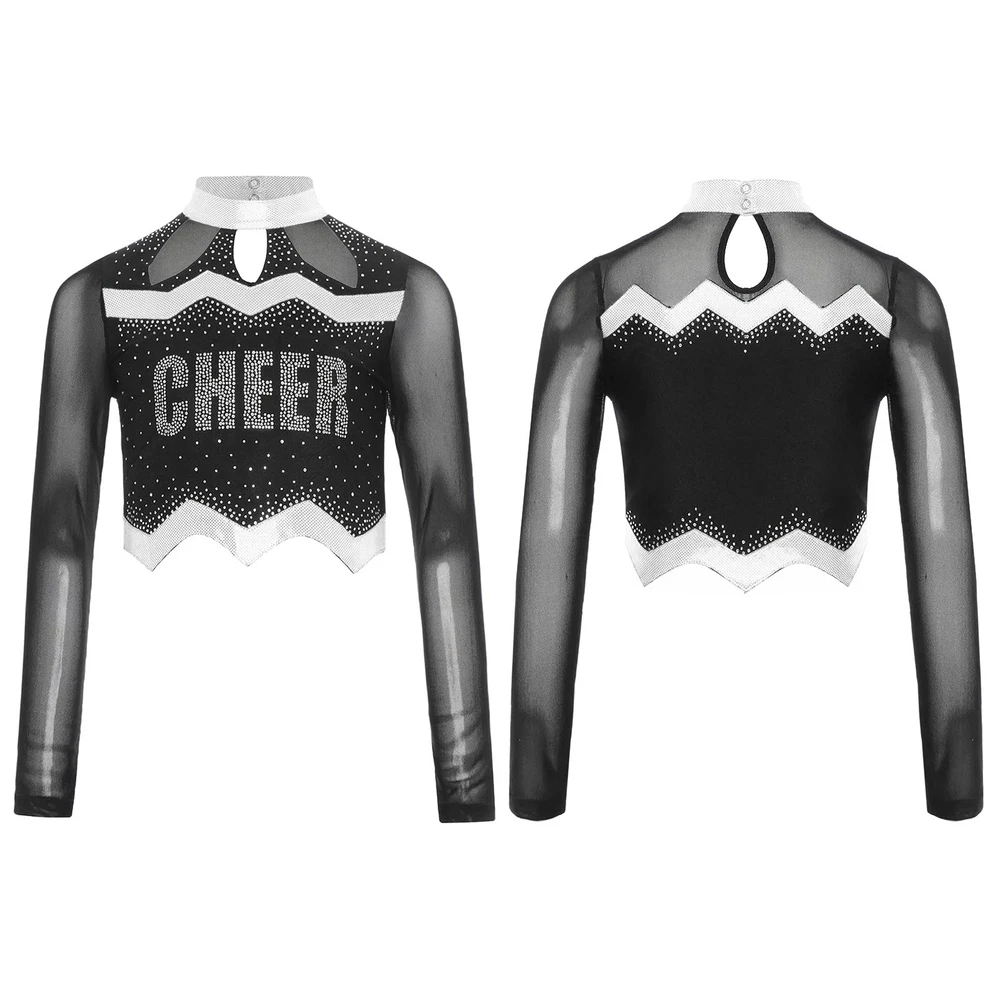 Kids Girls Cheer Leader Dance Shirts Sparkly Rhinestone Long Sleeve Crop Top