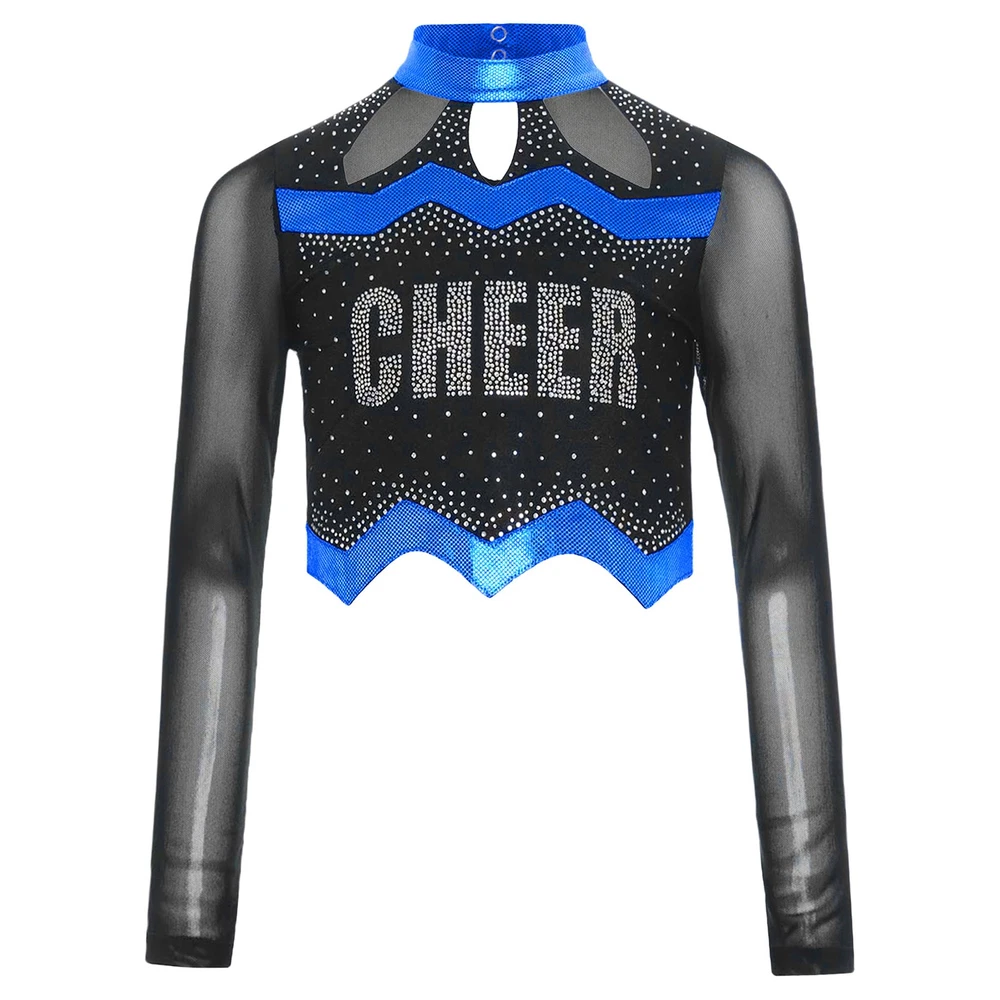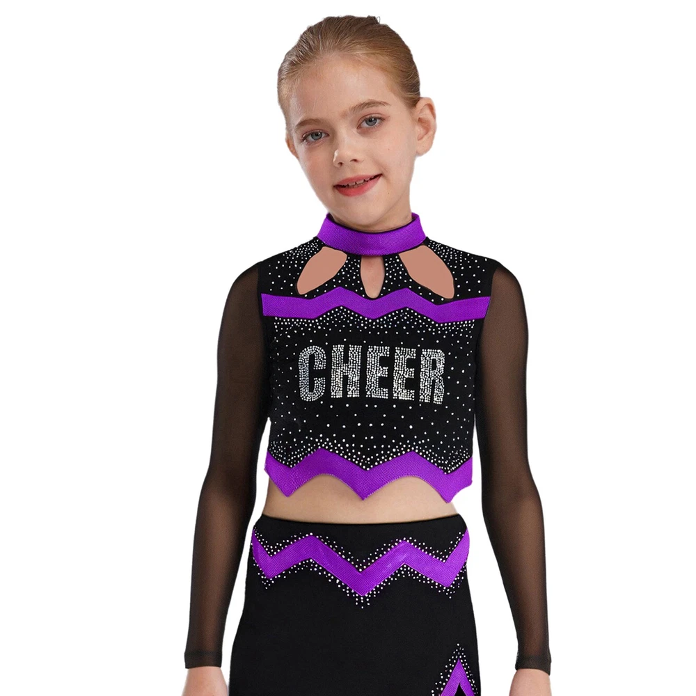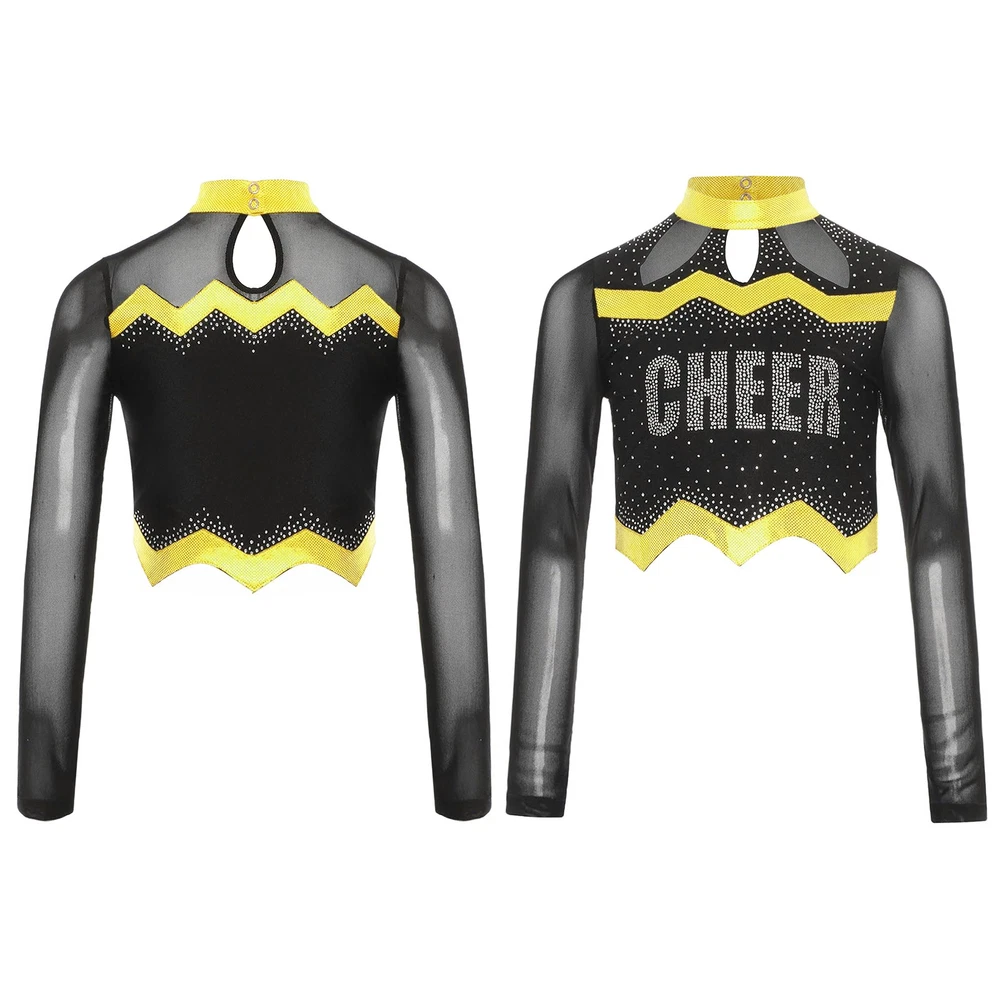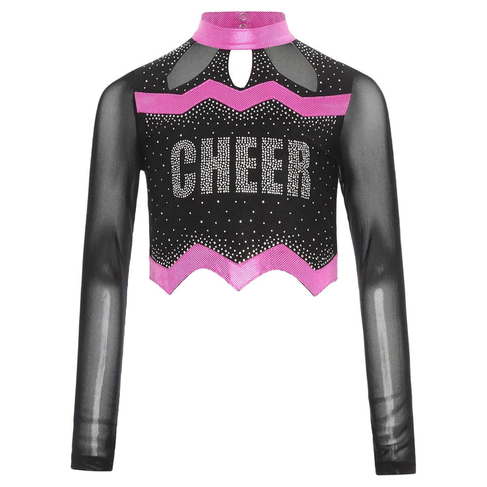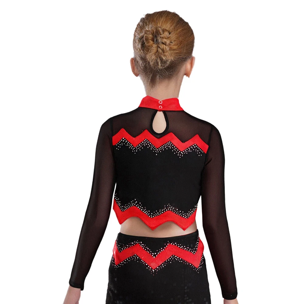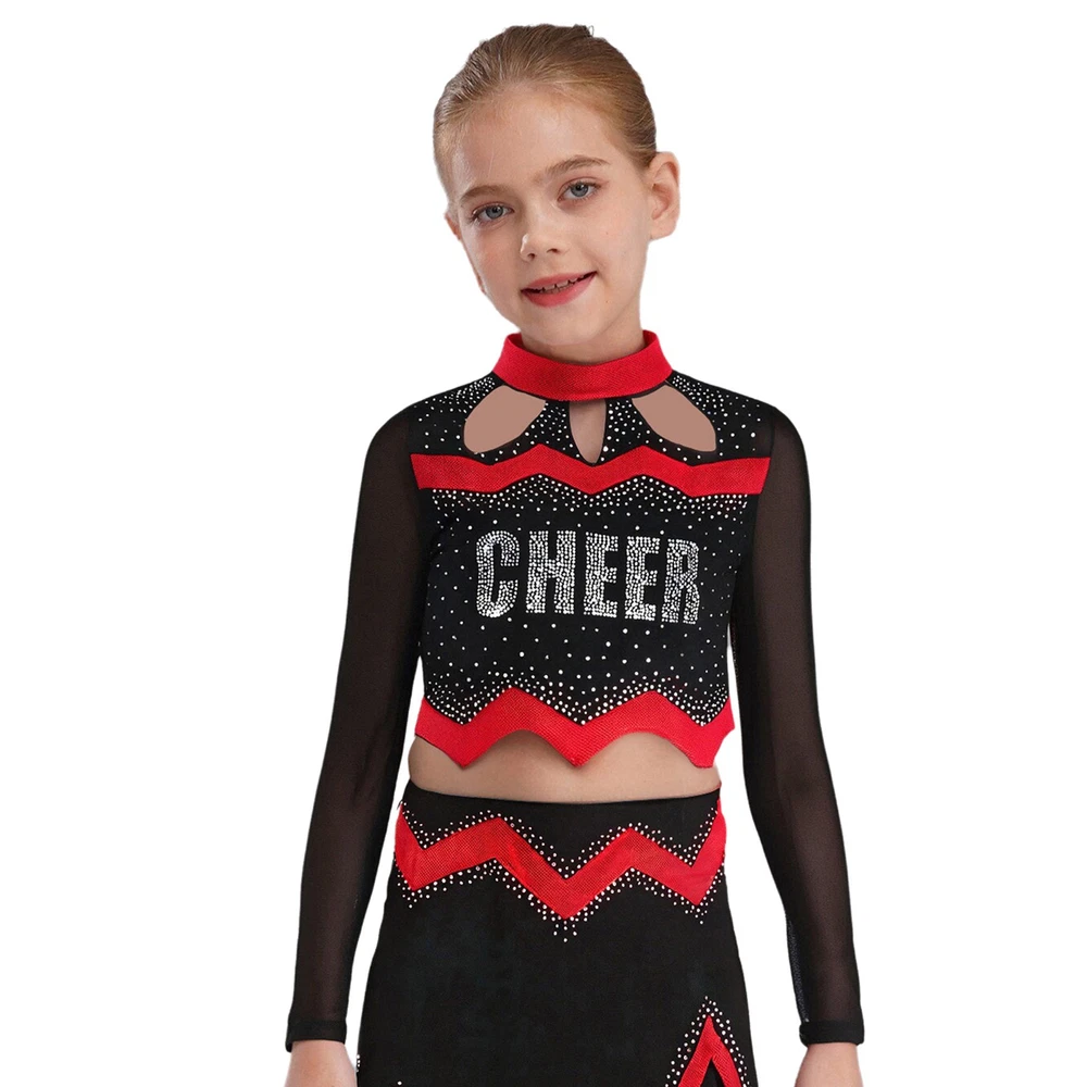 Kids Girls Cheer Leader Dance Shirts Sparkly Rhinestone Long Sleeve Crop Top