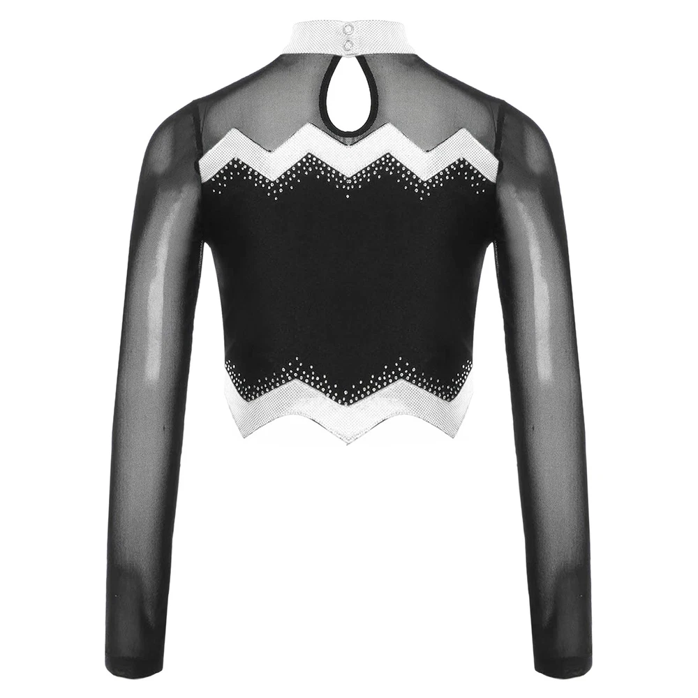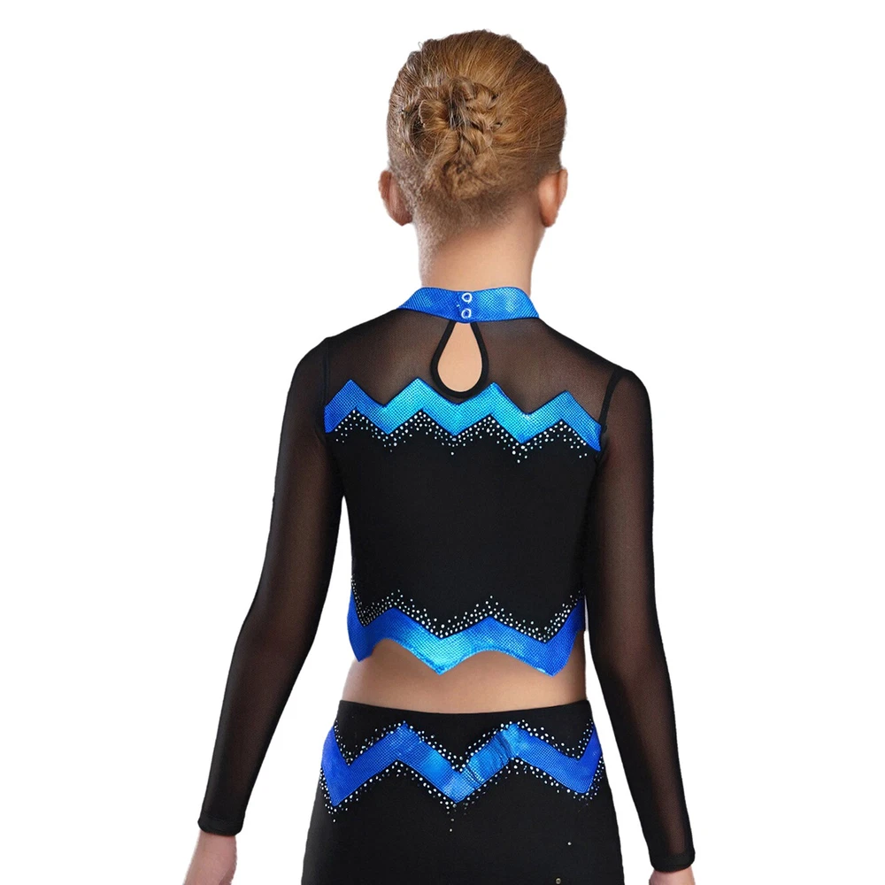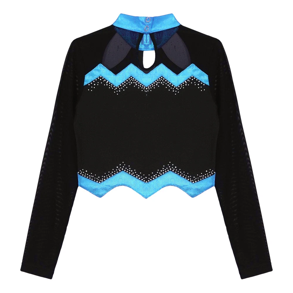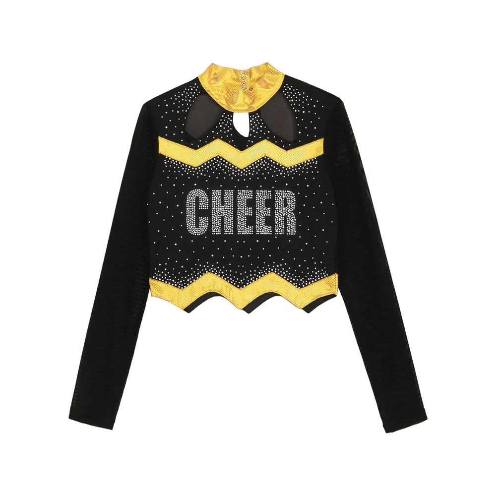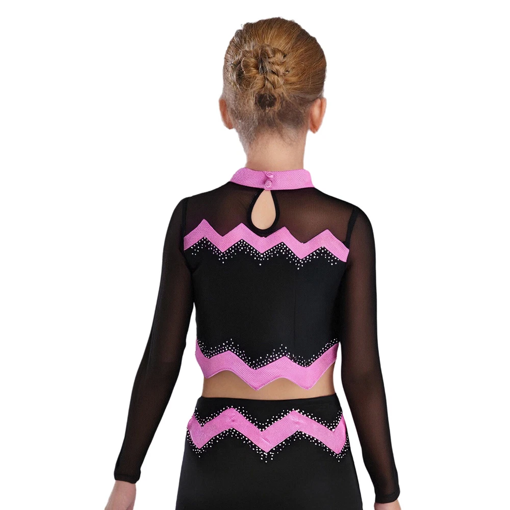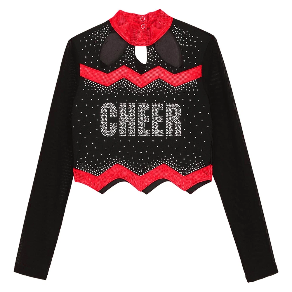 Kids Girls Cheer Leader Dance Shirts Sparkly Rhinestone Long Sleeve Crop Top