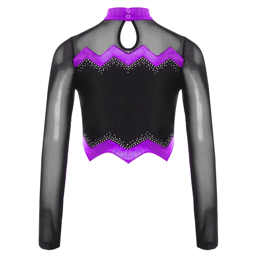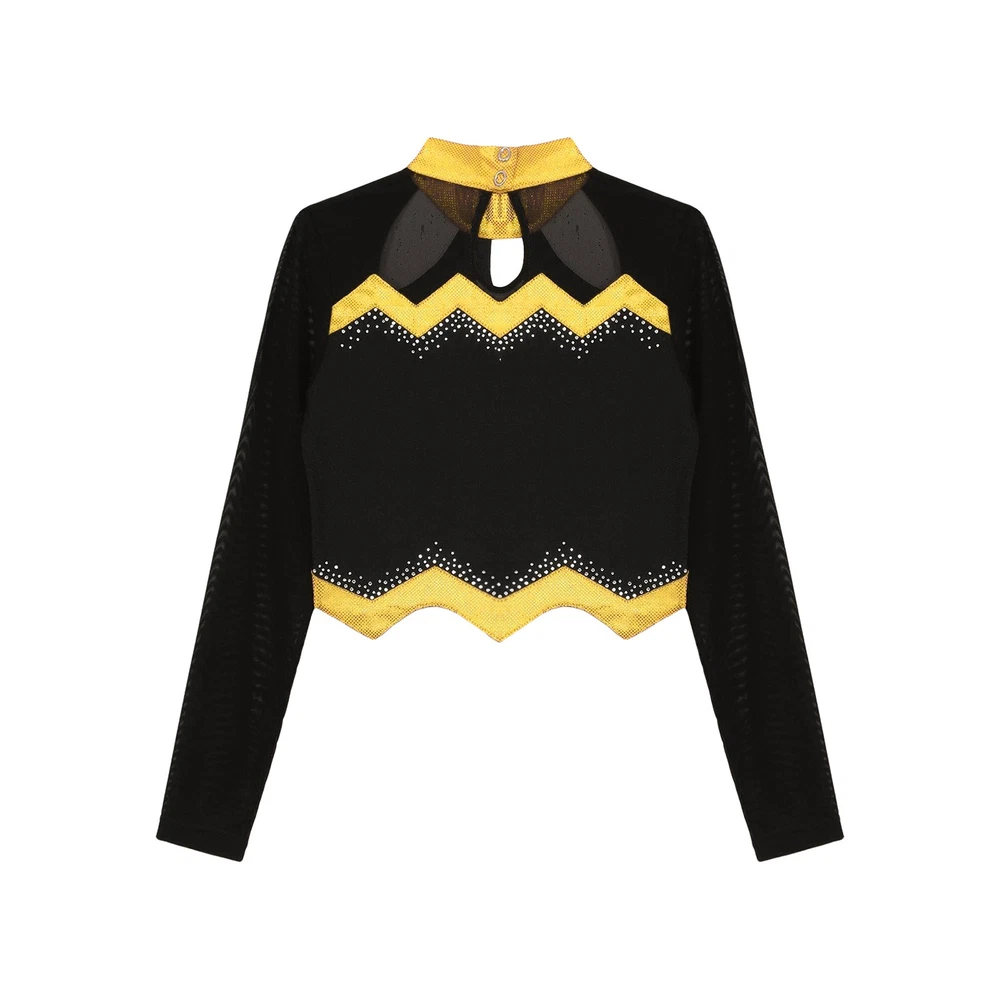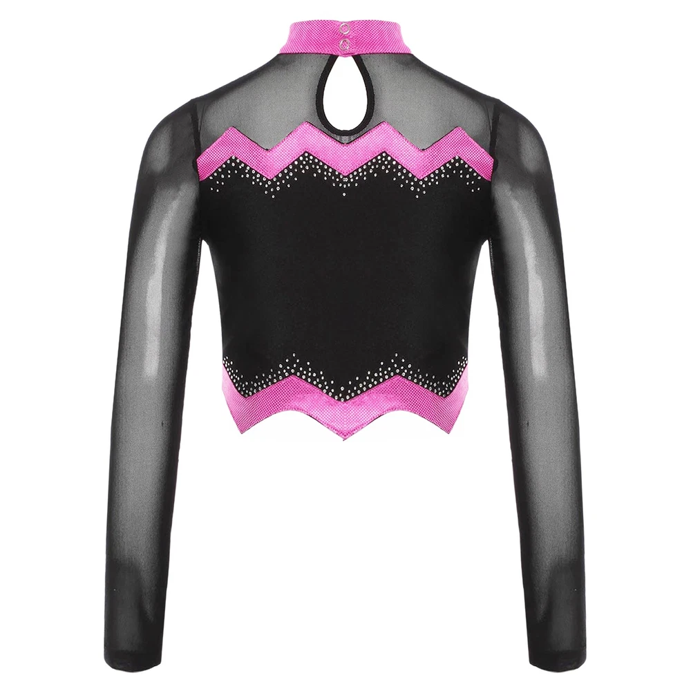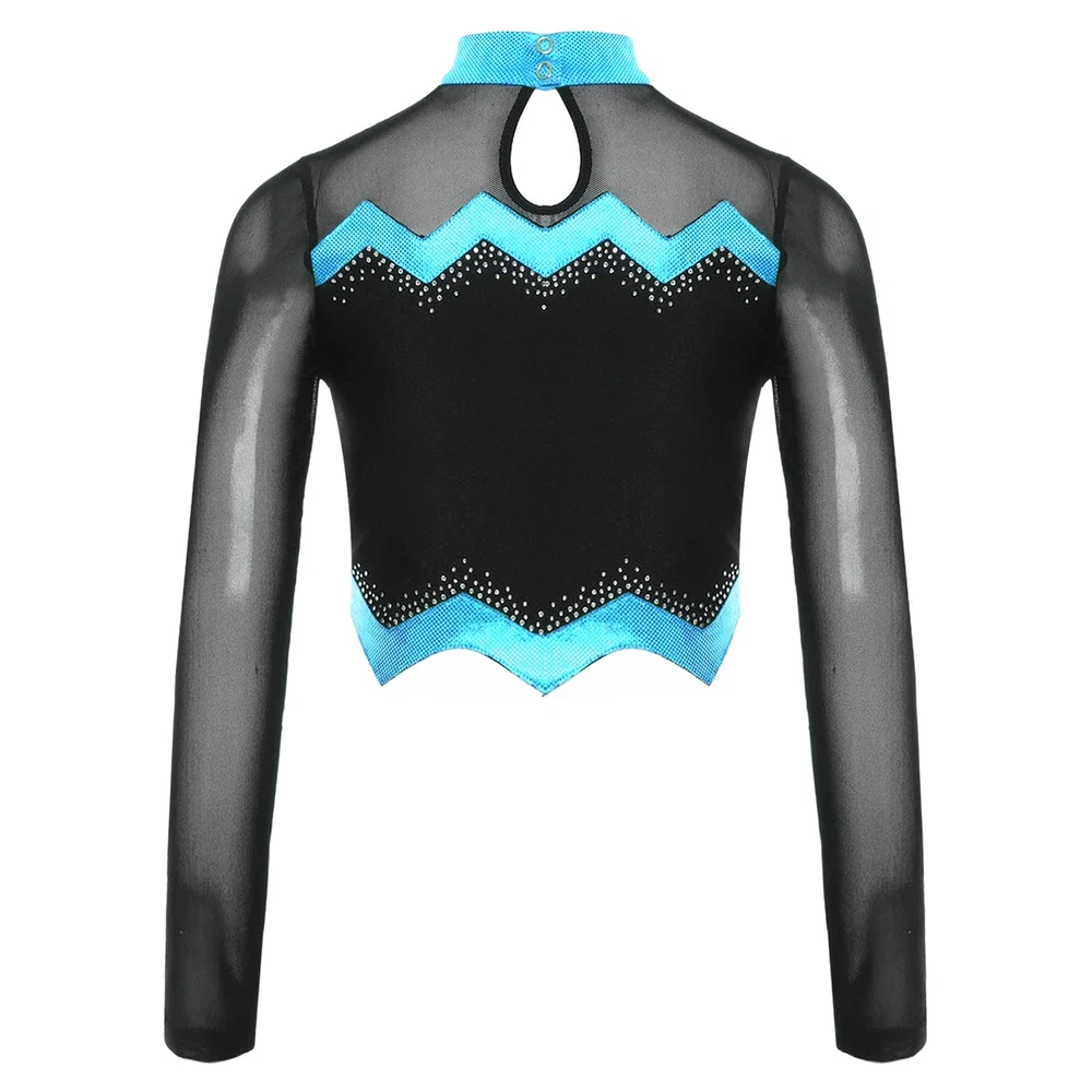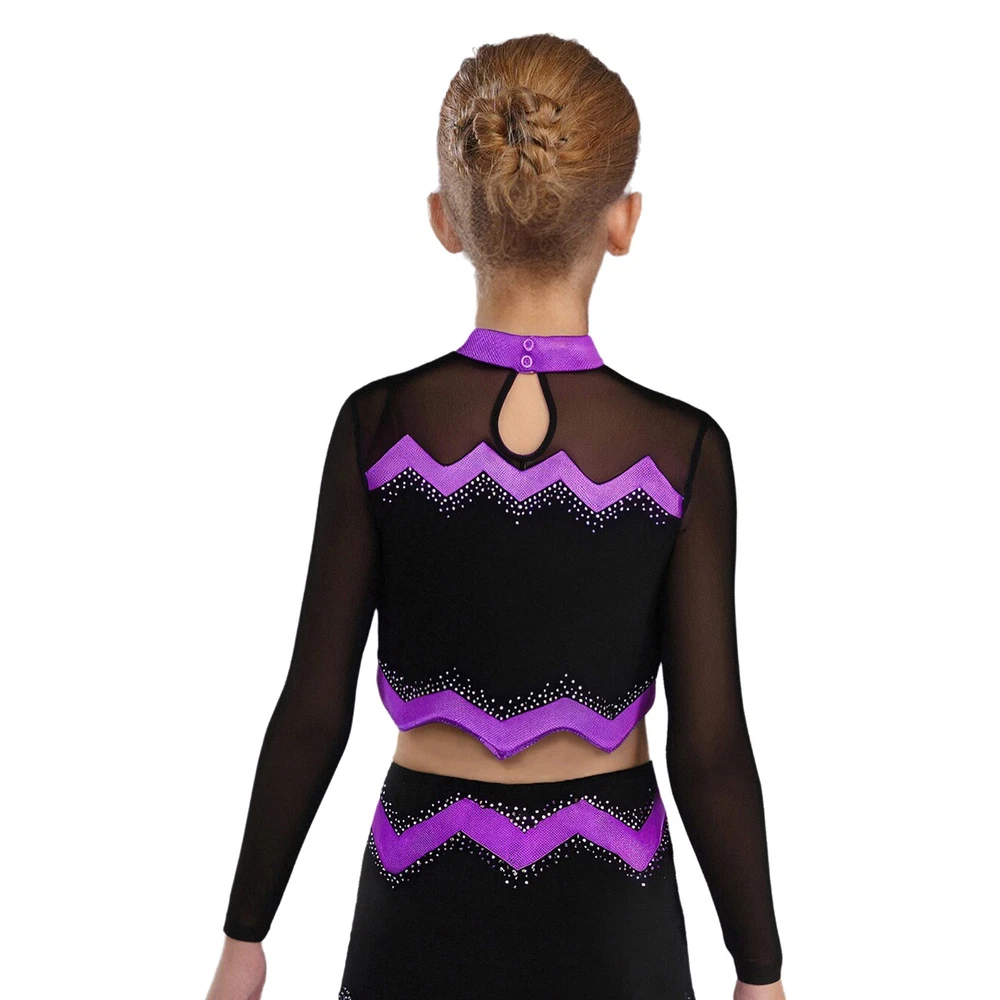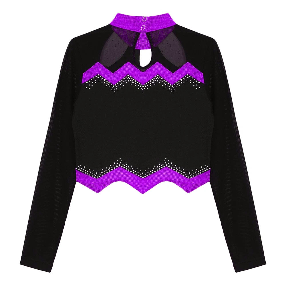 Kids Girls Cheer Leader Dance Shirts Sparkly Rhinestone Long Sleeve Crop Top