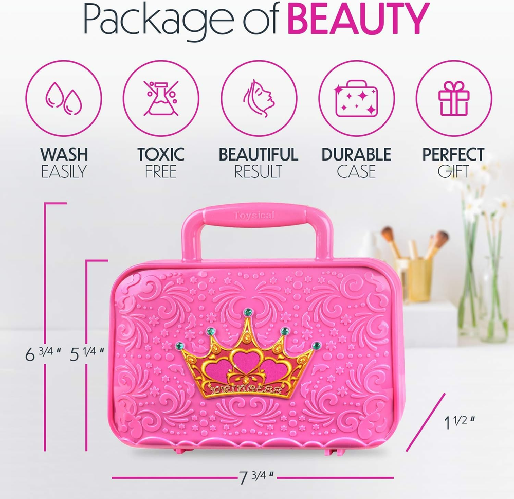 Princess Fairy Collection: Toysical Girls Real Makeup Set is the perfect Christmas gift for your princess, little girls & toddlers, ages 3, 4, 5 & 6 years old. Beautiful pink exterior case for on the go traveling. Fashion Makeup Kit For Kids Includes: 4 Blush Powders, 6 Eyeshadow Powder, 4 Blush Creams, 1 Nail Polish, 1 Lipstick, 2 Brushes, 2 Glittery Lip Gloss, 3 Eye shadow Sticks, 1 Nail Filer, 1 Fake Nails Set, 1 Nail Sticker Sheet, 1 Toe Separator+ 1 Makeup Remover tube. Includes a variety of Blush, Rose & Hot Pink, Purple, Blue, Green & Gold colors. Child Safe: We had your child’s safety in mind! Our Cosmetics Play Sets has been safety tested to ensure safe play for your little ones, which is why parents everywhere trust our non-toxic kid makeup & non-toxic nail polishes for girls. Bonus Makeup Remover: Toysical Makeup for Kids is WASHABLE + includes a bonus make-up remover tube that will do a great job! We recommend being used under parental supervision! Pretend Play Toy: Just let her mind wander!! Our real kid’s makeup is a great toy for children’s play dates, pretend play, teens first make up kit, little makeup for beginners & fun gift idea for Birthdays, Christmas and Valentine’s Day. Let her feel like a professional makeup artist! Product Description