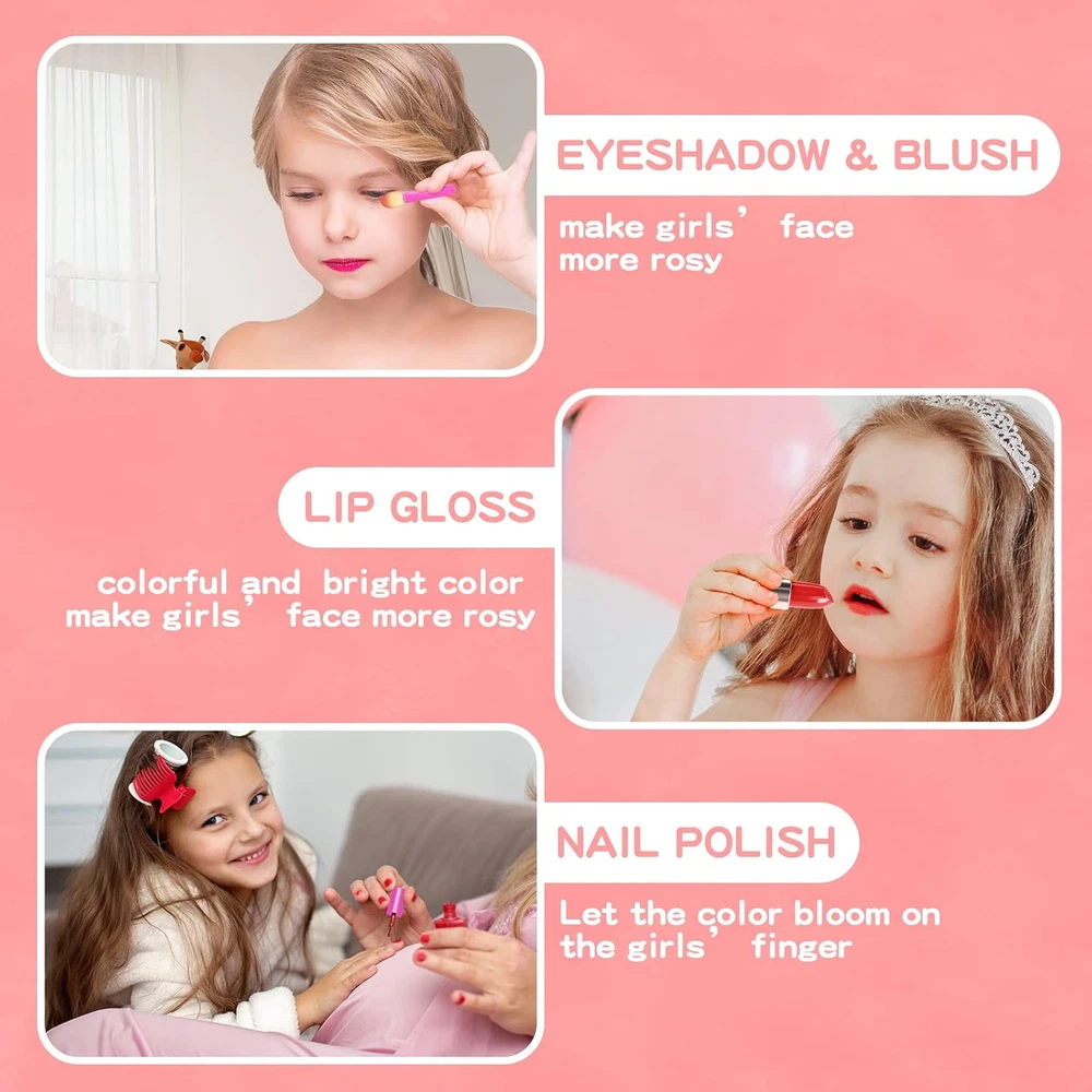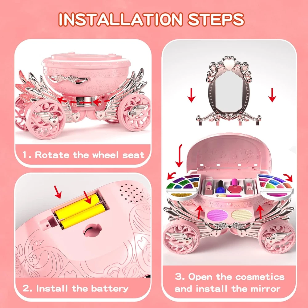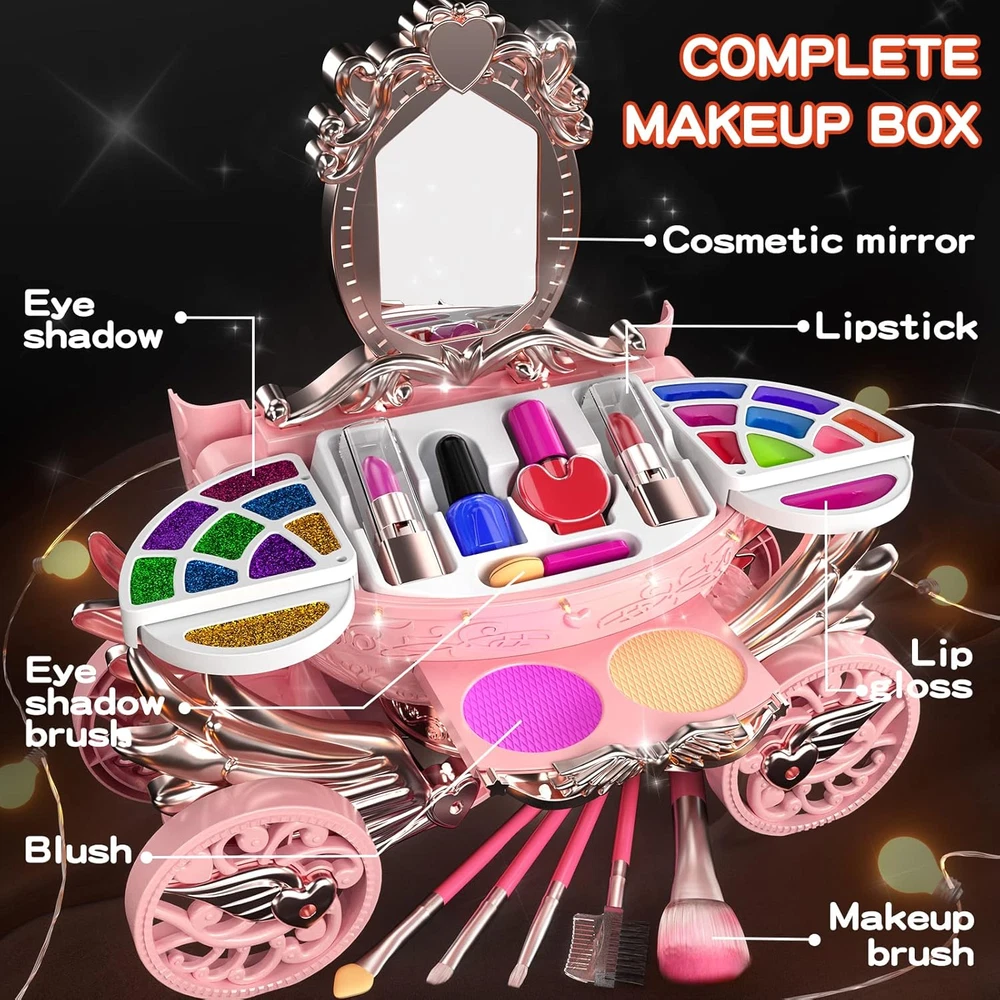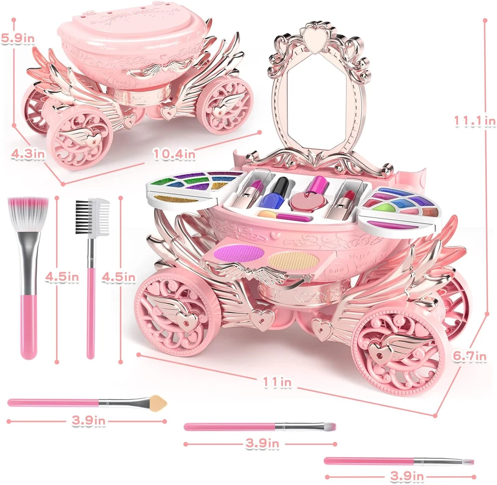 GIRL'S REAL MAKEUP SET - Kid makeup kit include an exquisite makeup vanity car with eyeshadow palette,lip gloss,lipstick,blush,tear-able nail polish, makeup brushes X5 and mirror. The girls makeup kit can meet children's curiosity about beauty. WASHABLE & NON-TOXIC - Children's washable makeup set for little girls are soft and compatible with skin. Dress-up toy set is made of water-soluble material, which can be washed with soap and water. Please use them with confidence. DURABLE AND STORAGE - Cute little girl makeup can collect decentralized cosmetics toys. It is convenient to carry, little girls can bring their beloved makeup toys anywhere, such as , dressing party. LIGHT AND MUSIC EFFECT - Open the drawer of the pumpkin car, you will enjoy the flashing lights and music. Little ones have an innate curiosity about everything grown-up. With this pretending toy, children can imitate mothers to dress up and enjoy the fun of role -playing. Ideal toddler toys for age 3-4. IDEAL GIFT FOR PRINCESS - The toddler girl toys encourage kids to play their ideas and make the first try on makeup. Great Gift Idea For Girls of any age! This dollhouse as a birthday party, christmas, holiday or party gifts for 3 4 5 6 7 8 year old boy and girls. Product Description Gift or Girls of Any Age! This make up toy as a birthday party, christmas, holiday or party gifts for 3 4 5 67 8 year old boy and girls. Meantime,it can be played at home, outdooror as a part of the science project at school. This is a gift to every girl that has aprincess dream in her heart! Product Size When the makeup box is opened: 11 × 6.7 × 11.1 in When the makeup box is closed: 10.4 × 4.3 × 5.9 in Makeup brush: 4.5 in Makeup brush: 3.9 in