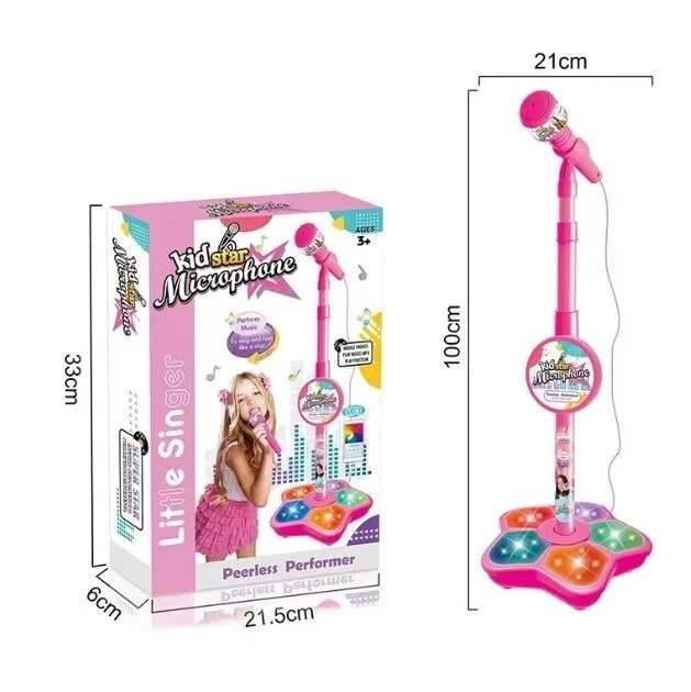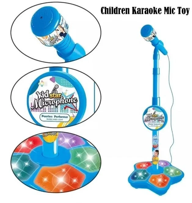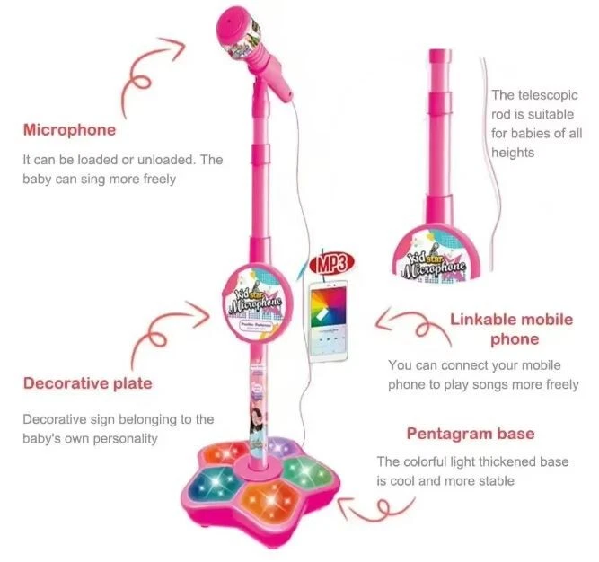 Description: Material: Plastic + Electronic Components Power By: 3*AA Battery(Not Included) Package: Microphone x 1 Features: 1. This microphone in fine workmanship and cute modeling has great appeal to kids. 2. Stand type microphone design lets kids sing enjoyably as a singer on the stage. 3. Multifunction brings kids more fun. 4. The microphone can change songs and be connected with MP3 player or phone to play more music. 5. Light Effect makes the microphone look more cool and interesting. 6. The height of the stand is adjustable, can perfectly fit for different ages of kids. 7. The product supports volume control, and is convenient to install, which is the good gift for your kids.