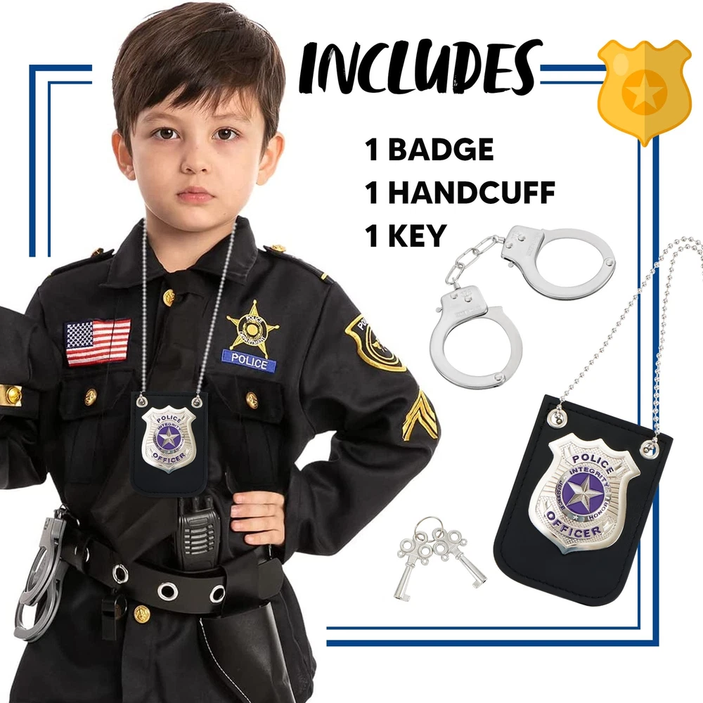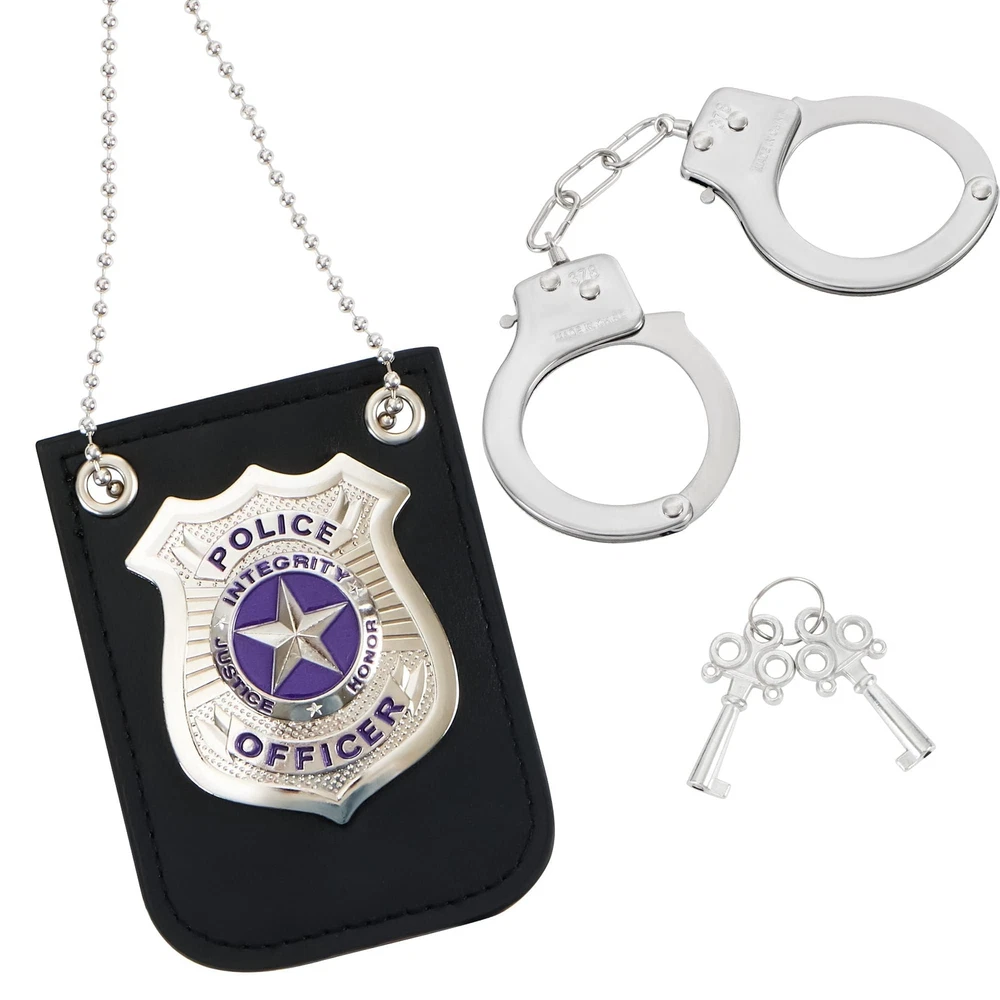 SUPER VALUE PACK. Our Police Pretend Toy Silver Accessories Set includes handcuffs, Keys, and Police Badge. This Police Pretend is a high-grade toy made of high quality material with well polished, no rough edges, and hefty and sturdy. UNIQUE DESIGN & EASY TO USE. Police Pretending Toys is a range of toys for children to play with. They include police cosplay, detective role playing, classroom dressing up, Halloween party supplies, and Christmas stocking stuffers among other things. ENDLESS FUN. This Toy is Perfect for Police Role-Playing parties, Halloween parties, birthday parties and dress-changing parties that need props for all kinds of parties. Police game toy is the perfect birthday gift, photo prop, cosplay accessory, cosplayer accessory, police game toy, costume accessory, etc. PREMIUM QUALITY. Child Safe: Non-Toxic. Meet US toy standards. Safety test approved. EXCEPTIONAL CARE: We're big on the little things. That's why customer safety and satisfaction are at the heart of everything we do. Contact us if products don't meet your expectations. We look forward to ensuring every moment brings you joy.