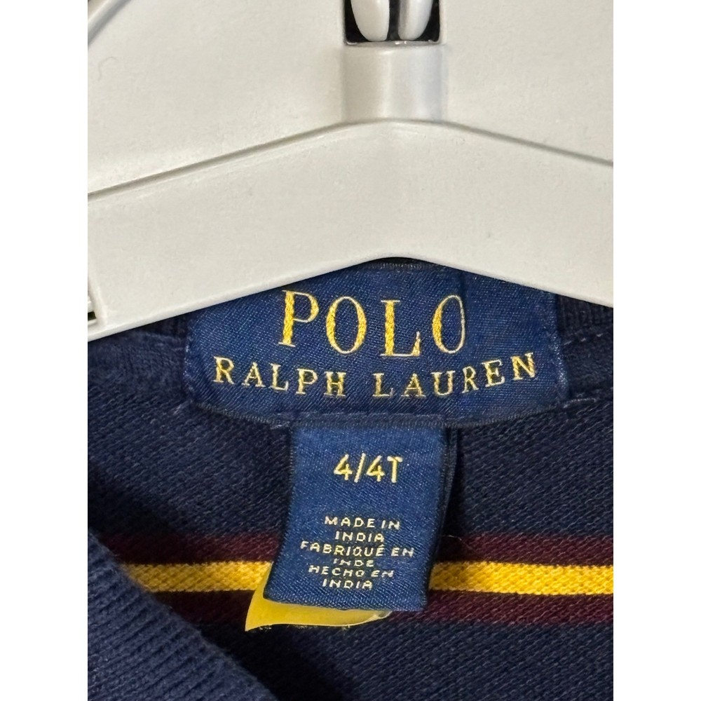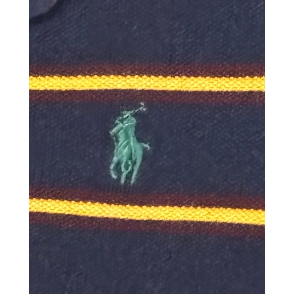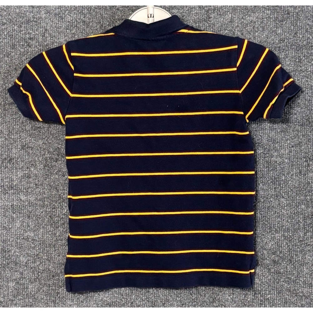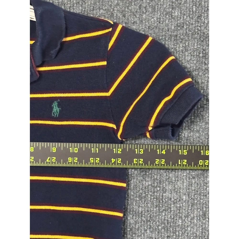 Brighten any day with this vibrant Polo Ralph Lauren polo shirt. Bold navy and sunshine yellow stripes create a playful yet classic look perfect for your little one. The iconic green Polo Player logo embroidered on the chest adds a touch of timeless style. This comfortable and durable polo is ideal for everyday adventures, playground fun, or family gatherings. Measurements: • Chest (pit to pit): 13 in • Length (shoulder to hem): 17 in Department: Boys Type: Polo Sleeve Length: Short Sleeve Closure: Button Fabric Type: Knit Performance/Activity: Golf, Tennis, School Pattern: Striped Material: Cotton Neckline: Collared Style: Pullover Features: Breathable, Easy Care, Contrasting Trim Fit: Classic Accents: Logo, Button Collar Style: Point Keywords: Polo Ralph Lauren, kids polo, boys polo, striped shirt, preppy, classic, short sleeve, summer, casual, playground, school, activewear