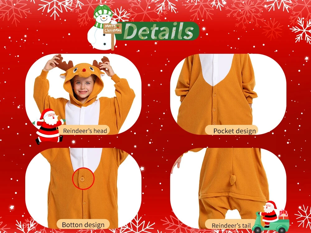 This Christmas, let's make our homes a haven of warmth, laughter and unforgettable memories - all in these festive Reindeer one-piece pajamas. Our Reindeer Onesie is crafted from soft, skin-friendly fabric, meticulously tailored to encapsulate every detail, as if wrapping you in the warmth and serenity of the northern forest. Details The hat is designed according to the real appearance of the reindeer.The eyes ,noses ,antler add a touch of whimsy and fun. Front button design in accordance with the adult reindeer pyjamas. At the same time easy to button,strict thermal insulation. On the back of adult reindeer costumes,there is a lovely reindeer tail. The pockets are designed to keep your hands free and warm at the same time. Occasions On chilly winter evenings,our Reindeer matching onesie for couples provide extra warmth and coziness.Whether watching a movie, reading a book,or simply relaxing in bed, the material keeps one comfortably warm. On lazy weekend mornings or afternoons, the Reindeer pyjamas are perfect for lounging around the house, doing nothing in particular, and simply enjoying the comfort of being cozy and warm. On holidays like Christmas or Halloween, our Reindeer one-piece cosplay sleepwears add atmosphere to a simple holiday.You can wear it to take fun photos with your family and make many fantastic memories. When you just need to run a quick errand, like checking the mailbox or grabbing a few items from the store, the pajamas can serve as a casual and comfortable outfit. Our adult Reindeer suits are also the best gifts for lovers, family and friends during Halloween and other holidays. The Shipping We will ship the item within 1-3 days after receiving the payment. Feedback If you find any problems (for example size, broken ,color ,wrong item and so on) after receiving the goods, please contact us in time,we will try our best to solve you problems. If you are satisfied with the product, please give us five stars.