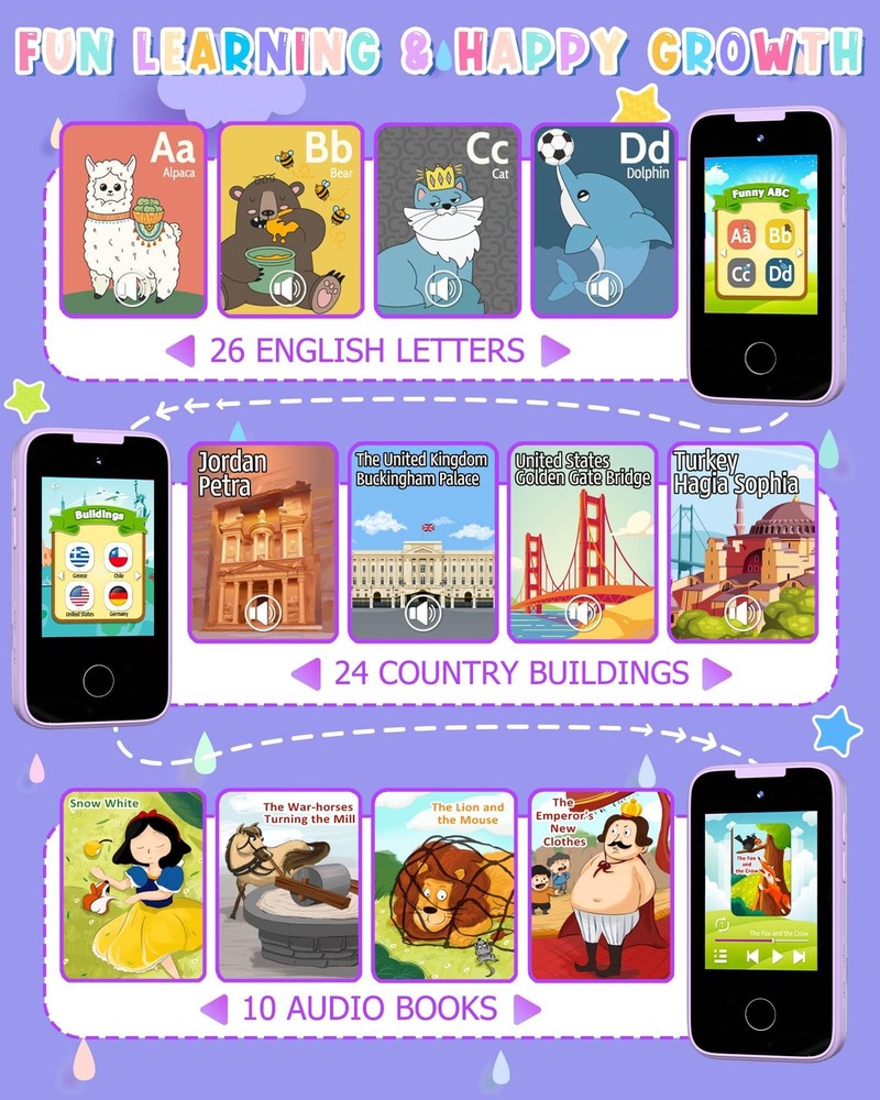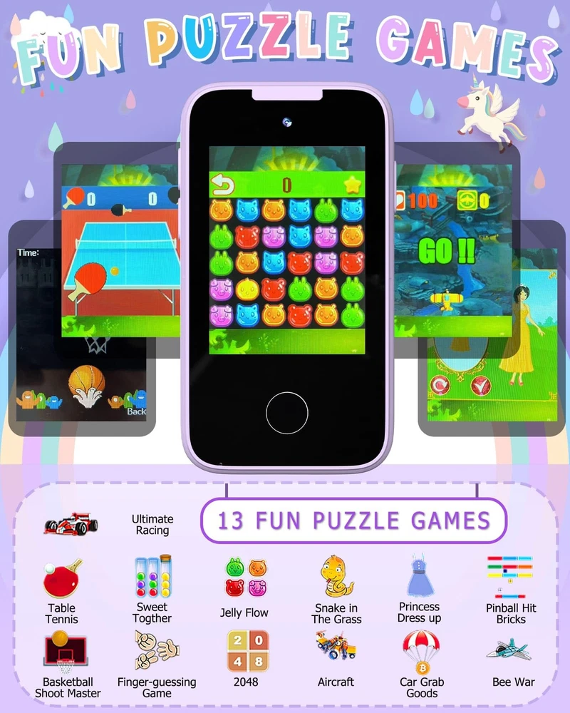 Package Includes: 1*Kids Smart 1*USB Type-C to USB-A Charger Cable 2.6FT 1*8G TF Card 1*Purple Lanyard 1*Manual 【ALL IN ONE KID'S SMART 】: With 23 entertainment, educational, and practical functions including games, drawing, music, taking photos, letter cards, habit tracking, audio books, calendars, etc., this smart cell meets all kids’ needs. School mode allows parents to control playtime. Kids can customize the from 31 wallpapers and 11 themes. 【FRONT AND REAR HD CAMERAS】: This toy smart features 8.5MP autofocus cameras on both front and back, allowing kids to capture exciting and unforgettable moments in high-quality images or videos.19 cartoon stickers add fun to taking photos, and an 8 GB memory card provides additional storage for photos and videos. 【IPS HD SCREEN & FULL-FREQUENCY SPEAKER】:The play features a 2.8” IPS HD screen that provides clear visuals and intuitive touch response, making it easy for kids to use. The upgraded full-frequency speaker delivers high-quality sound with adjustable volume. The 3.5mm jack offers private listening with earphones. 【DURABLE AND SAFE】:It includes a USB-C cable for charging, and the 600mAh battery can be fully charged in 2h, providing up to 5h of continuous use. This kid's smartphone is made of ABS safety material. The unicorn thick silicone case offers protection against drops. The lanyard allows for easy carrying and helps prevent loss. 【PERFECT GIFTS】- The mini size(4.3×2.3×0.5In) of the is perfect for little hands, and the rich functions keep kids entertained without having to give up your own . This non-internet-connected fake is the ideal gift for girls aged 3-8 on birthdays, Christmas, parties, and more.