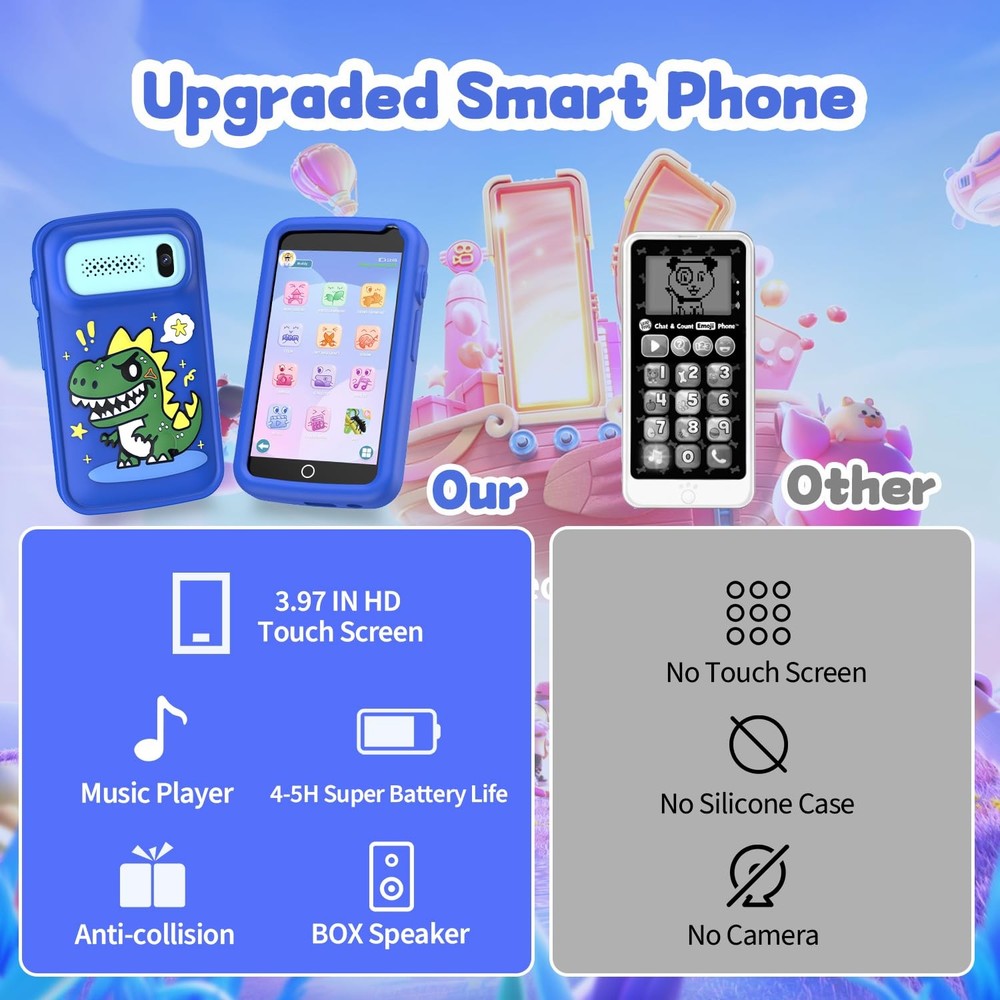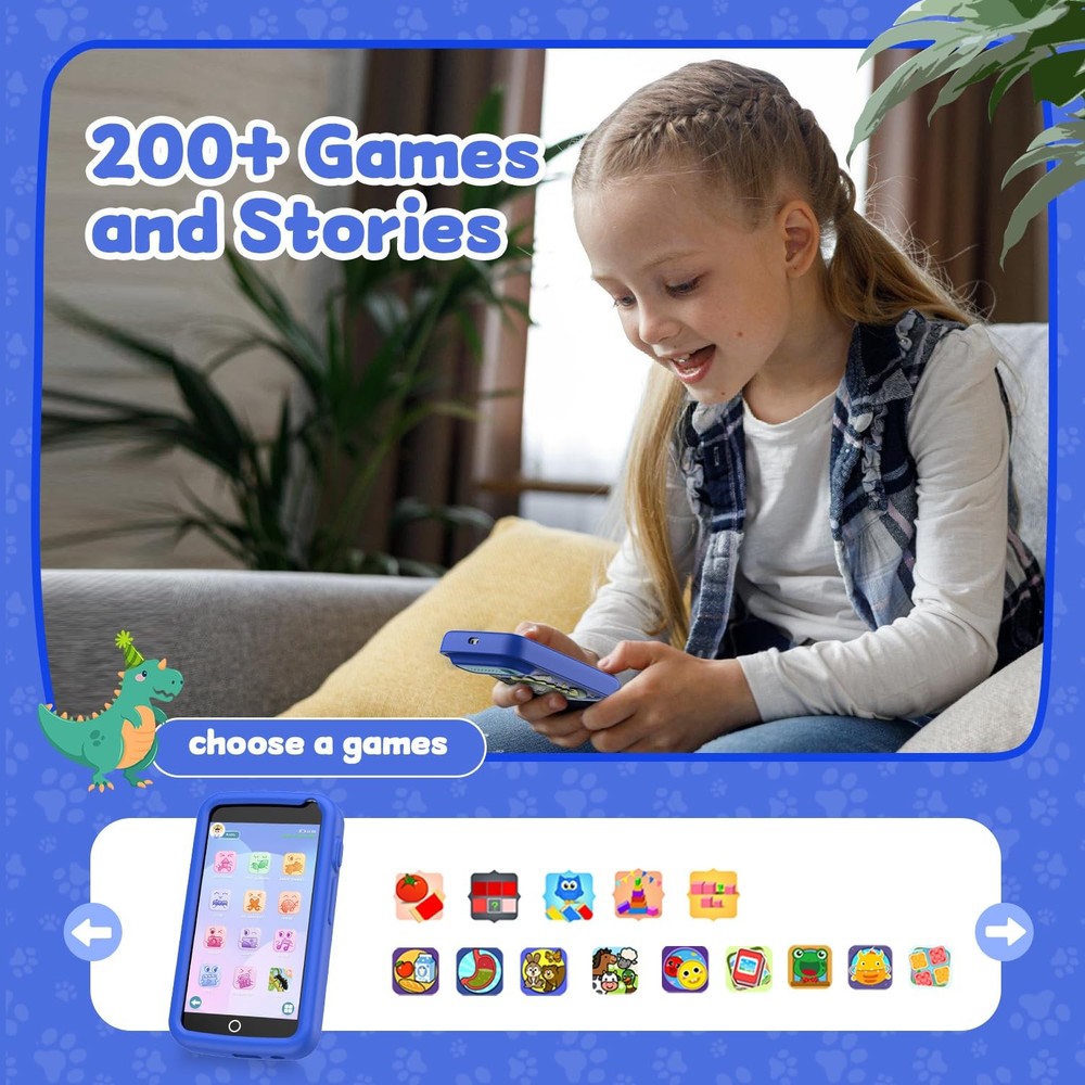 Features: Kids Smart Realistic Cell Phone ToyThe smartphone toy for kids is equipped with a 3.97-inch high-definition touch screen, and the larger screen allows children to experience the true fun of smartphones. Without the need for a SIM card (unable to make phone calls or send text messages). The kids can take photos and videos, listen to music and stories, and play games, satisfying their desire for exploration. 200+Fun Puzzle GamesThe real cell phone toy is designed specifically for children, with over 200 puzzle games built-in to enhance their cognitive abilities. They can stimulate the brain, promote early education, and make learning enjoyable and interactive. The Gift That Children ExpectThe kids always hope to be treated like adults and have the same things as their parents, especially a phone. This kids toy phone is an ideal gift for children aged 3, 4, 5, 6, and 7. It is a great choice for birthdays, Children's Day, Valentine's Day, Easter, Thanksgiving, Christmas, and New Year. Built in 1500mAh rechargeable battery, which can provide 5-6 hours of daily use for children. Education Meets EntertainmentThis kid phone provides ABC learning modules, with each letter having phonetic pronunciation and animal names, making learning both interactive and fun. 24 landmark buildings from different countries enrich children's horizons. At the same time, parents can guide their children to use electronic products correctly by playing with toy phones. Parent child interaction not only increases the fun of interaction between children and toy phones, but also deepens the relationship between parents and children. Portable for Kids Travel ActivityThis lightweight and durable kid smart phone is perfect for use in cars, airplanes, restaurants, or parties, making it easy for children to play while on the go. When camping without internet, it is also a popular toy that can keep children's hands busy. Both boys and girls can use it to play games, listen to music, and take photos with friends during their travels. Safe Kids Toy PhoneThis toy phone is non-toxic, BPA free, and radiation free, safe and reliable, suitable for children aged 3-12 who enjoy playing with their phones. and do not require WiFi. Our kids phone toys have undergone countless tests to ensure compliance with CPC and CPSIA regulatory standards.